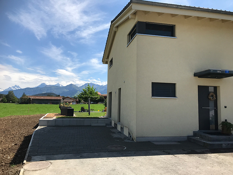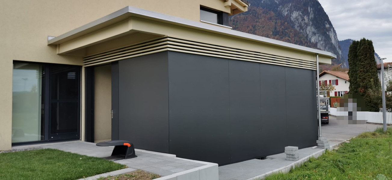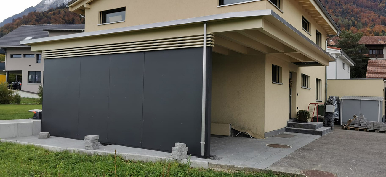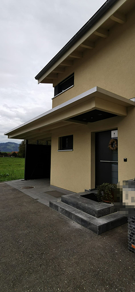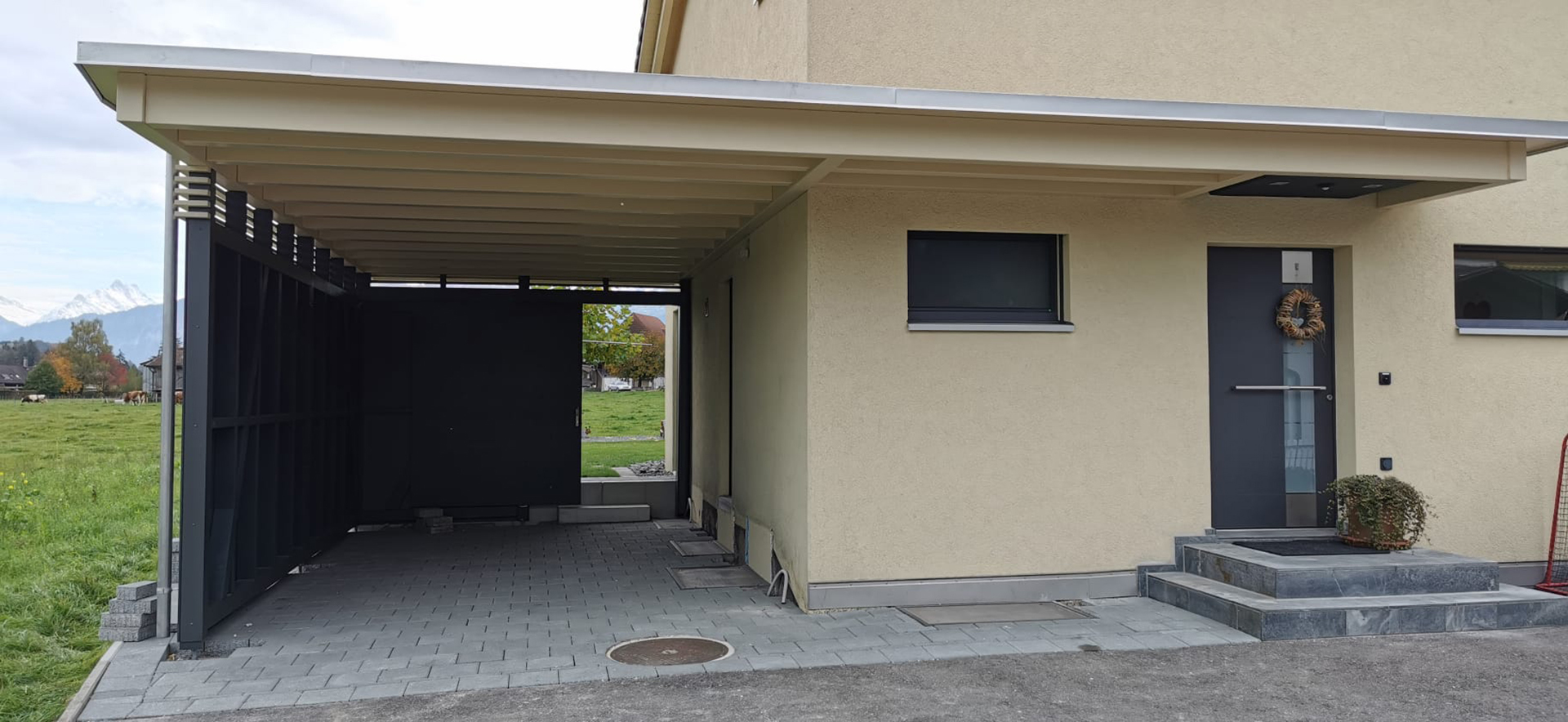 Carport mit Eingangsvordach eindeckung mit Kiesklebedach. Wandbefestigung mit Dosteba-Elementen. Wandverkleidung mit Vollkernplatten und Lattenlichtband. Nr.C84