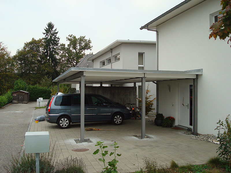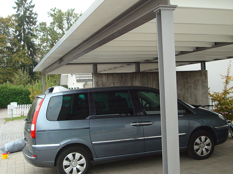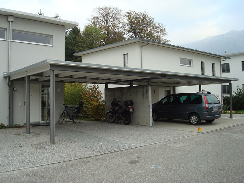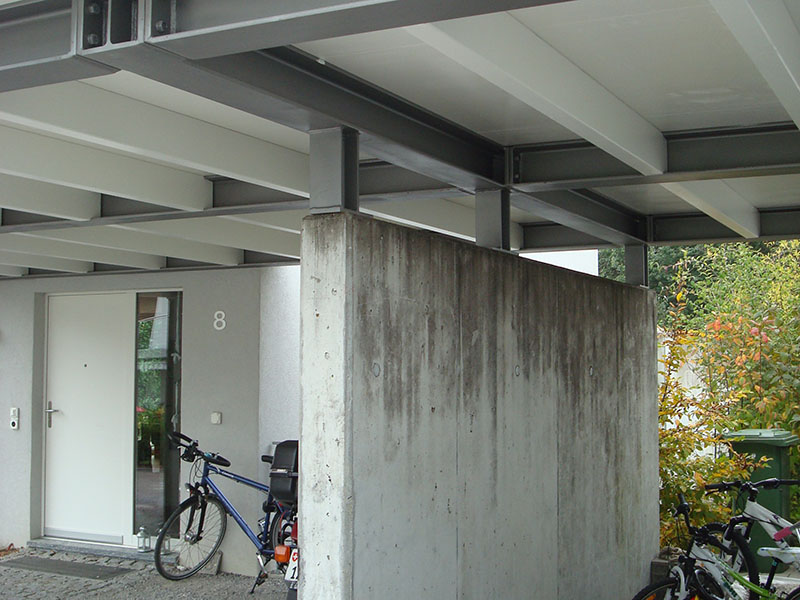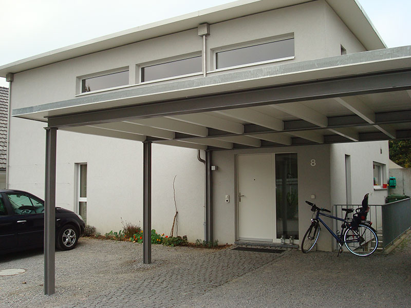 Carport mit Kiesklebedach und einer Holz-Stahl Konstruktion für grosse Spannweiten. Nr.C6