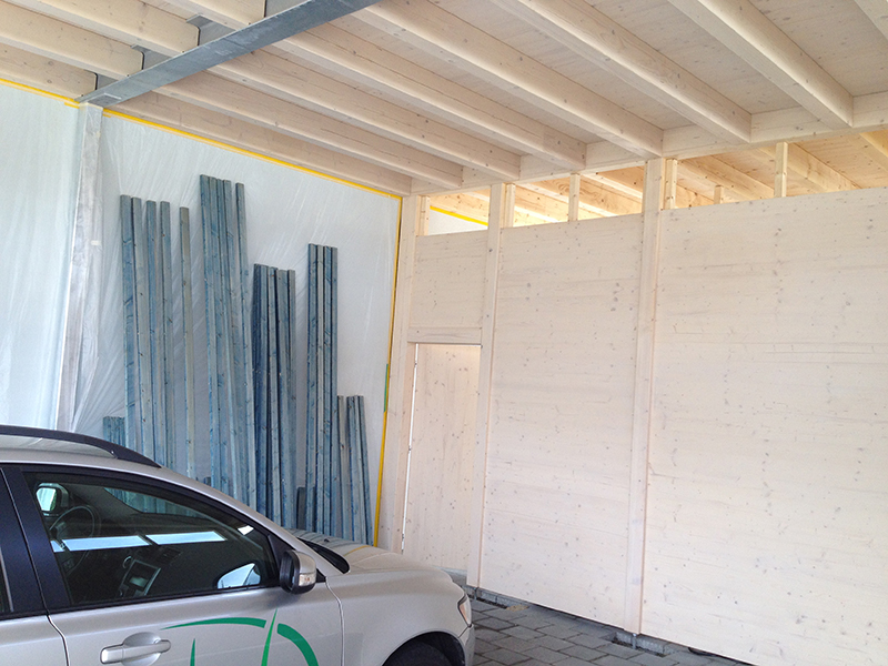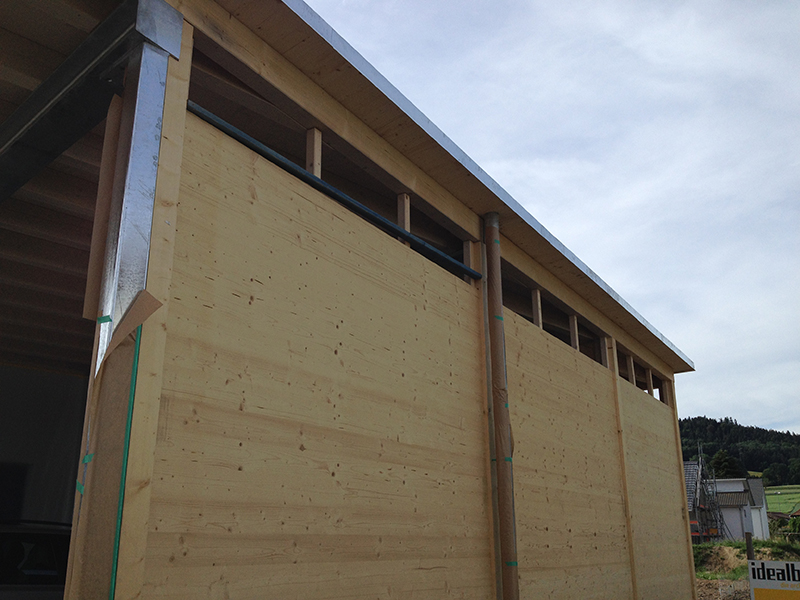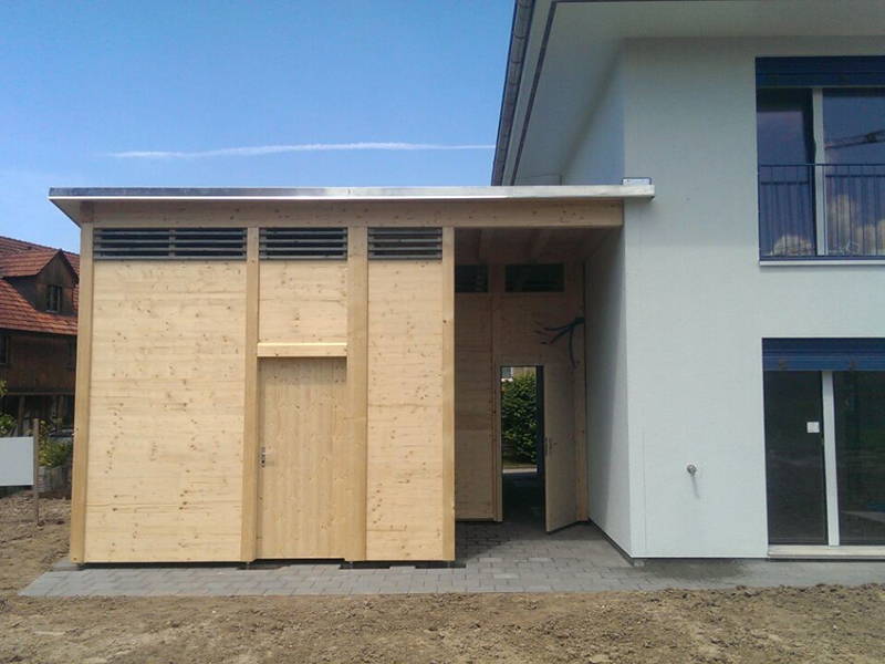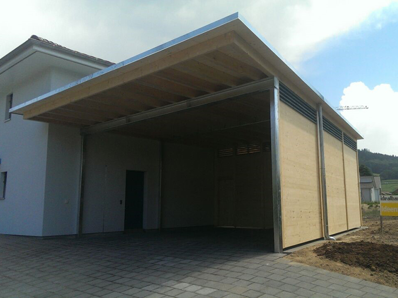 Carport in Holz-Stahlkonstruktion mit Kiesklebedach für Wohnmobile. Wandverkleidung aus 3-Schichtplatten und Lattenlichtband.Nr.C14