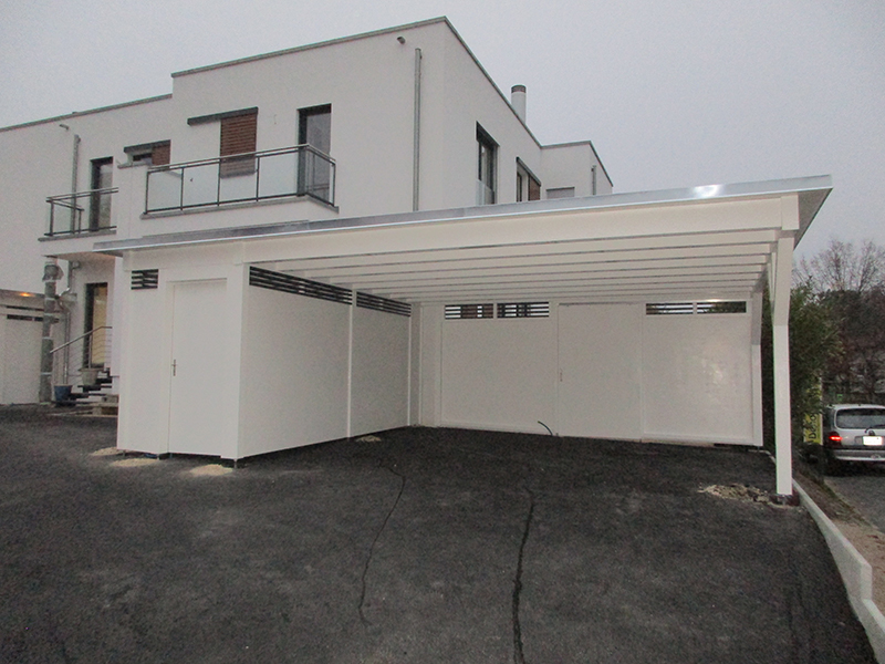 Carport mit Kiesklebedach und einer Wandverkleidung mit 3-Schichtplatten mit Lattenlichtband. Nr.C15