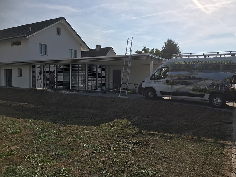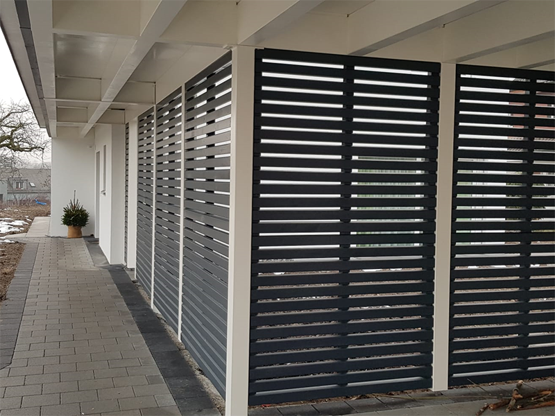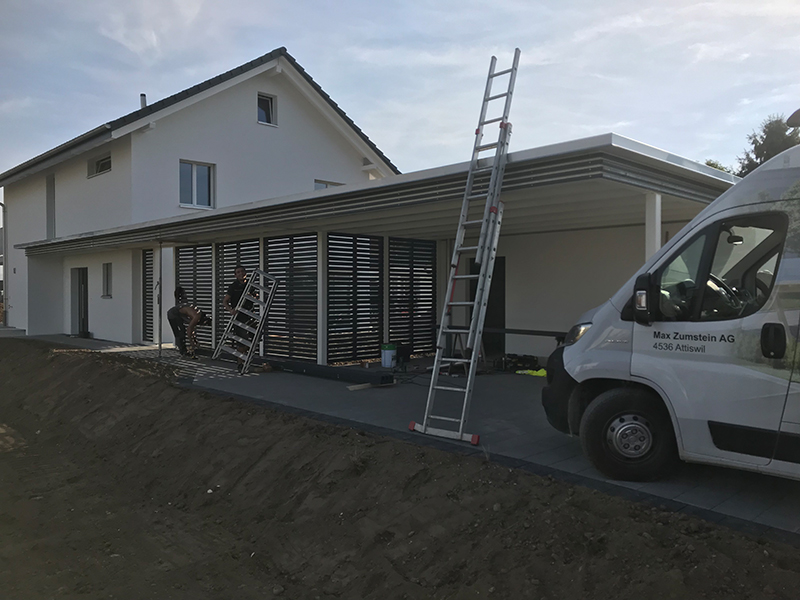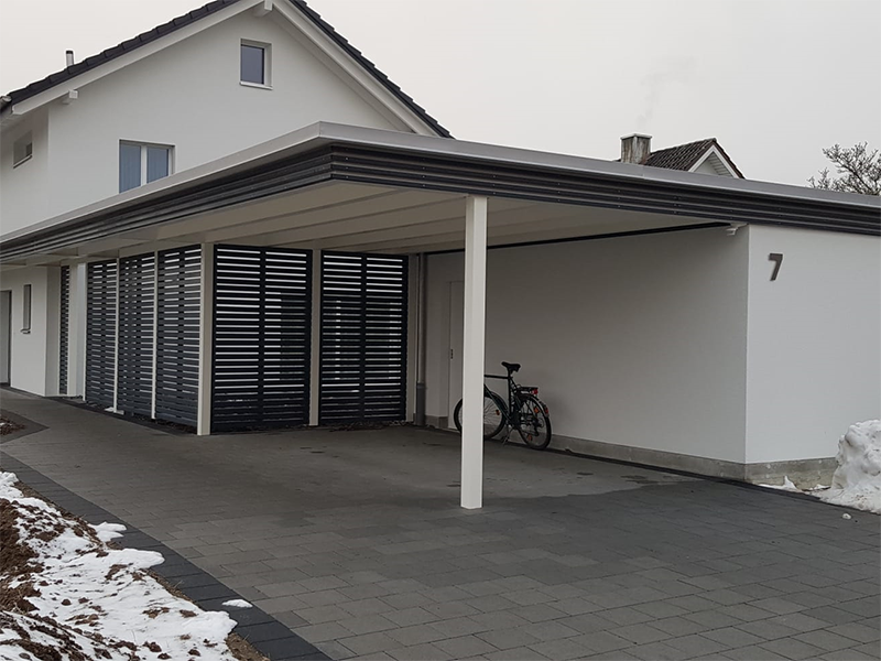 Carport mit Kiesklebedach über eine Bestehende Betongarage und als Erweiterung im Eingangsbereich. Trennwandverkleidung mit Lamellenschalung. Nr.C16
