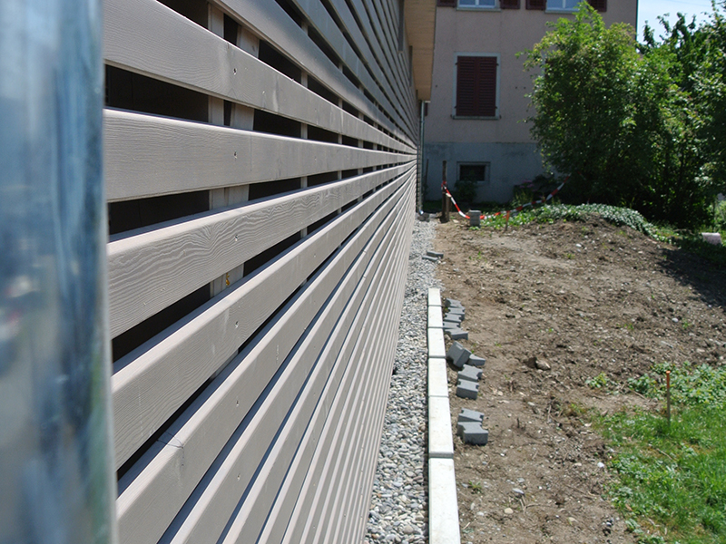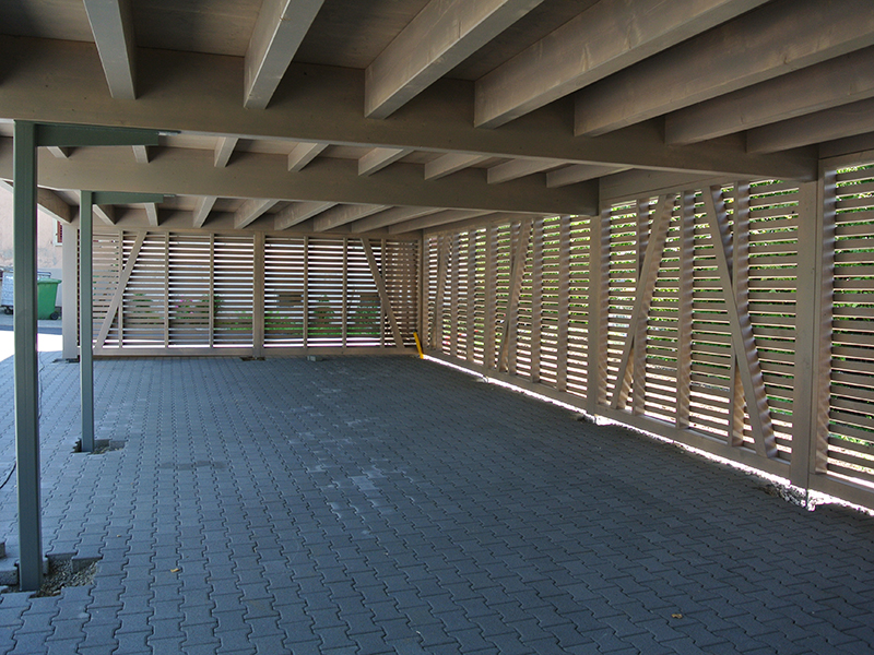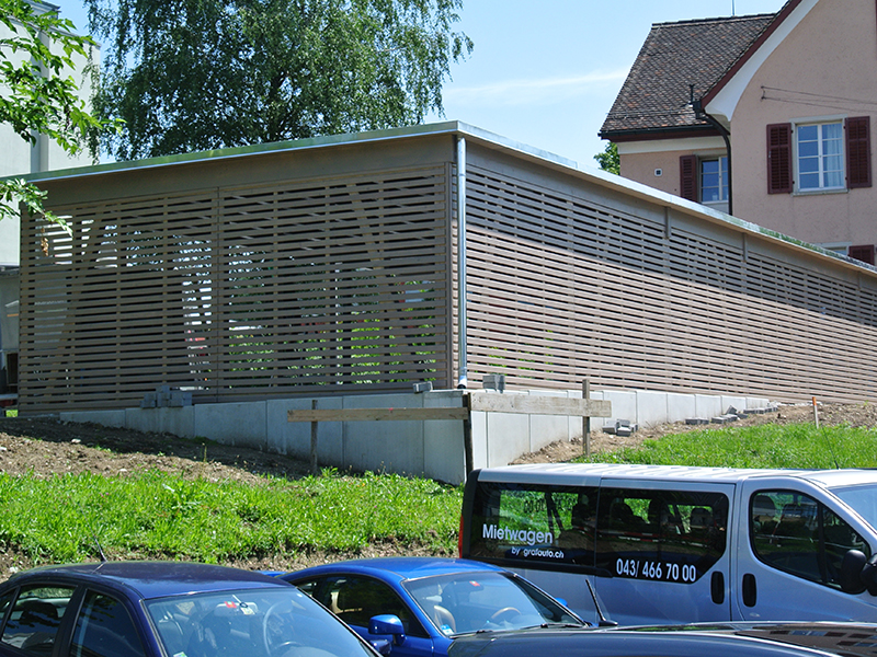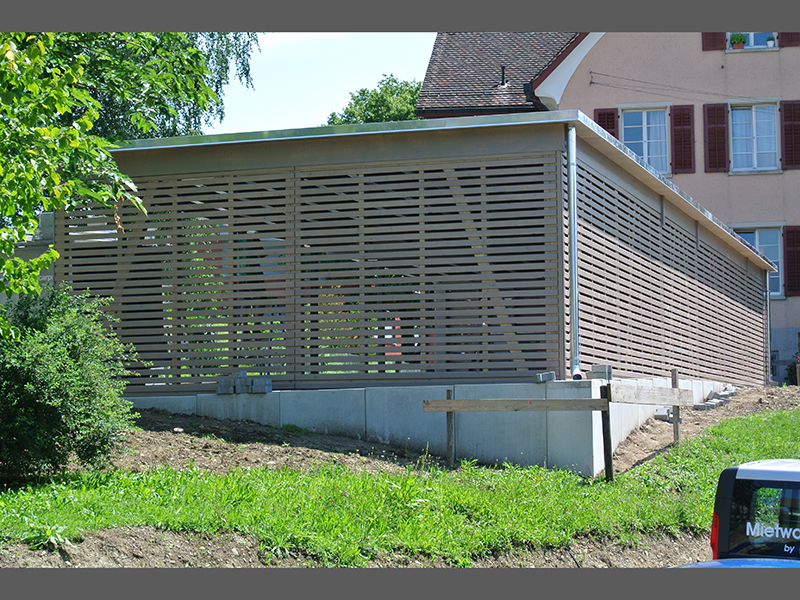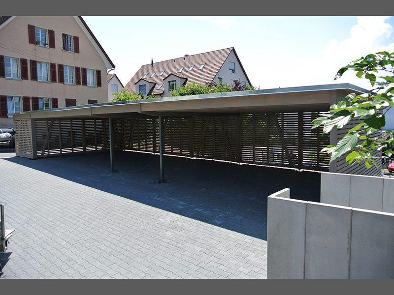 Carport mit Kiesklebedach und eingespannten Stahlstützen. Wandverkleidung mit Lärchenlamellenschalung. (Vorvergraut) Nr.C19