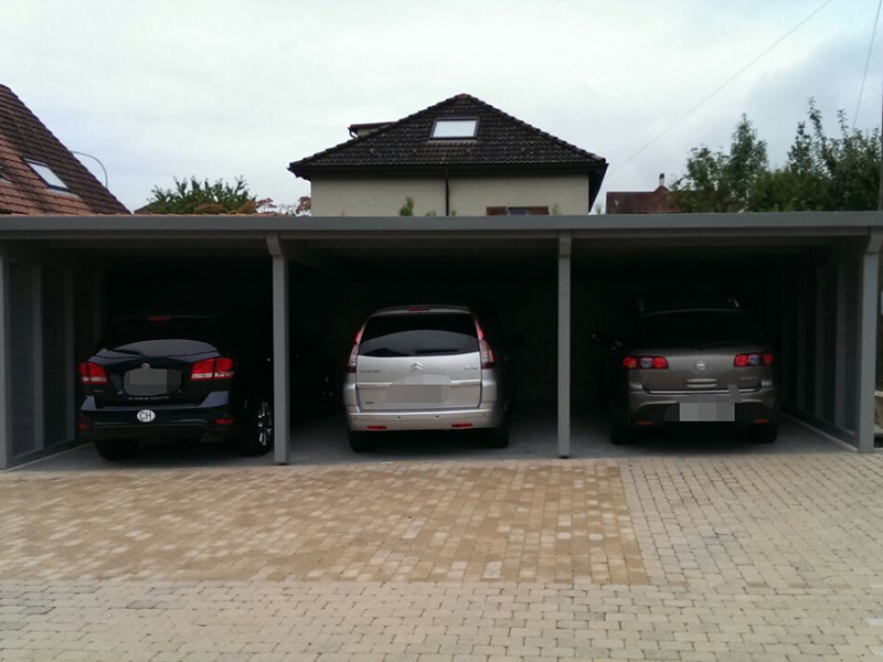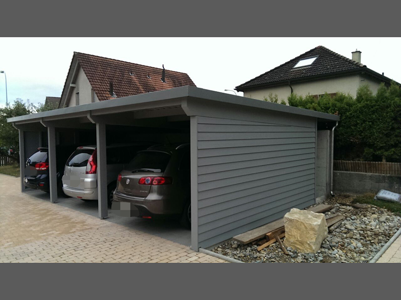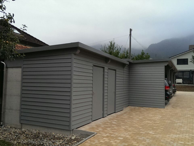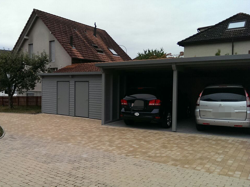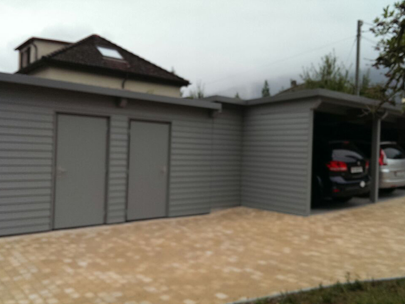 Carport und Geräteraum mit Profilblechdach und einer Wandverkleidung mit Stülpschalung. Nr.C22