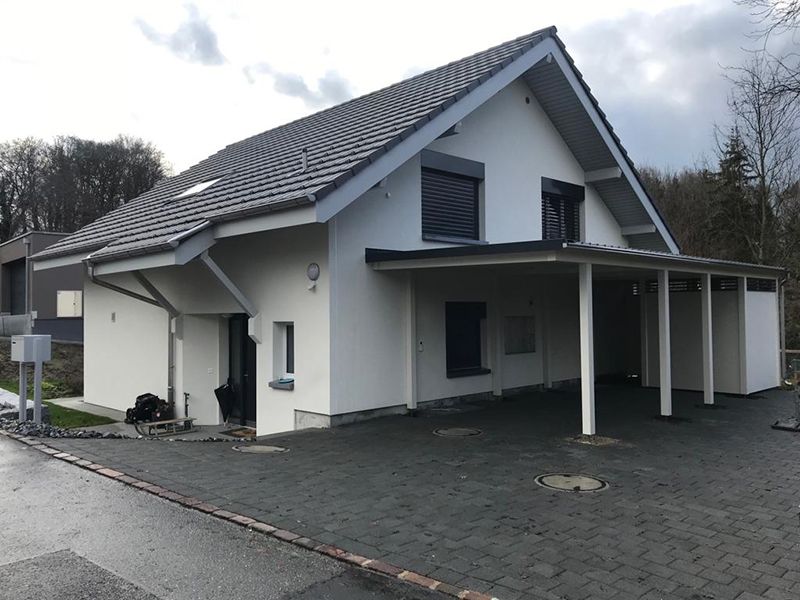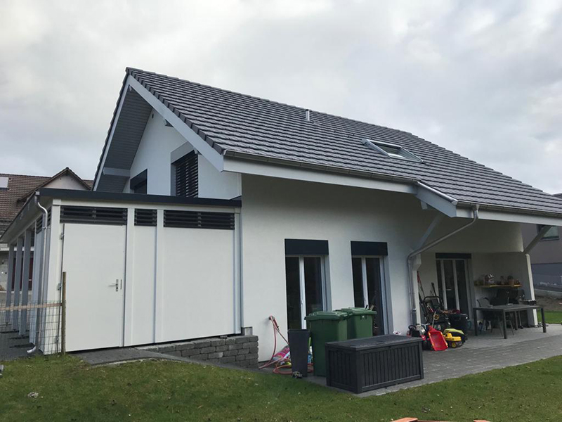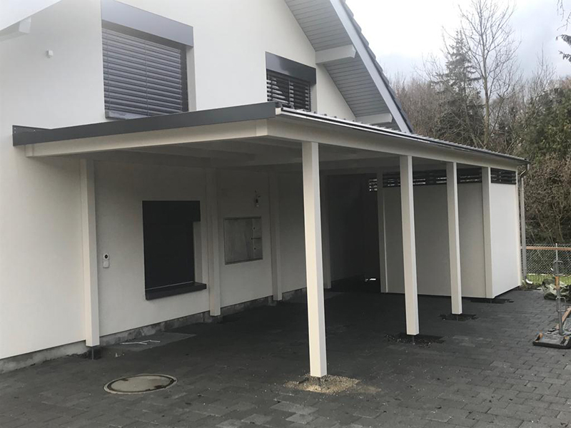 Carport und Geräteraum mit Profilblechdach. Wandverkleidung mit 3-Schichtplatten und Lattenlichtband. Nr.C24