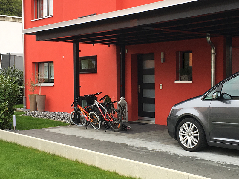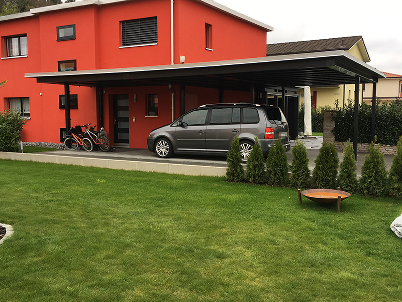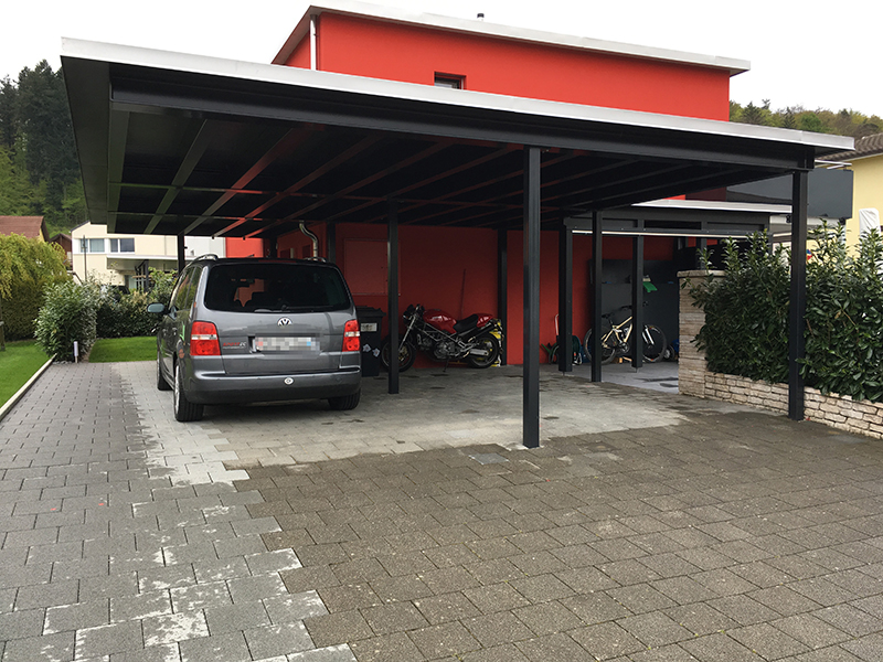 Carport mit Kiesklebedach in Holz-Stahlkonstruktion für die grosse Auskragung der Dachfläche. Nr.C32