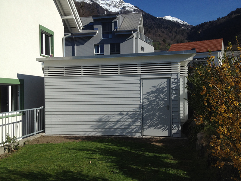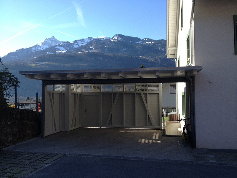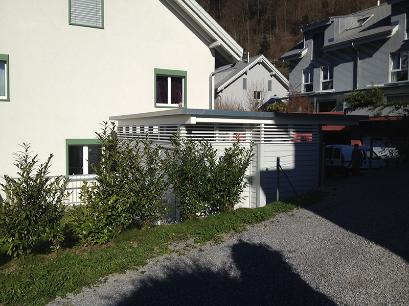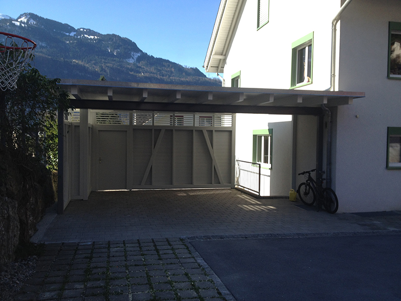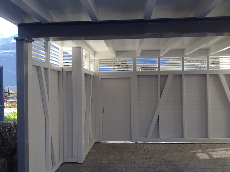 Carport mit Kiesklebedach in Holz-Stahlkonstruktion. Wandverkleidung mit Stülpschalung und Lattenlichtband. Nr.C38