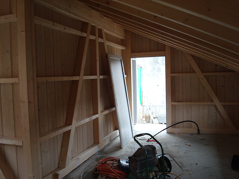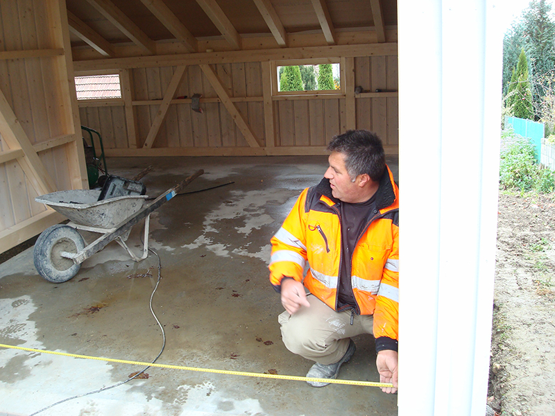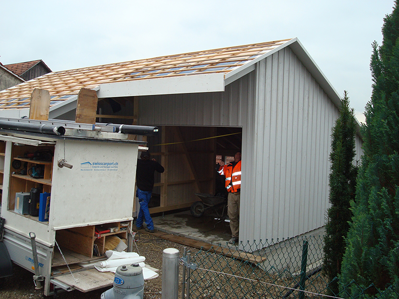Carport mit Steildach und Ziegeleindeckung. Wandverkleidung mit stehender T-Deckleistenschalung. Nr.C42