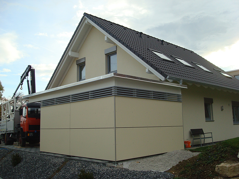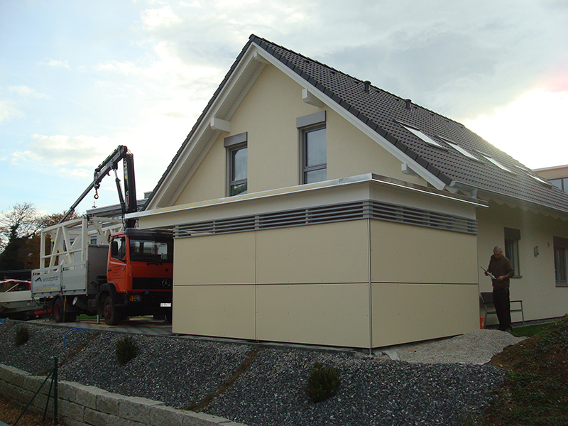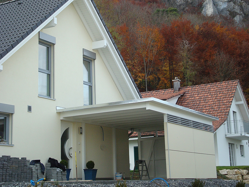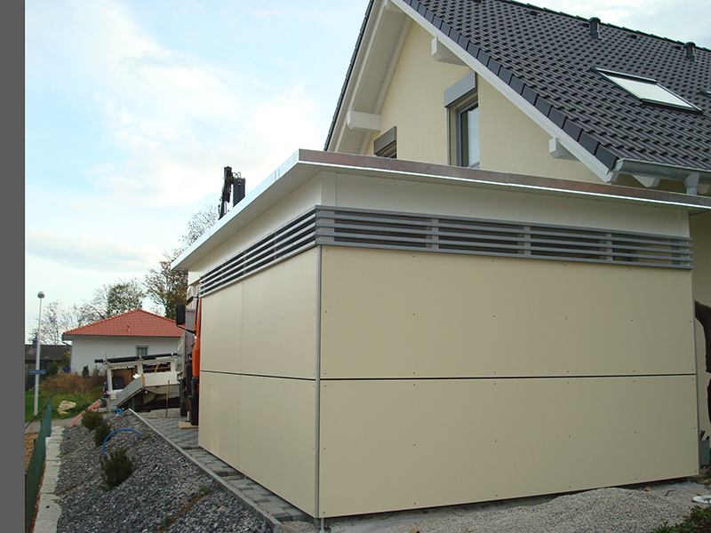 Carport mit Kiesklebedach. Wandverkleidung mit Eternitplatten und Lattenlichtband. Nr.C47