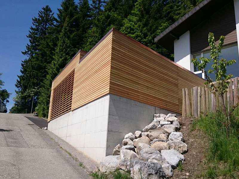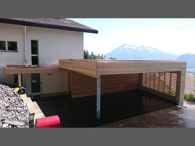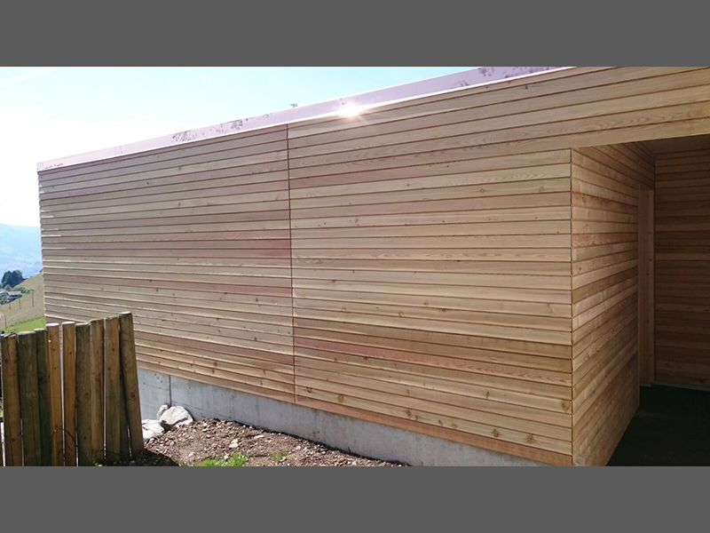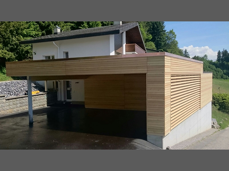 Carport mit Geräteraum zweistufig mit Kiesklebedach. Wandverkleidung mit Lärchenschalung geschlossen. (Unbehandelt) Nr.C52
