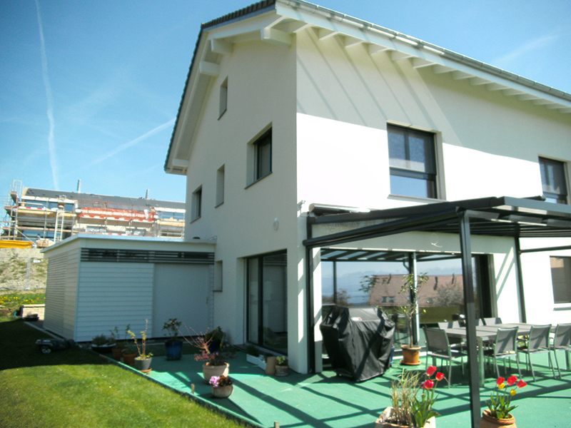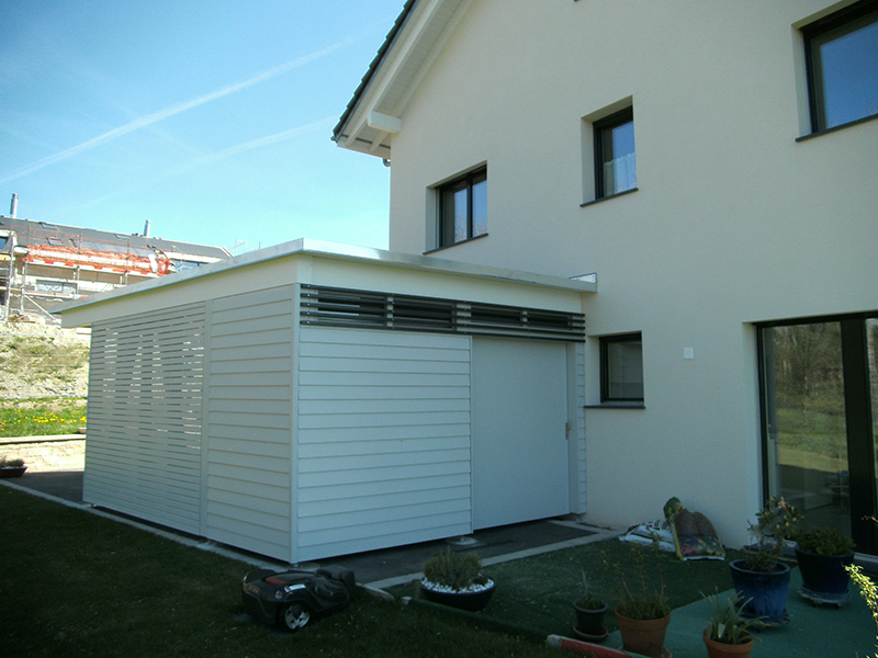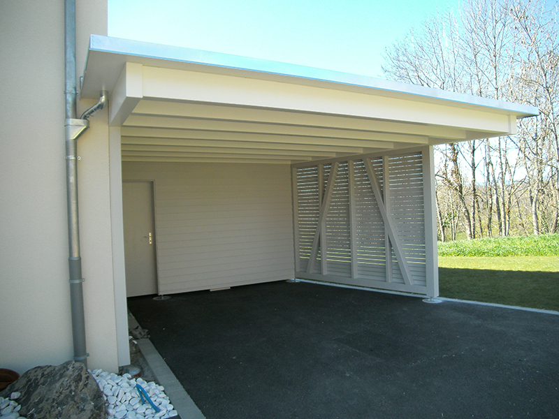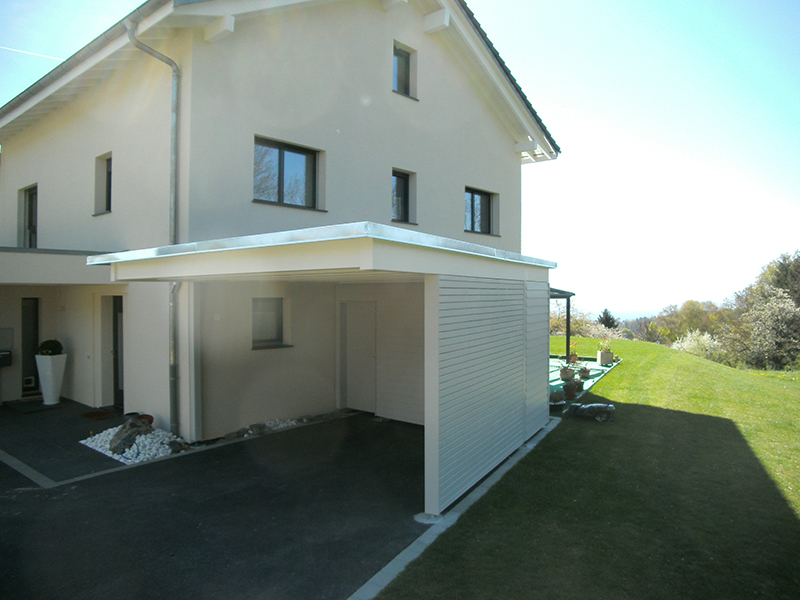 Carport mit Geräteraum und Kiesklebedach. Wandverkleidung mit Stülpschalung und Lattenlichtband. Einseitig mit Lamellenschalung offen. Nr.C54