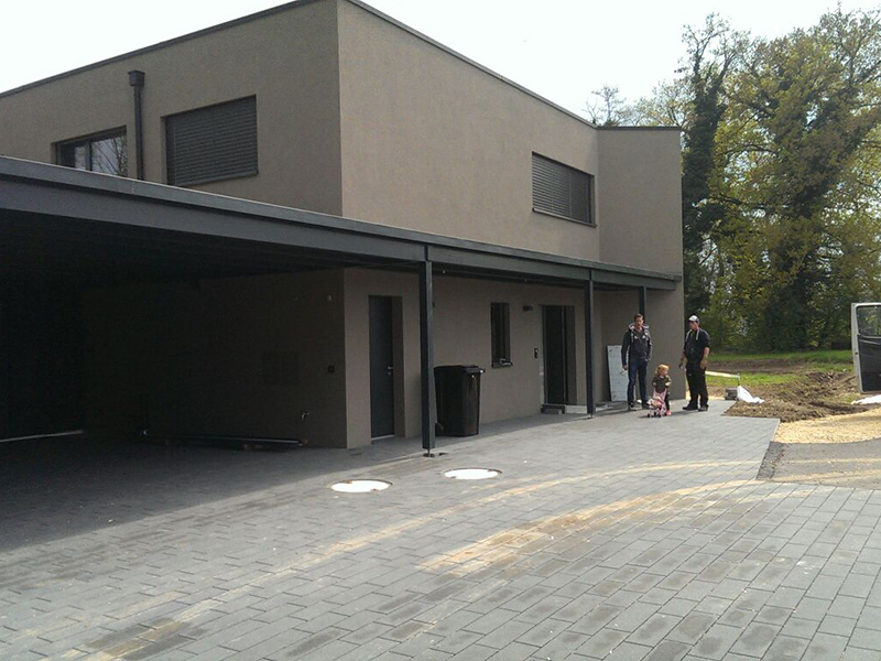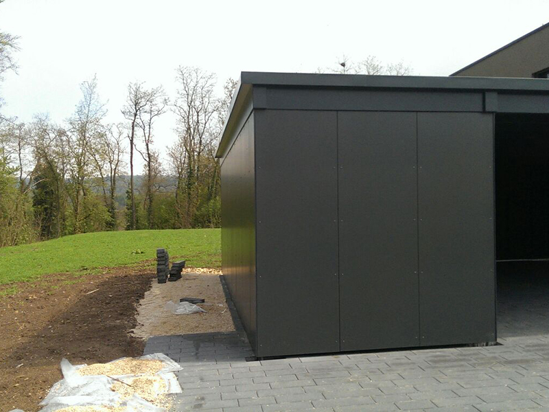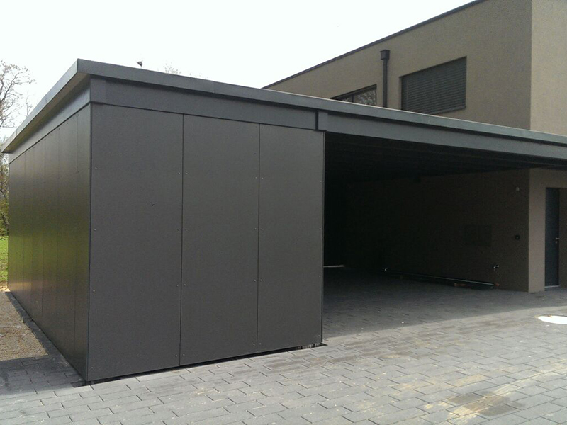 Carport mit Geräteraum und Extensiv-Dachbegrünung. Wandverkleidung mit Vollkernplatten. Nr.C58