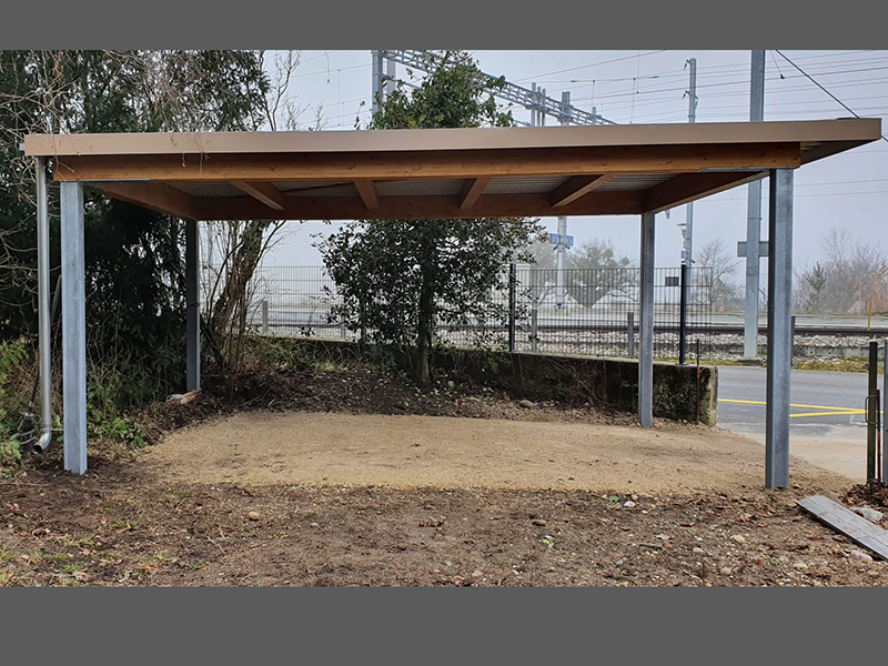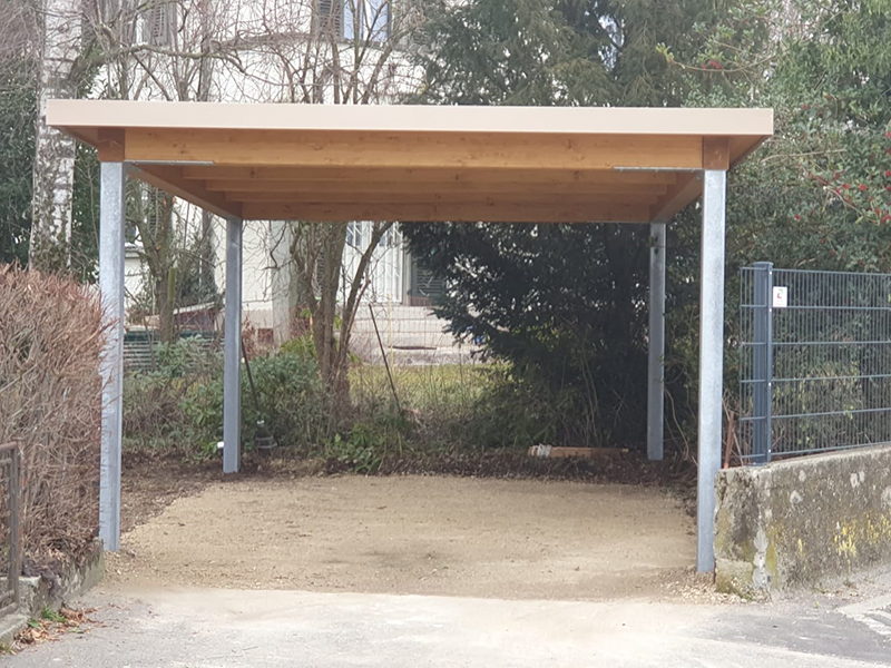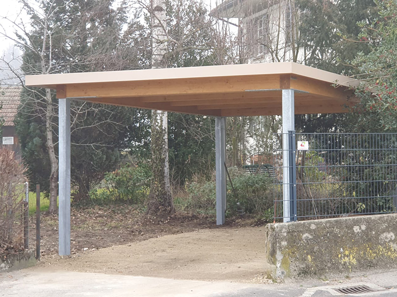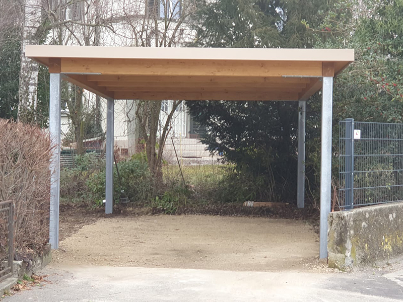 Carport mit Profilblechdach. Stahlstützen auf Schraubenfundamente mit Grossen Flanschen für die aussteifung.