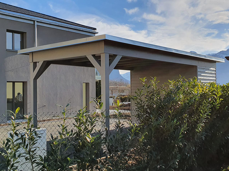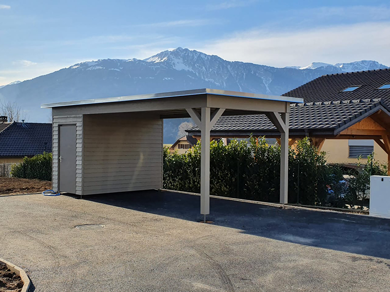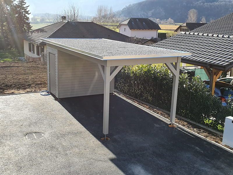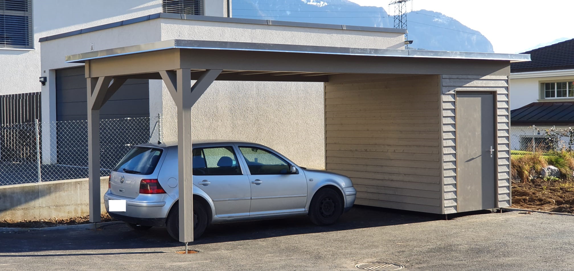 Carport mit Geräteraum und Kiesklebedach. Wandverkleidung mit Stülpschalung. Nr.C66