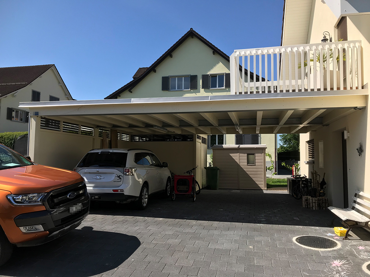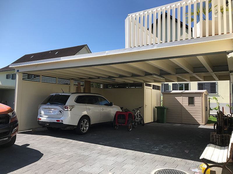 Carport, Geräteraum mit Terrassenbereich auf dem Kiesklebedach in Holz-Stahlkonstruktion. Wandverkleidung mit 3-Schichtplatten und Lichtlatten. Nr.C68