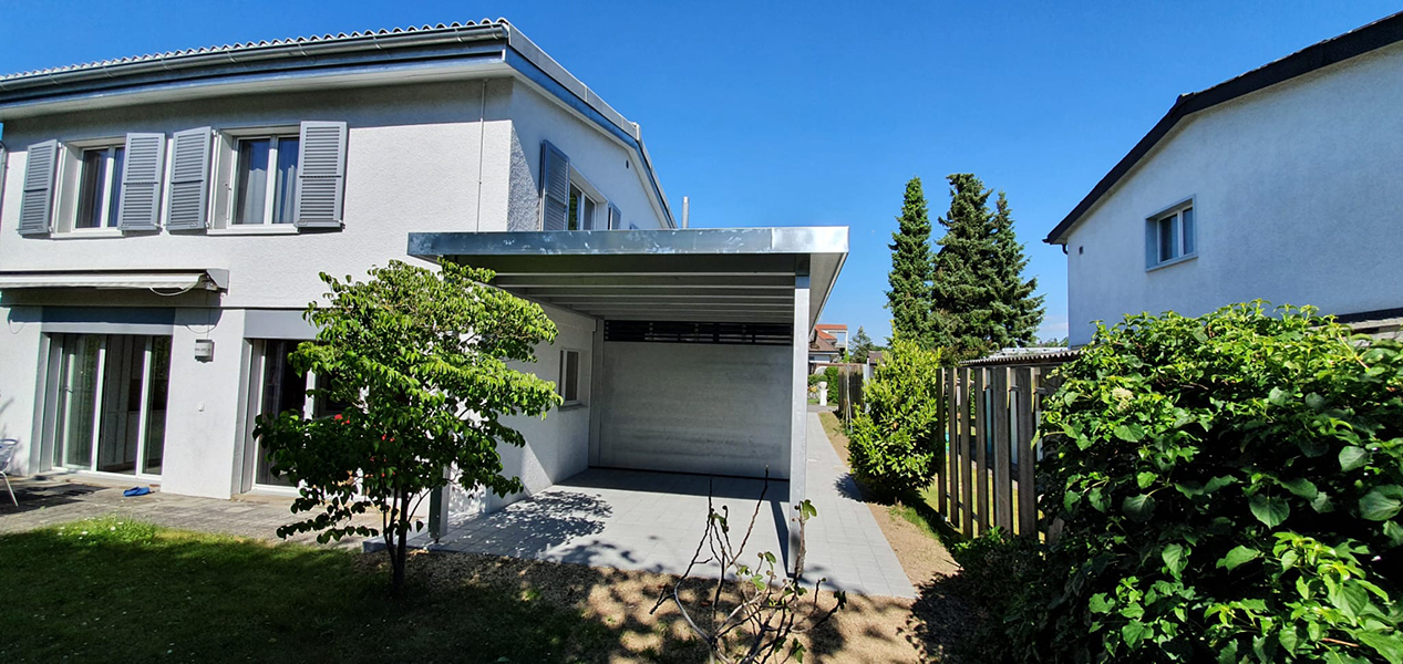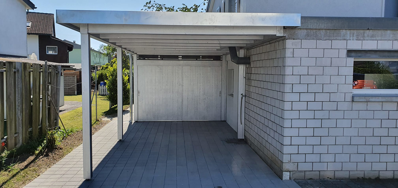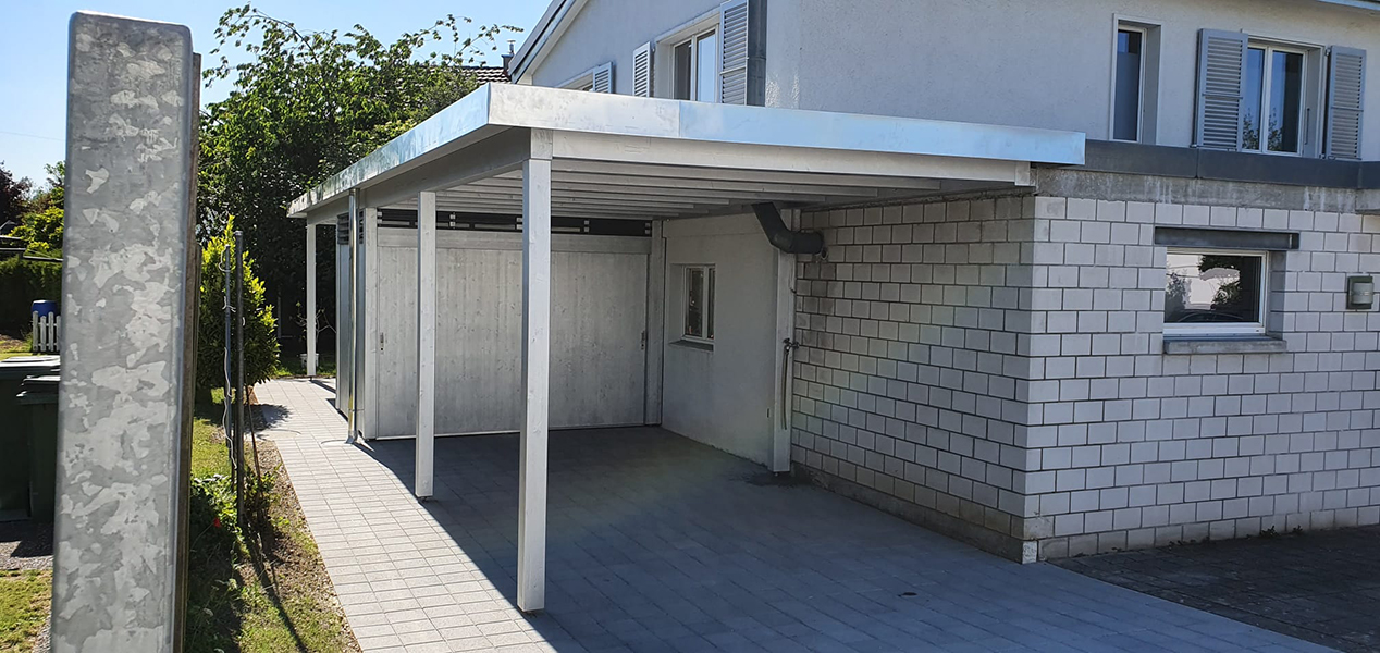 Carport, Sitzplatzüberdachung und Geräteraum mit Kiesklebedach. Wandverkleidung mit 3-Schichtplatten und Lichtlatten. Nr.C70