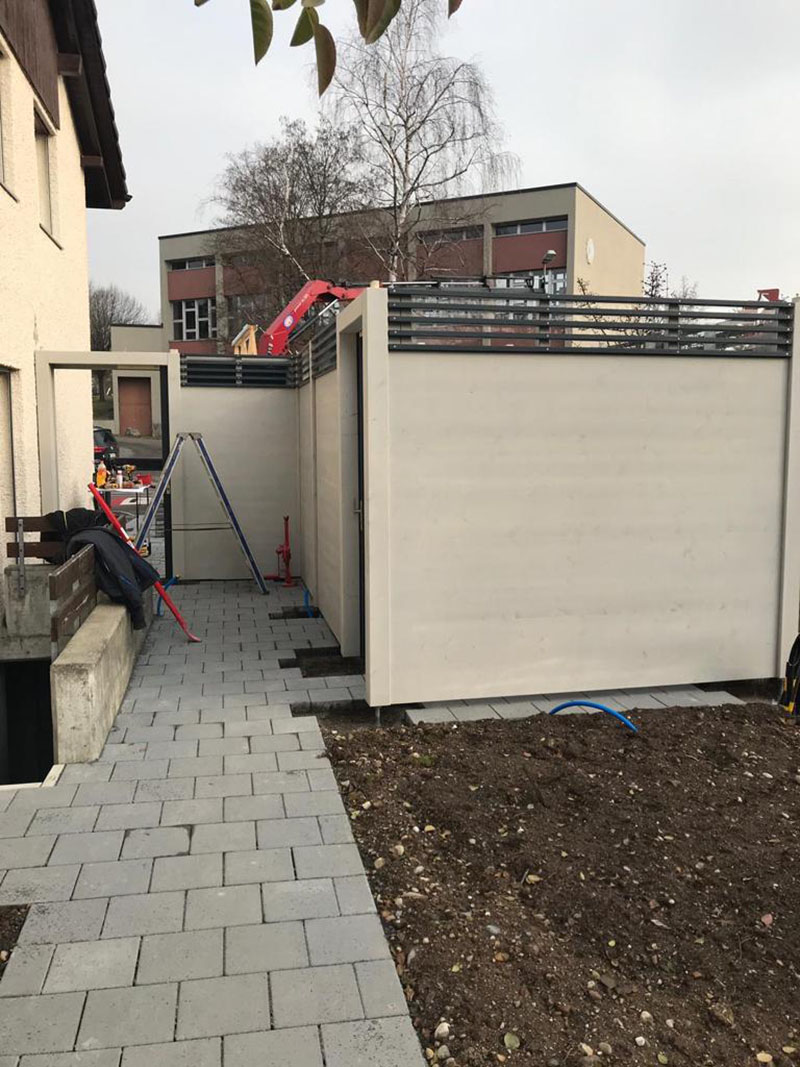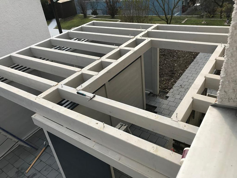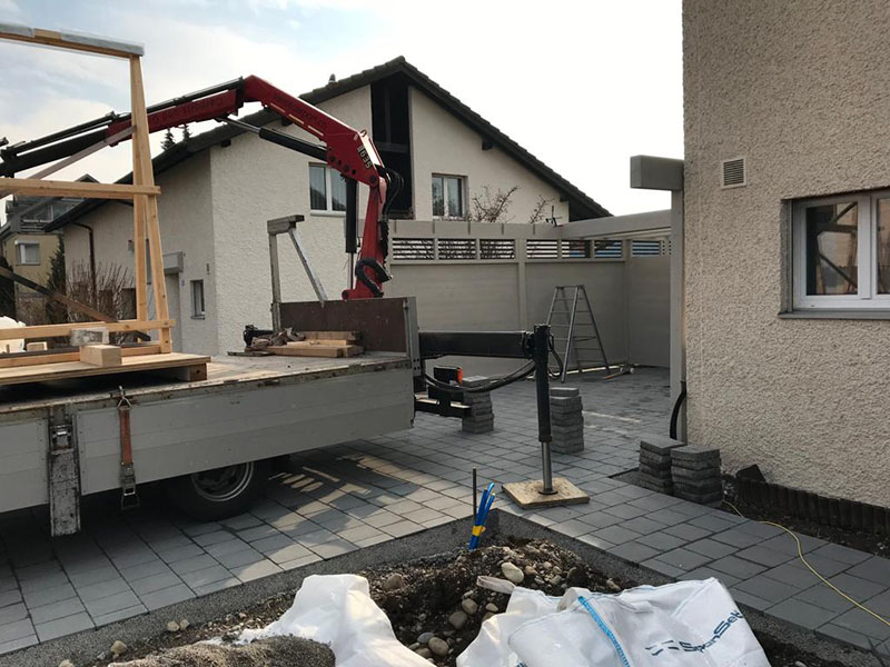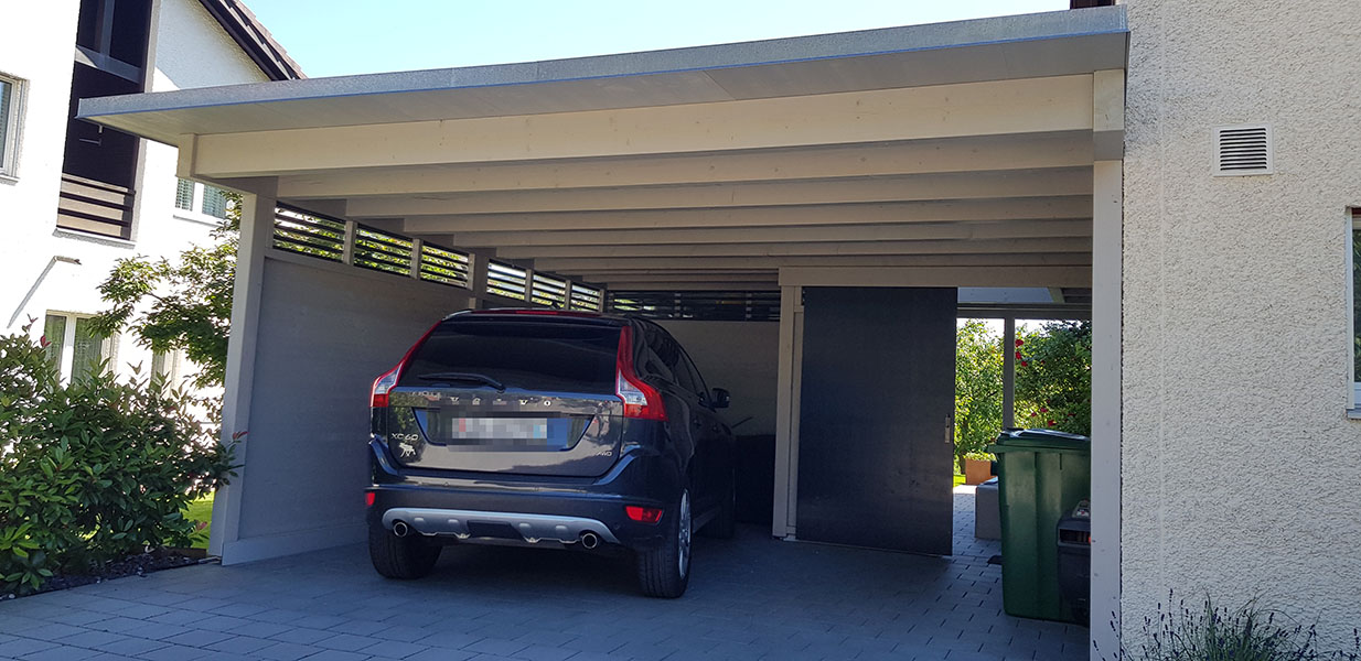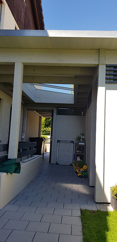Carport mit Geräteraum und Kiesklebedach. Wandaufbau mit 3-Schichtplatten und Lattenlichtband. Nr.C75