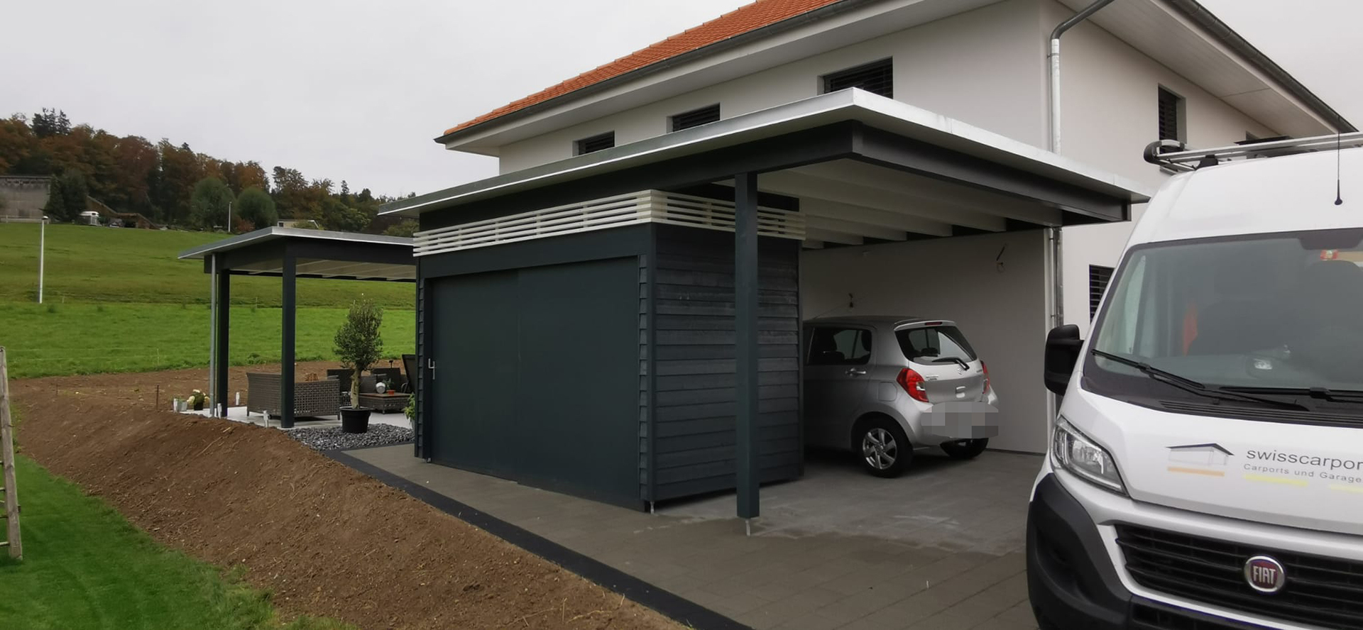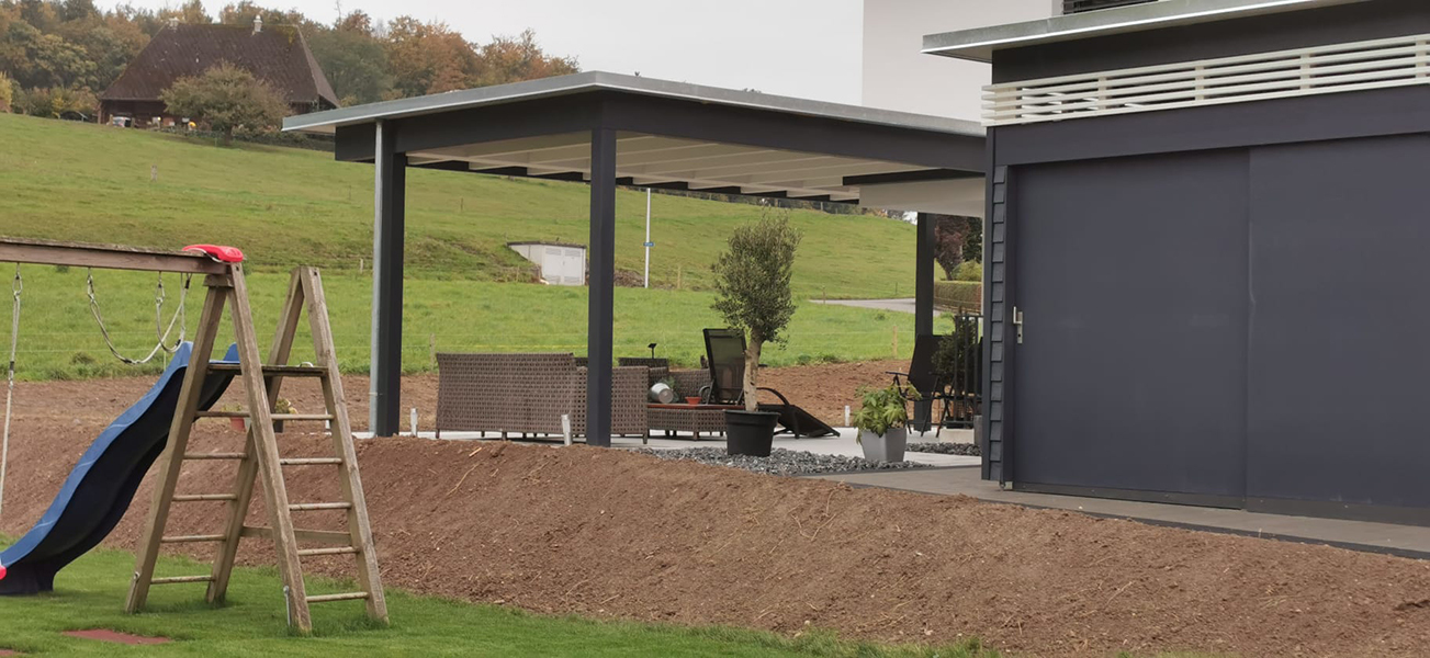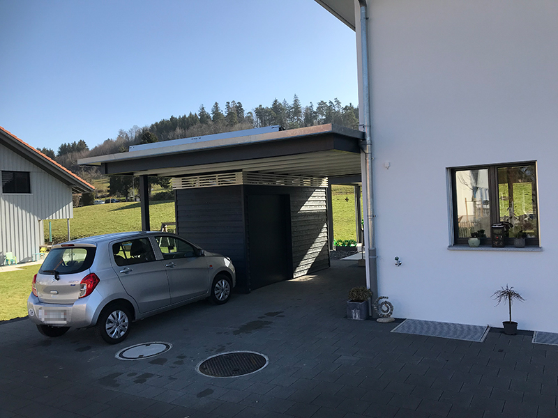 Carport mit Kiesklebedach. Sitzplatzüberdachung mit Kiesklebedach. Geräteraum mit Stülpschalung und Doppelschiebetüre. Nr.C80
