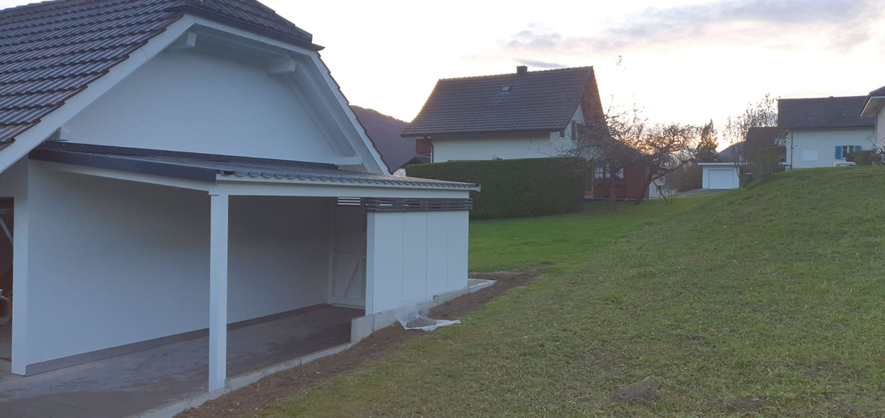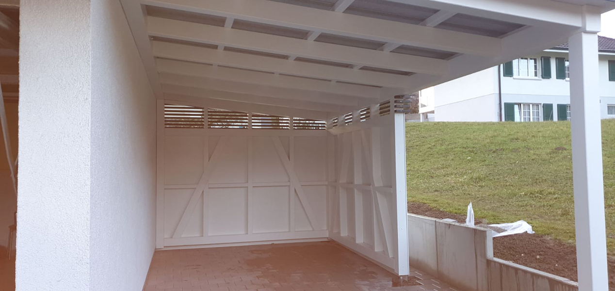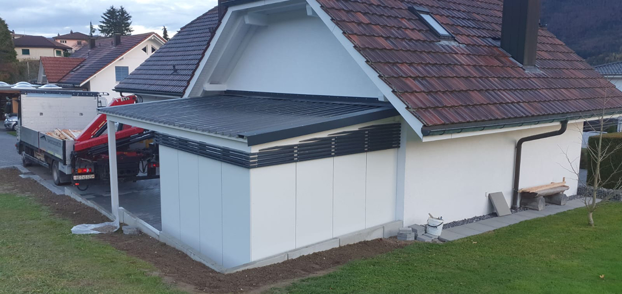 Carport mit Profilblechdach ohne Regenrinne. Seitenwände mit Vollkernplatten und Lattenlichtband. Nr.C81