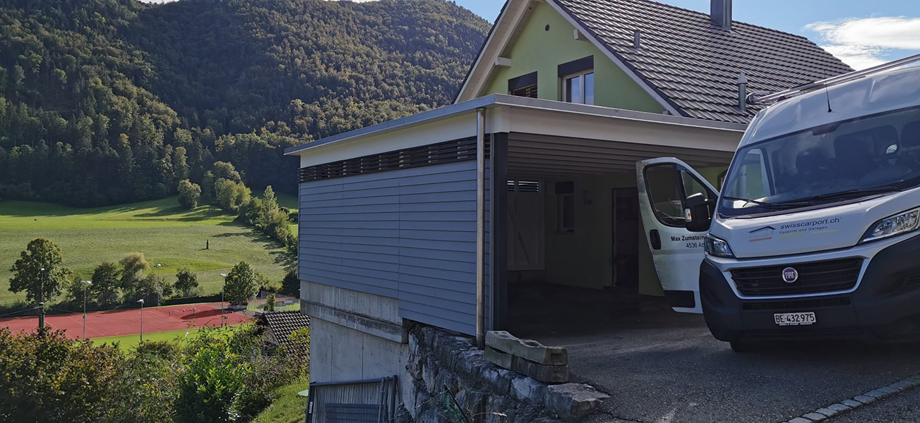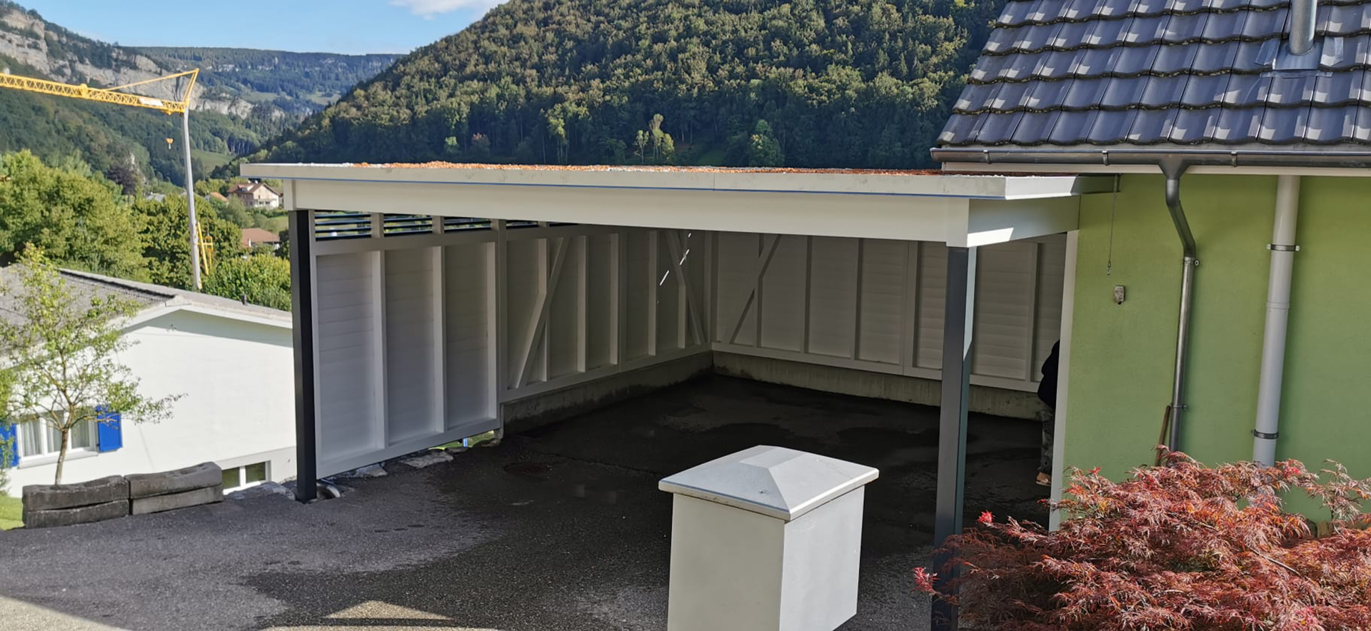 Carport mit Dachbegrünung und Abschlussblech in Chromstahl. Wandverkleidung mit Stülpschalung und Lattenlichtband. Nr.C82