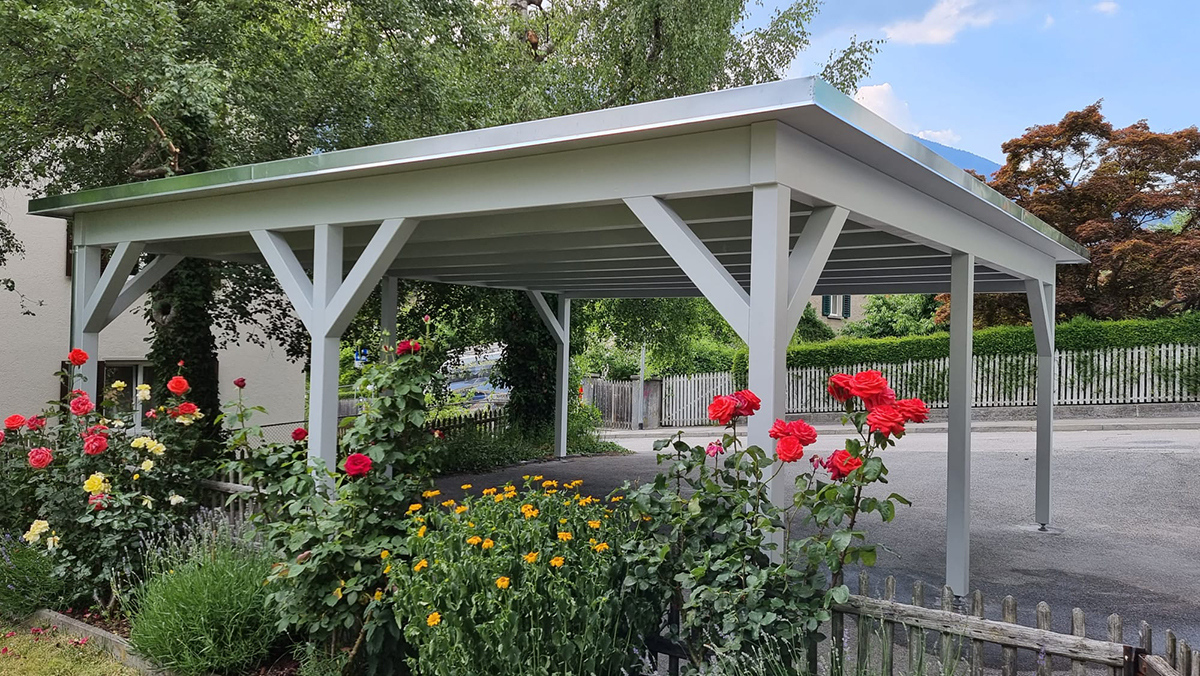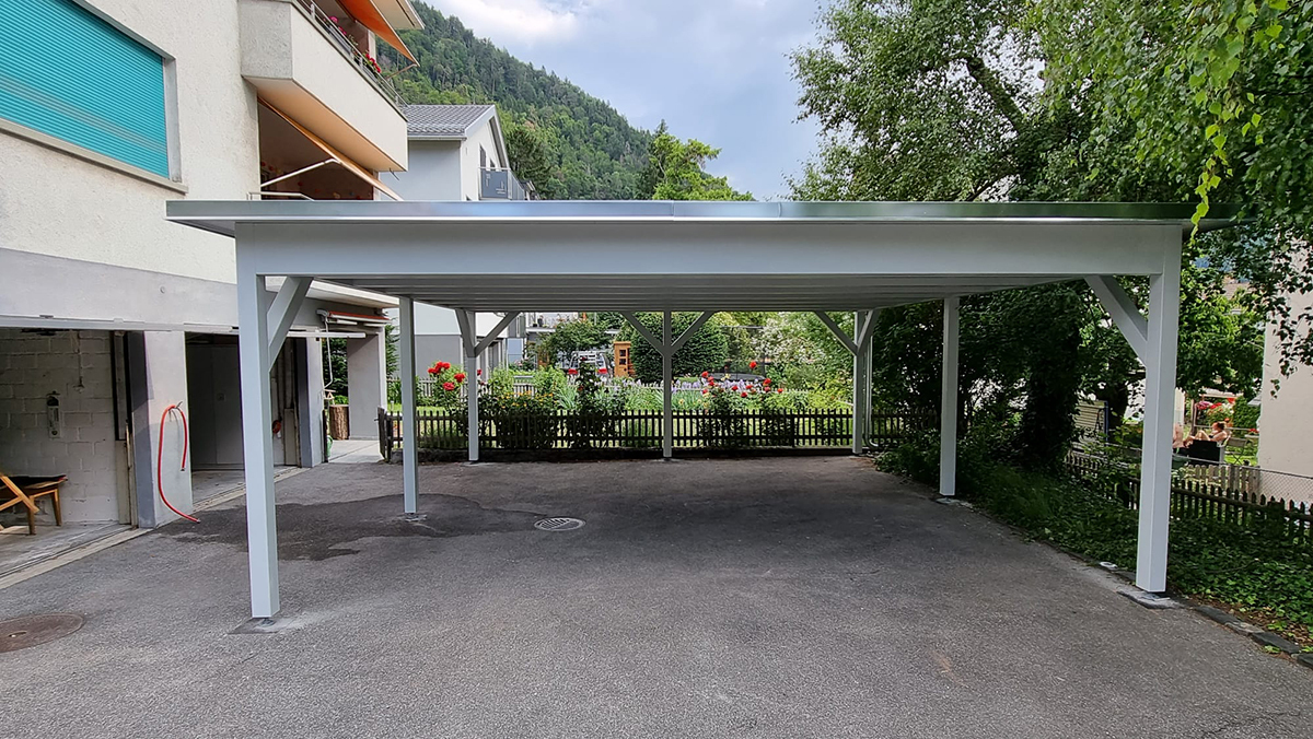 Doppelcarport mit Kiesklebedach. Premium Farbbehandlung. Abschlussbleche in Chromstahl. Nr.C92