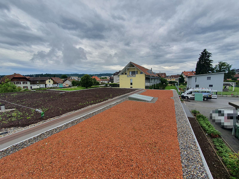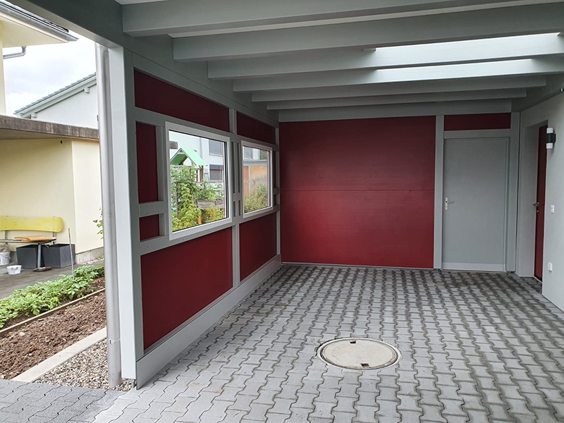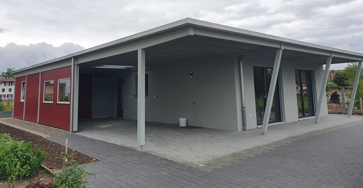 Carport, Geräteraum und Eingangsvordach in einem. Dach mit Extensiv-Begrünung und Abschlussblech in Chromstahl. Dach mit Oblicht mit Echtglas. Nr.C92