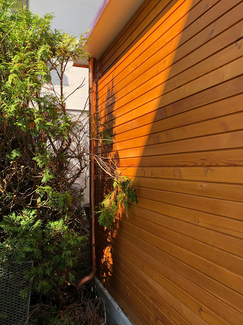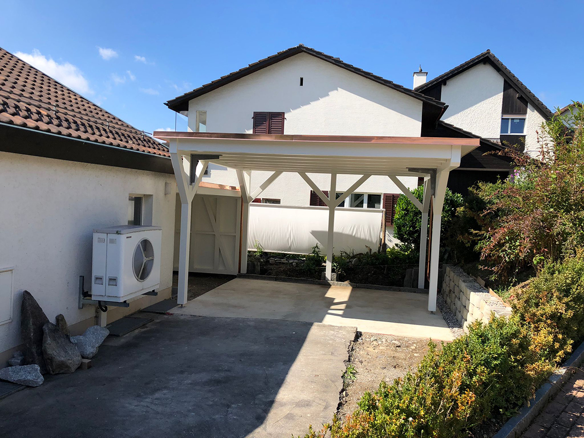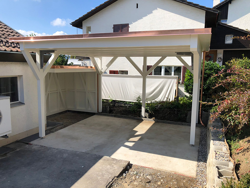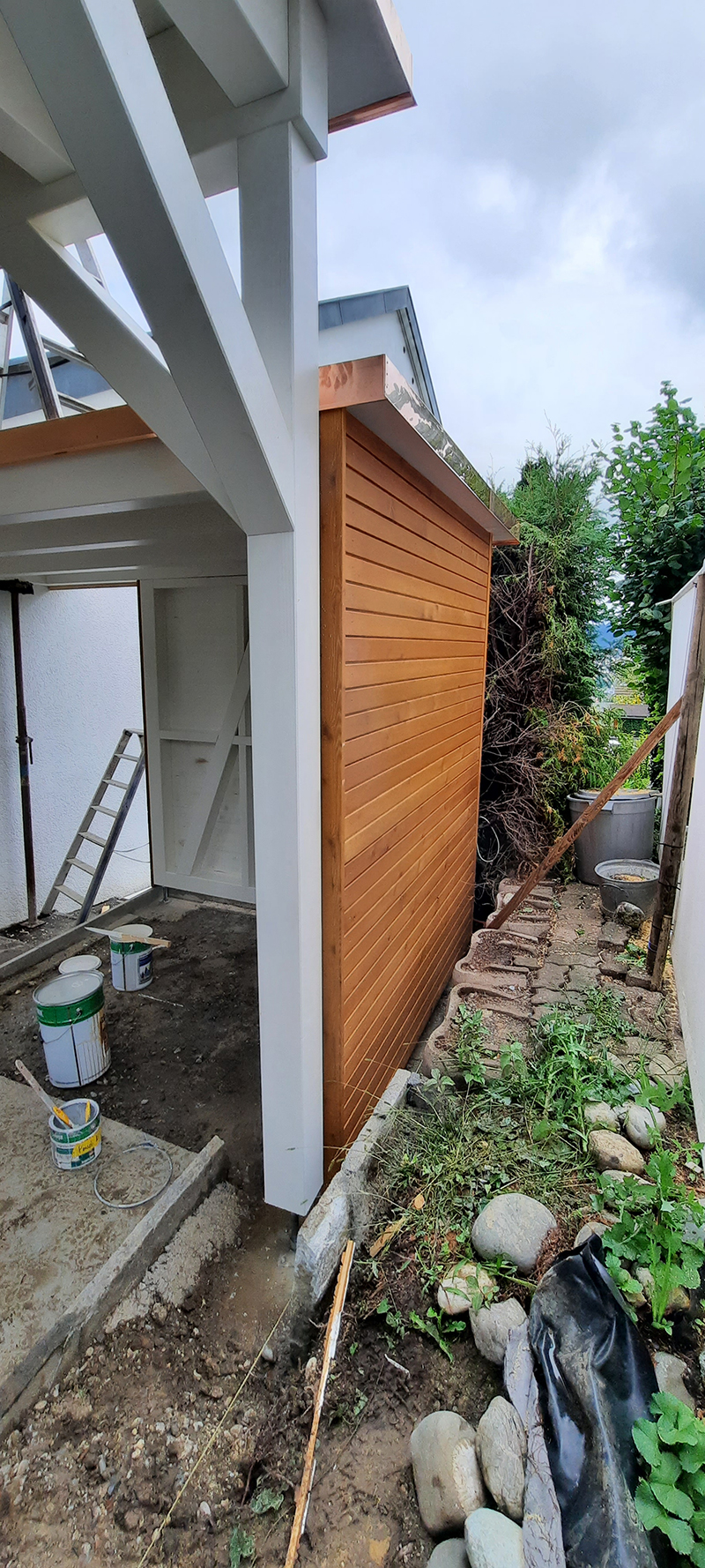 Carport mit Kiesklebedach und Abschlussblech in Kupfer. Kleiner Geräteraum mit Lärchenschalung mit Nut und Kamm. Nr.C97