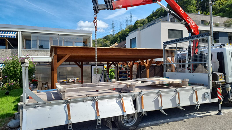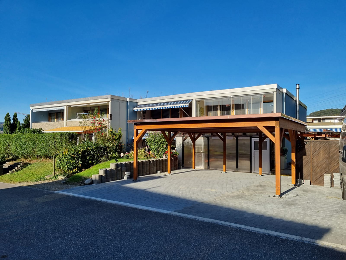 Carport für 2 PW freistehend. Eindeckung mit Kiesklebedach. Farbbehandlung der Konstruktionshölzer mit Lasur. Abschlussblech in Kupfer. Nr.C98