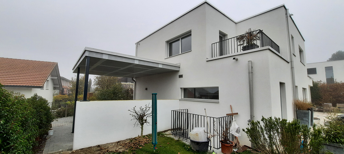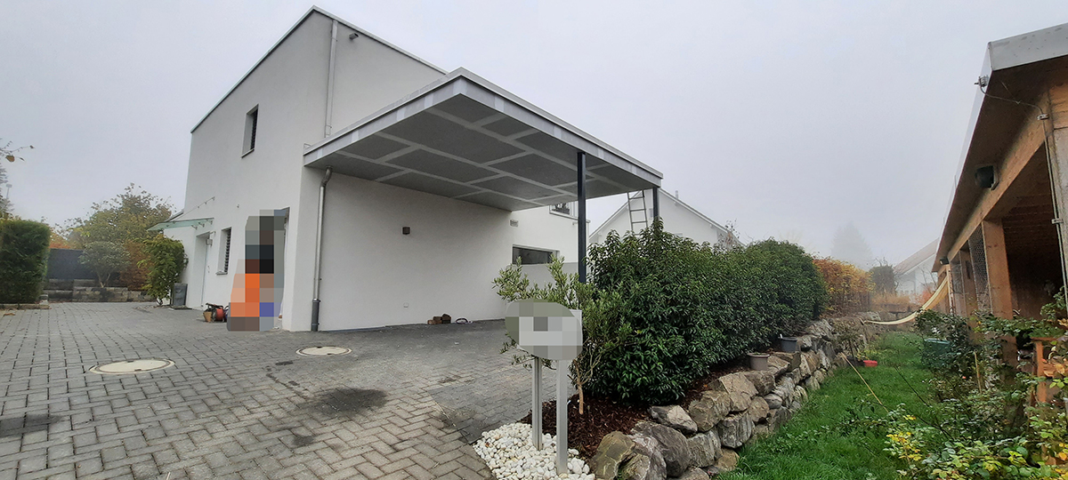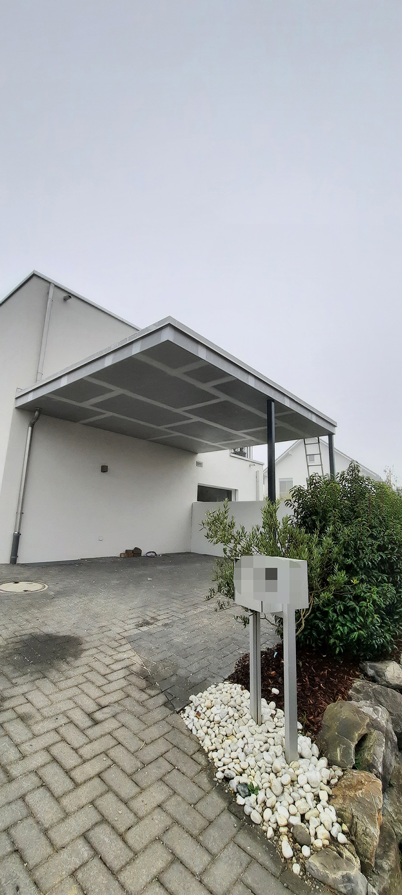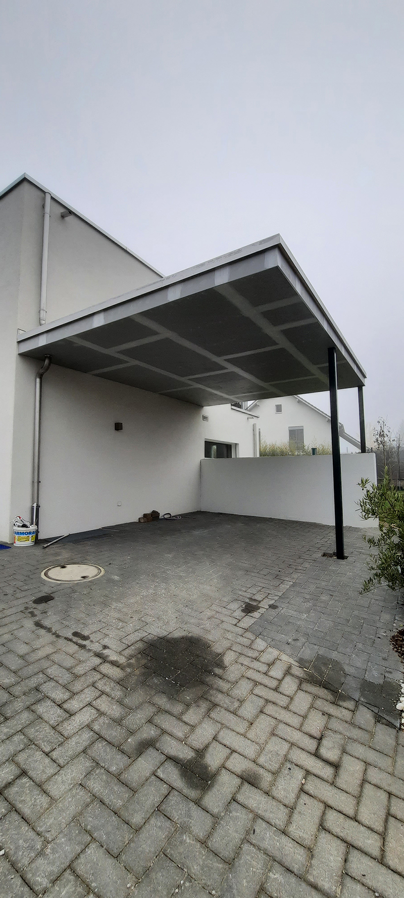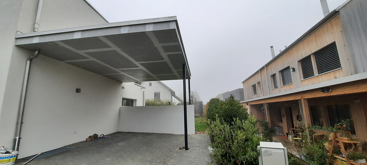 Carport mit Kiesklebedach. Verkleidung der Dachkonstruktion mit Fermacell H2o für Bauseitigen Abrieb. Nr.C102