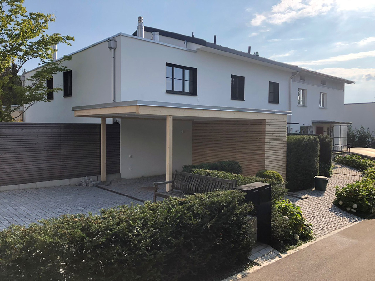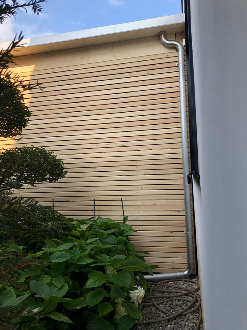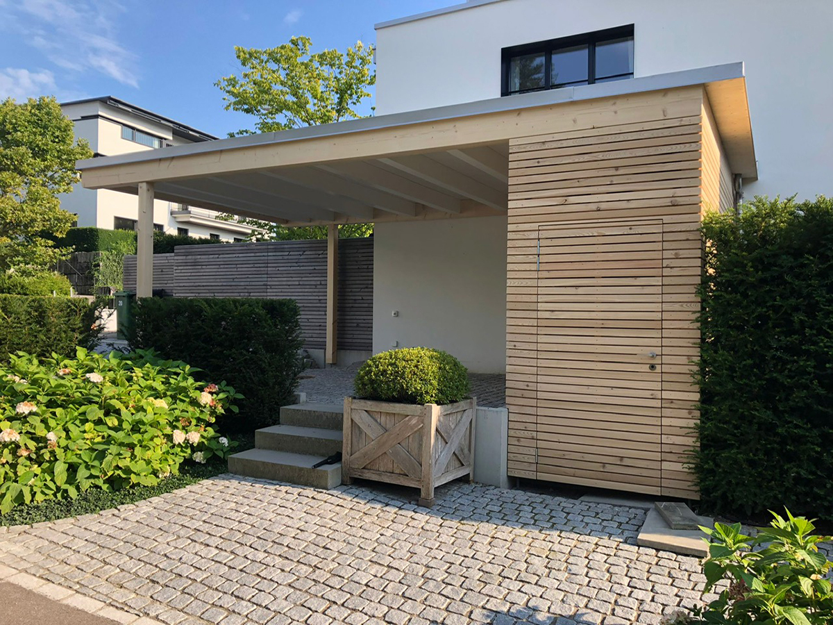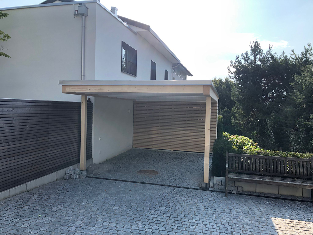 Carport mit Kiesklebedach und Abschlussbleche in Chromstahl. Holzkonstruktion und Lärchenlamellen unbehandelt. Nr.C103