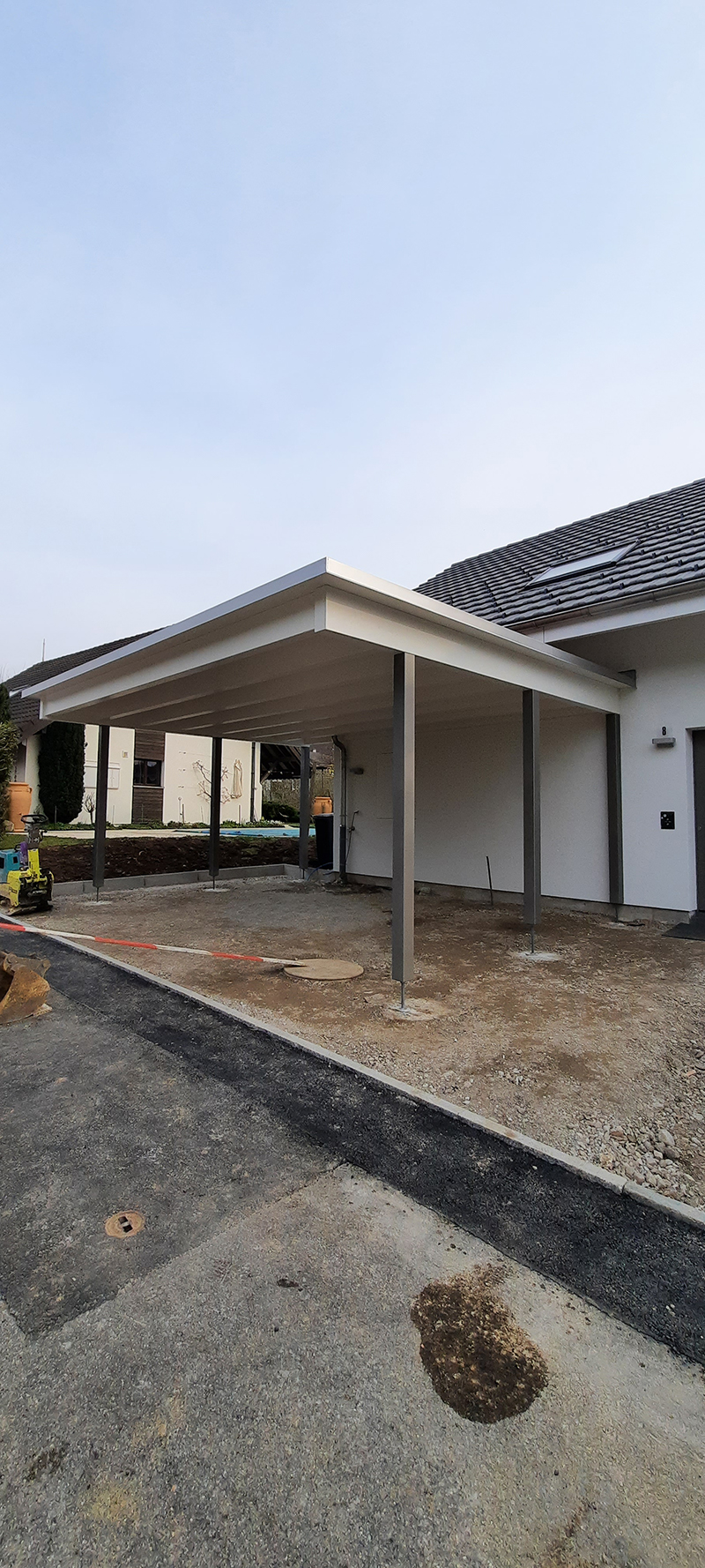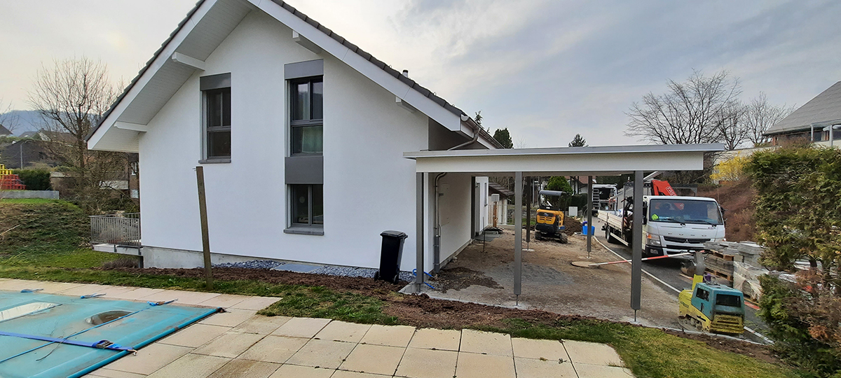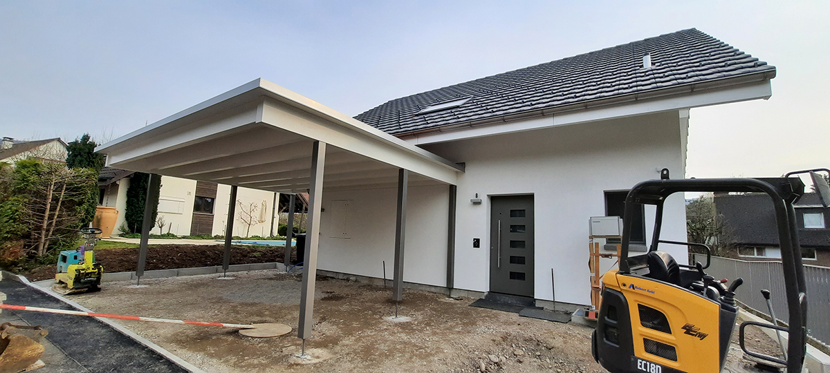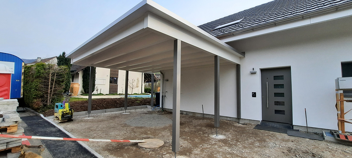 Doppelcarport mit Holzstützen extensiv Begrünt. Abschlussbleche in Chromstahl. Carport Nr.C107