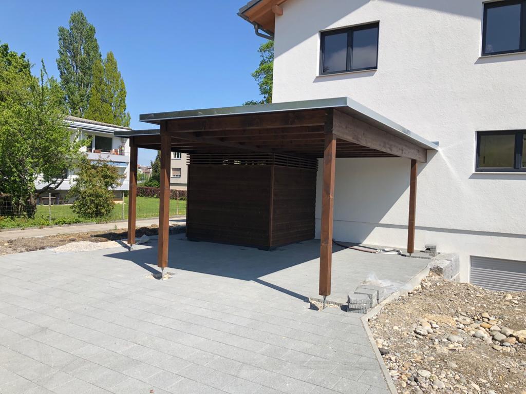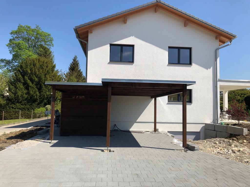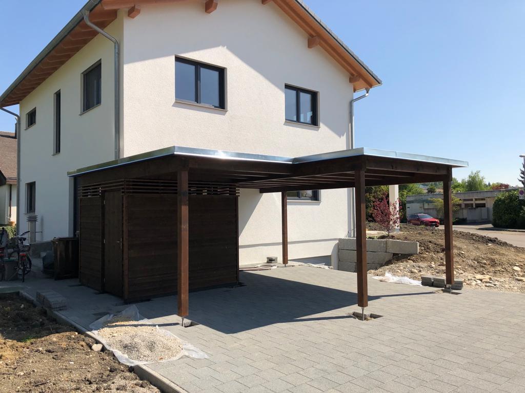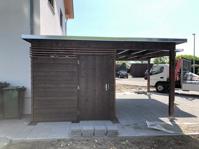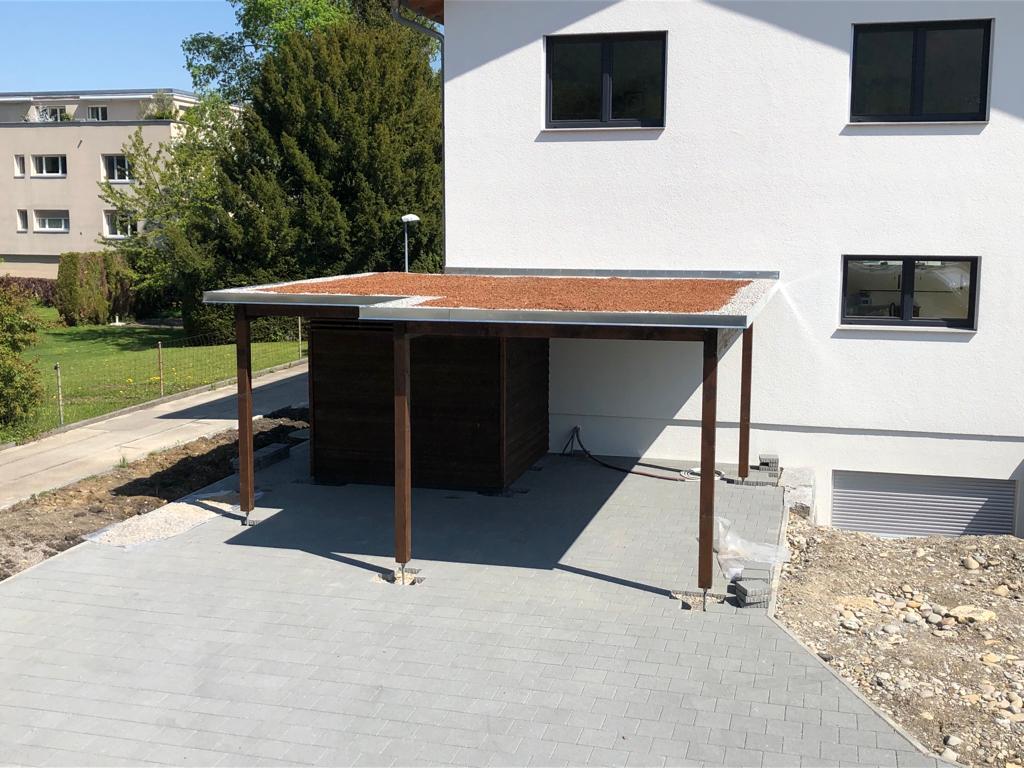Carport mit Geräteraum und Extensiv-Begrünung. Abschlussbleche in Titan-Zink. Wandkonstruktion mit Stülpschalung und Lichtlattenband. Nr.C111