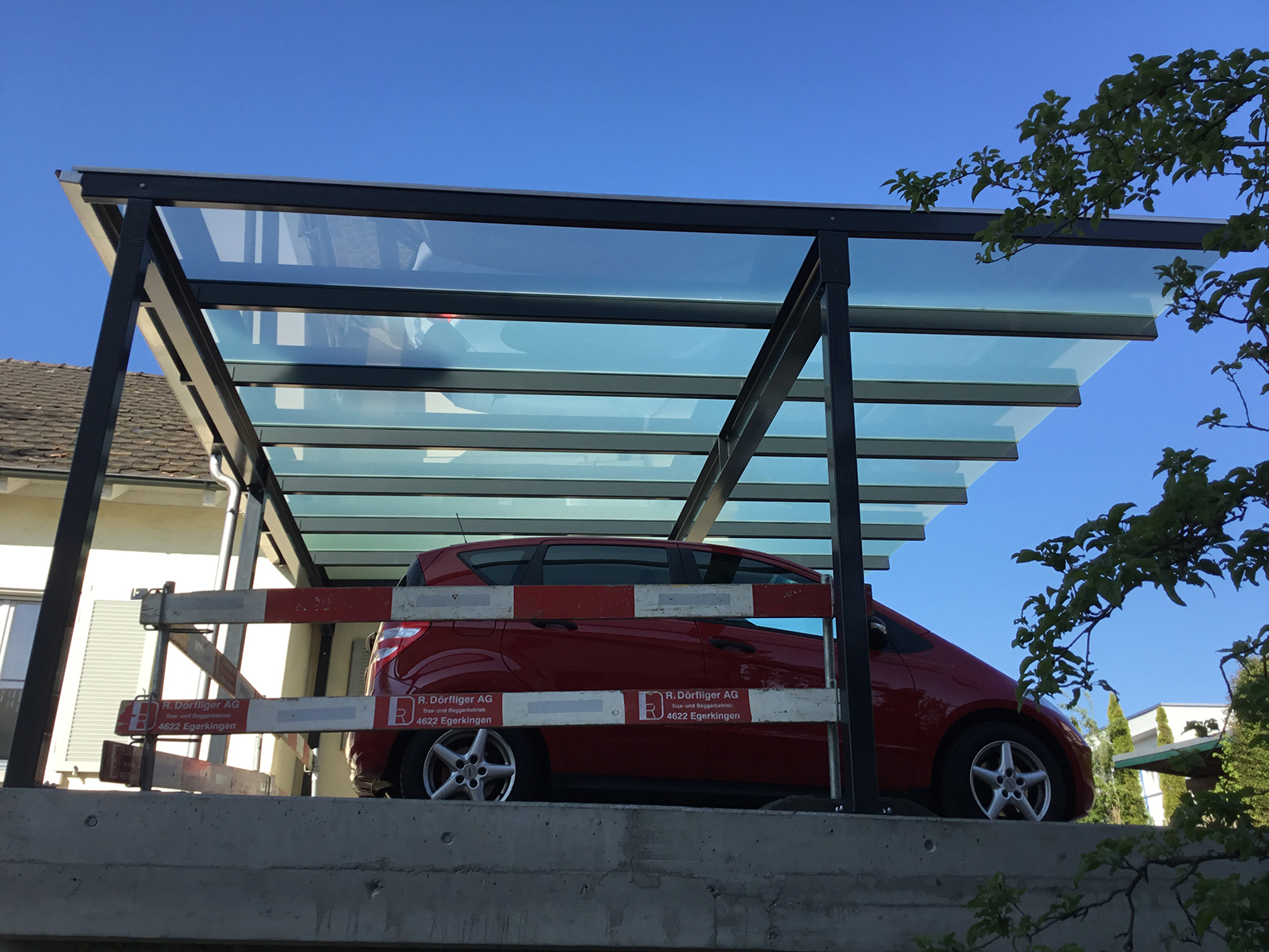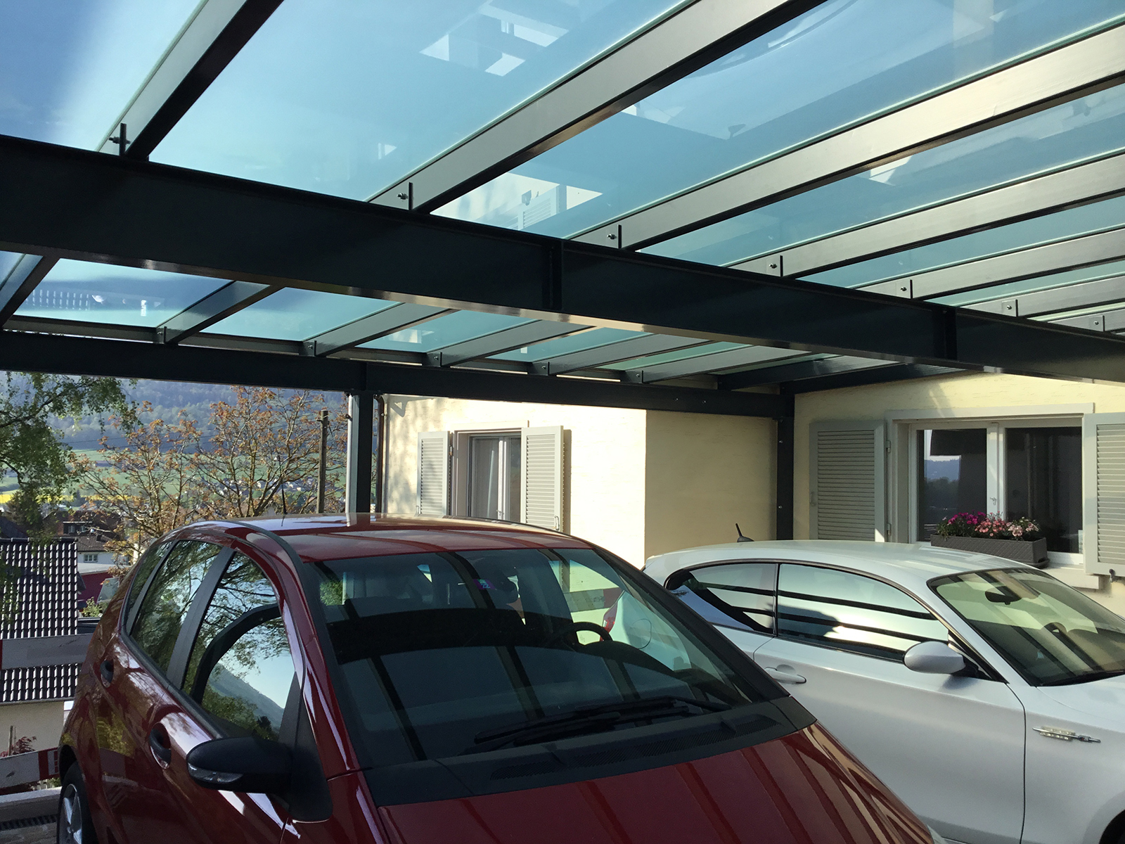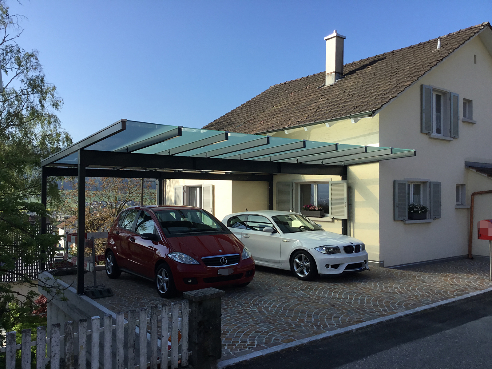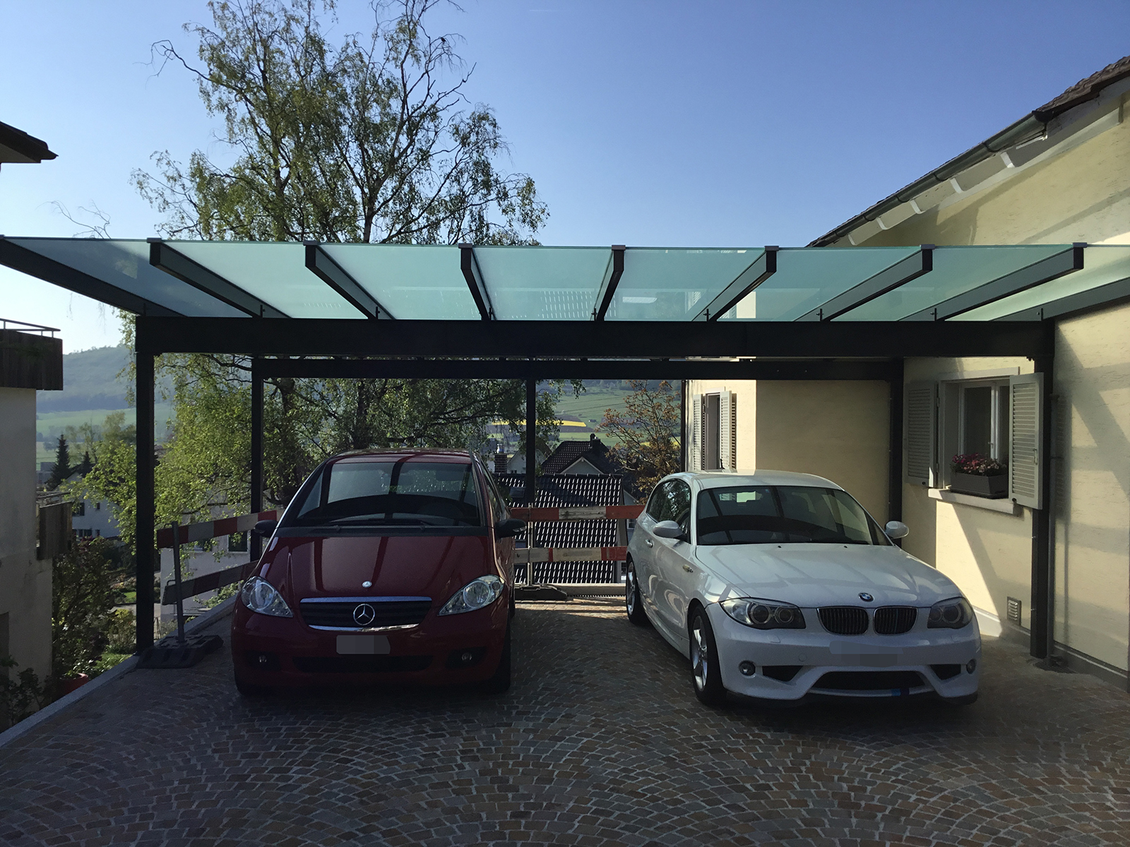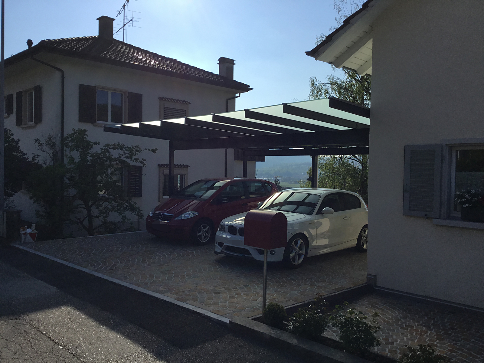 Carport aus Stahl mit Oberflächenbehandlung nach Kundenwunsch. Eindeckung mit Milchglas und einer Regenrinne aus Chromstahl. Nr.C112