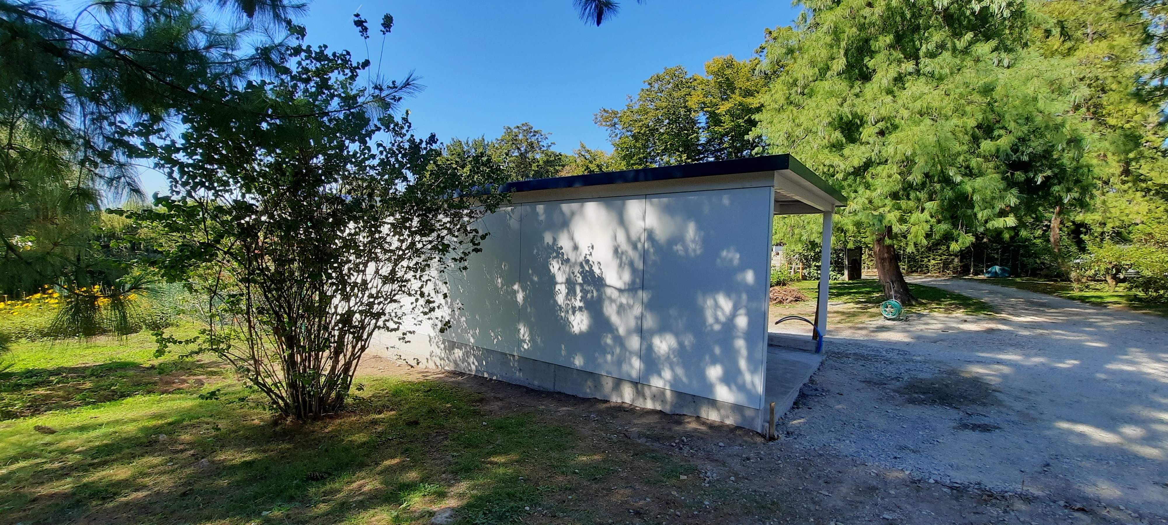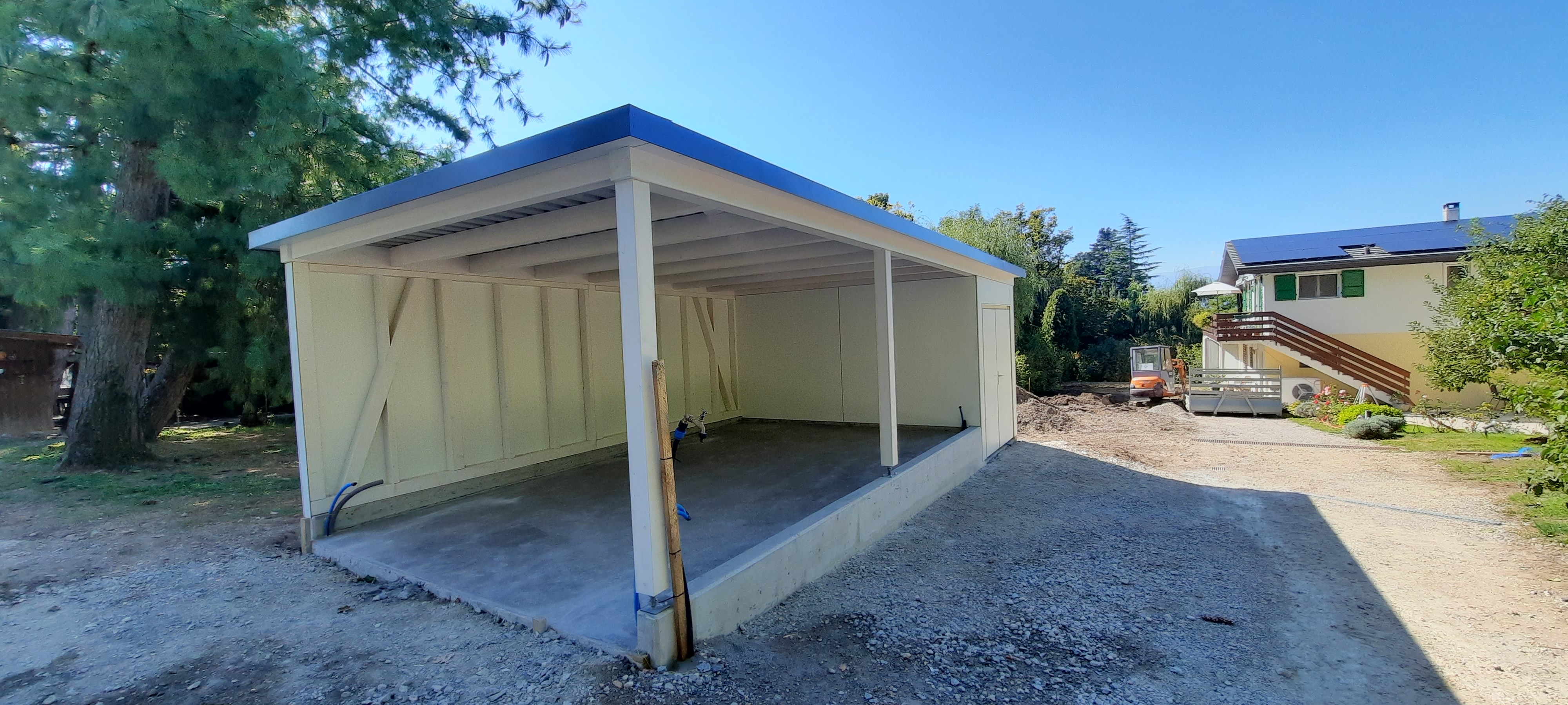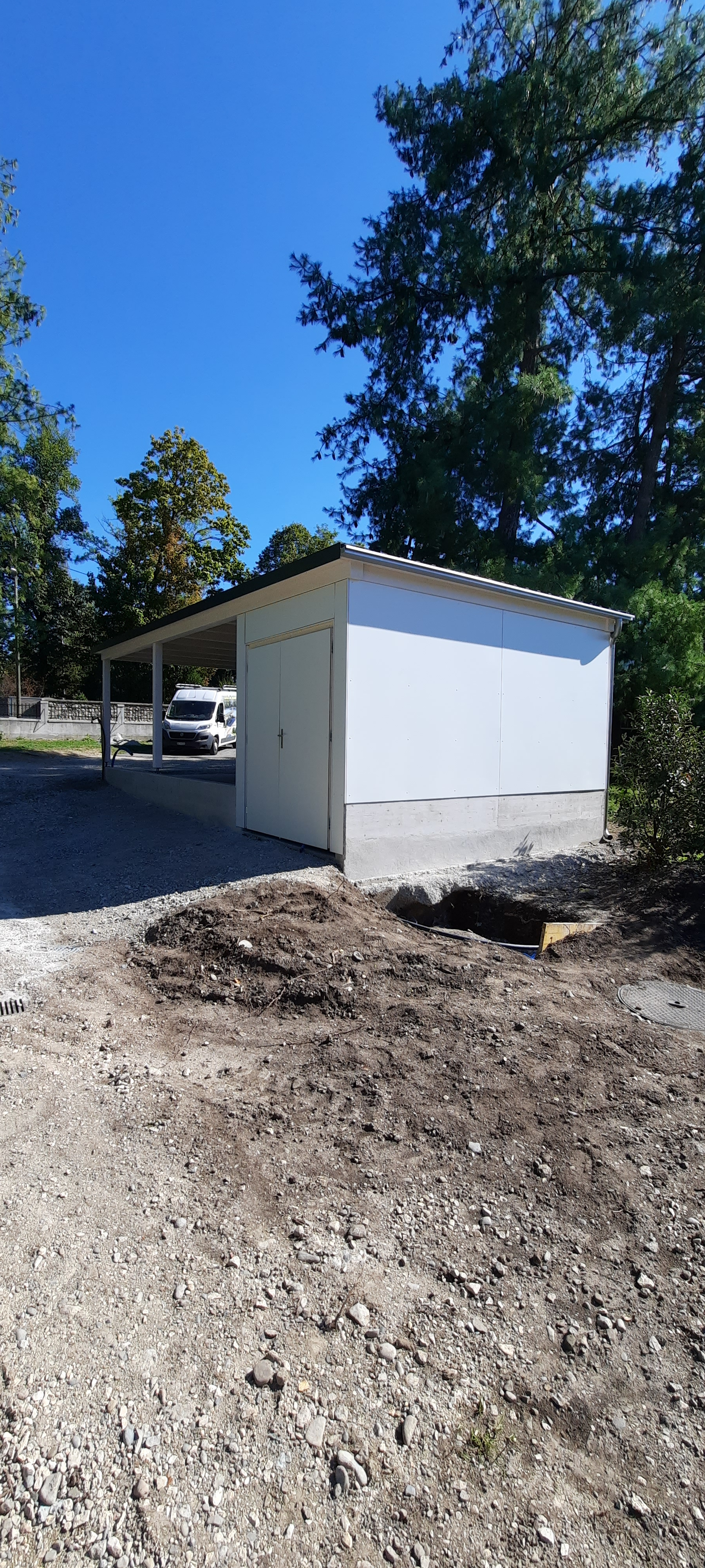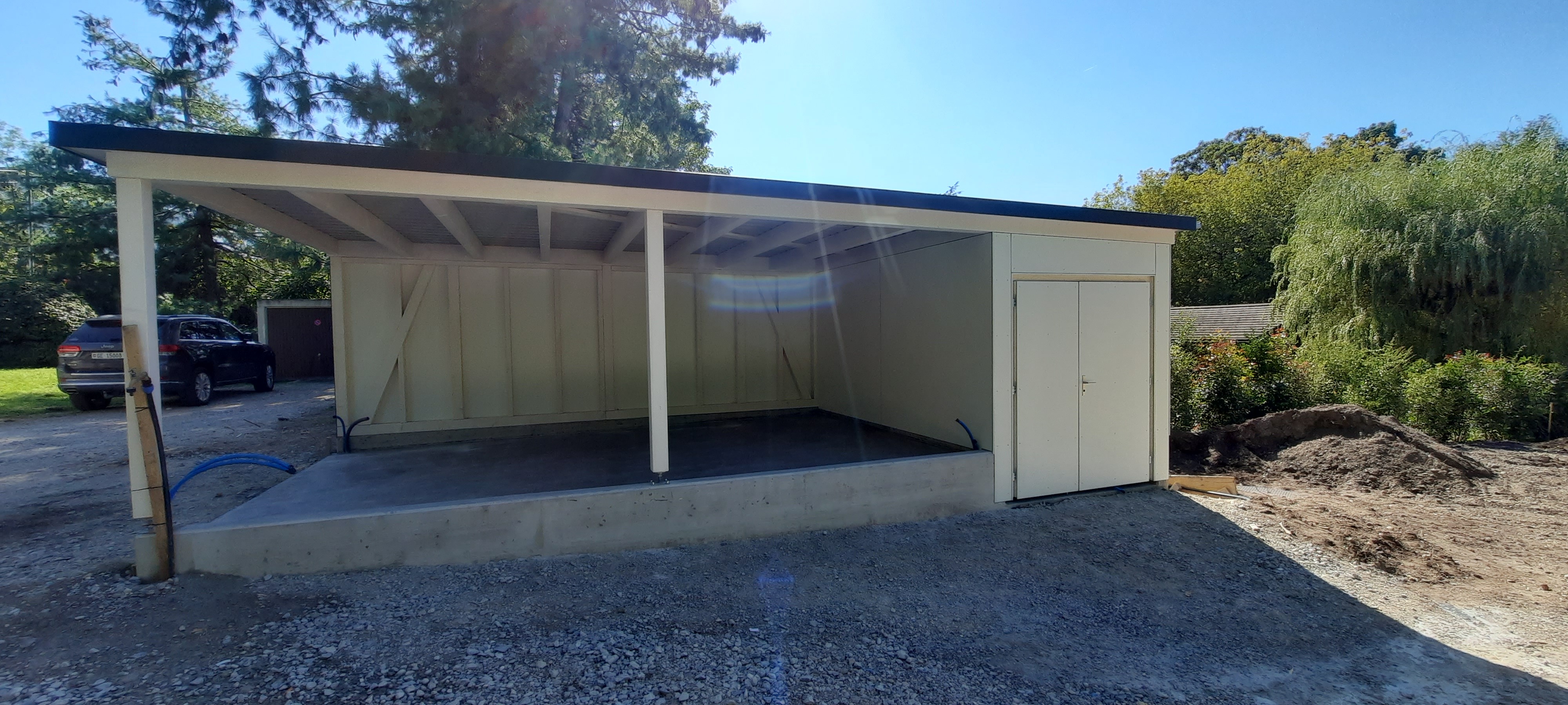 Einzelcarport mit Geräteraum. Eindeckung mit Profilblechdach in Anthrazit. Wandverkleidung mit Vollkernplatten in Weiss. Nr.C116