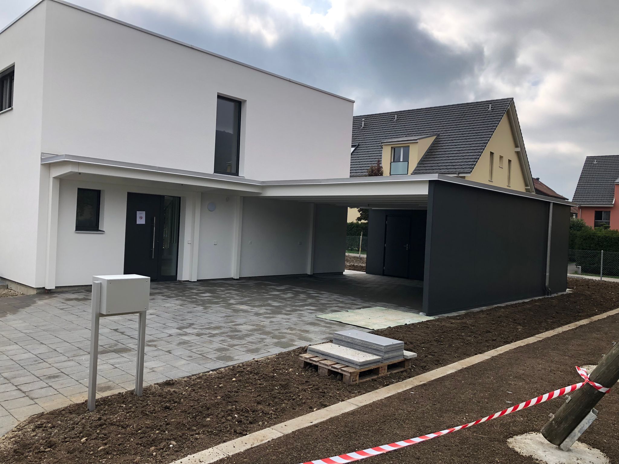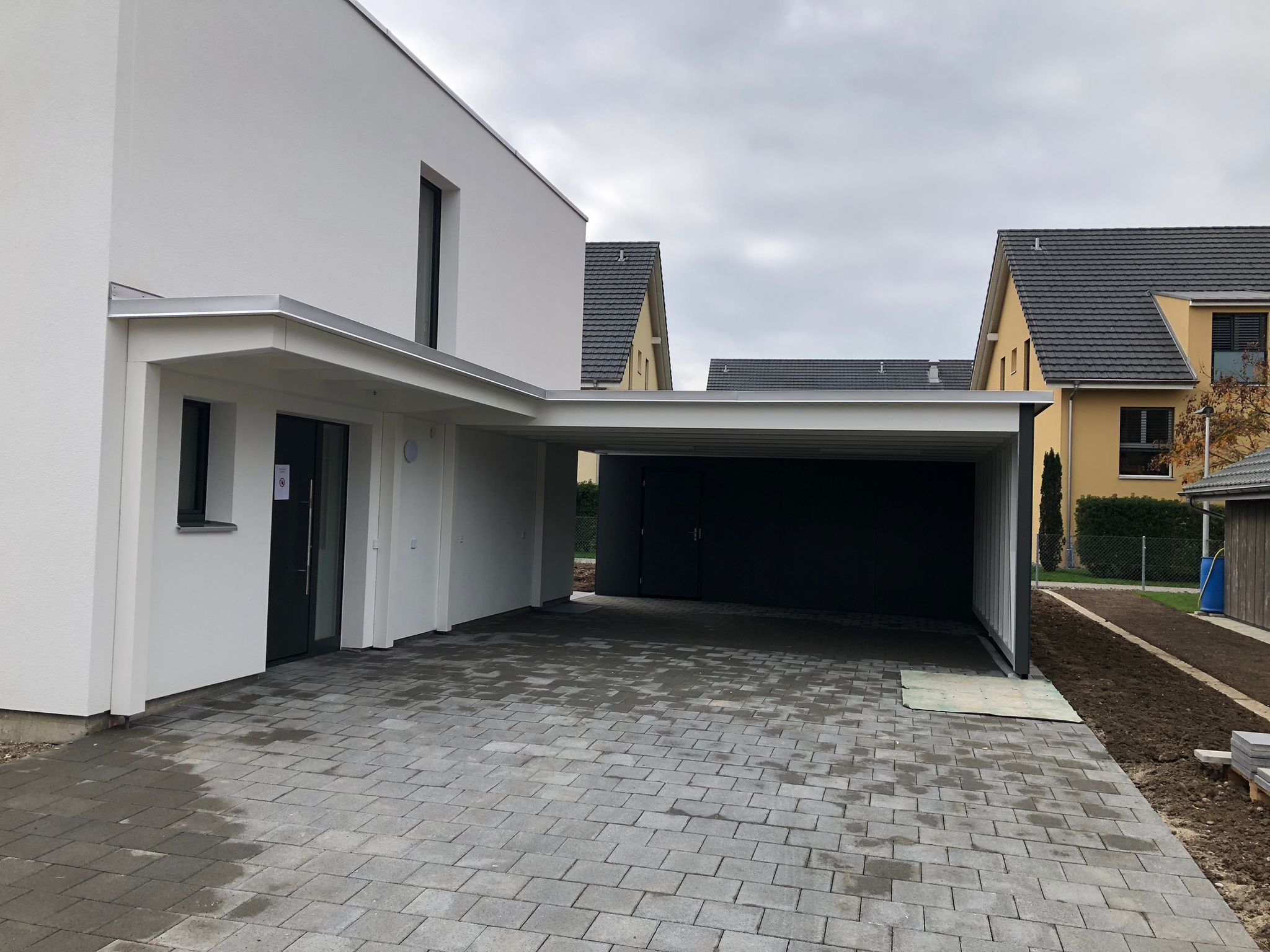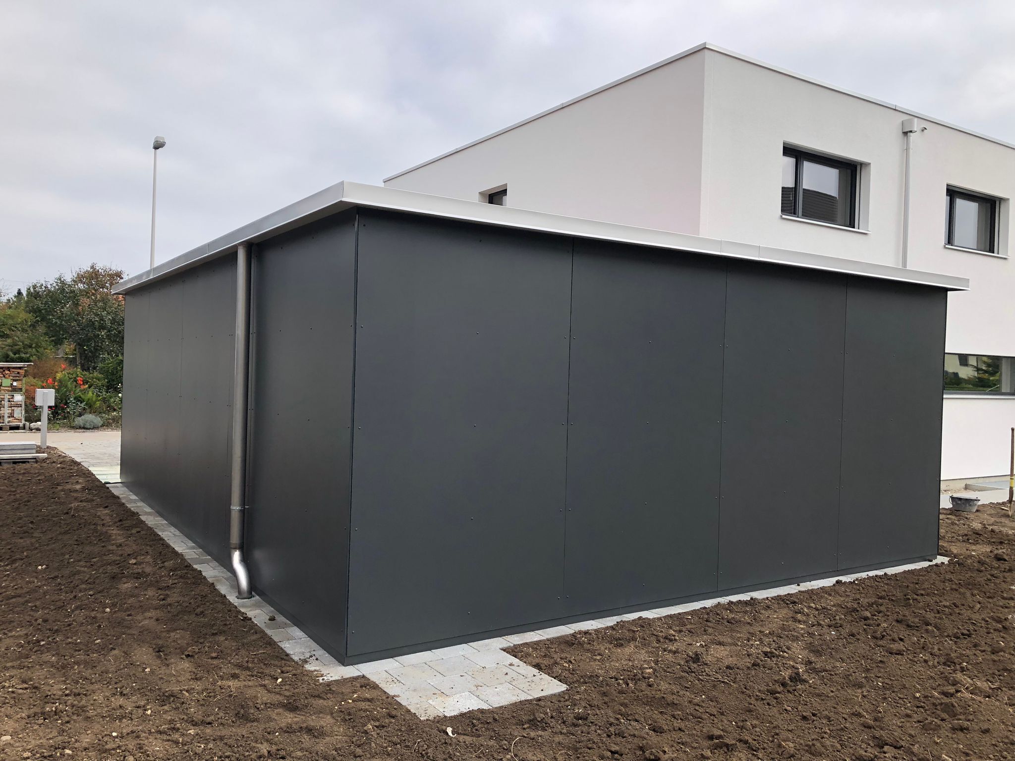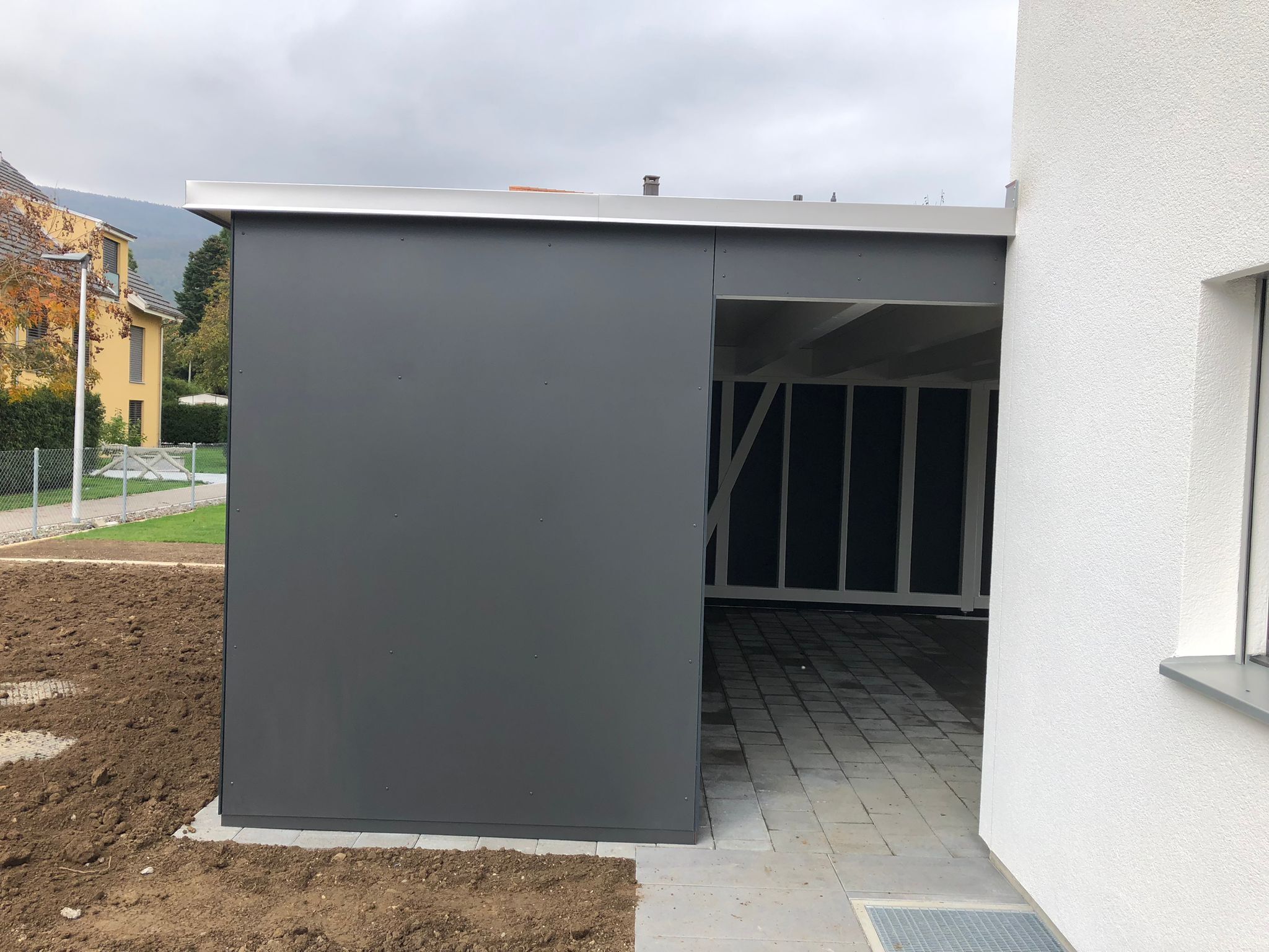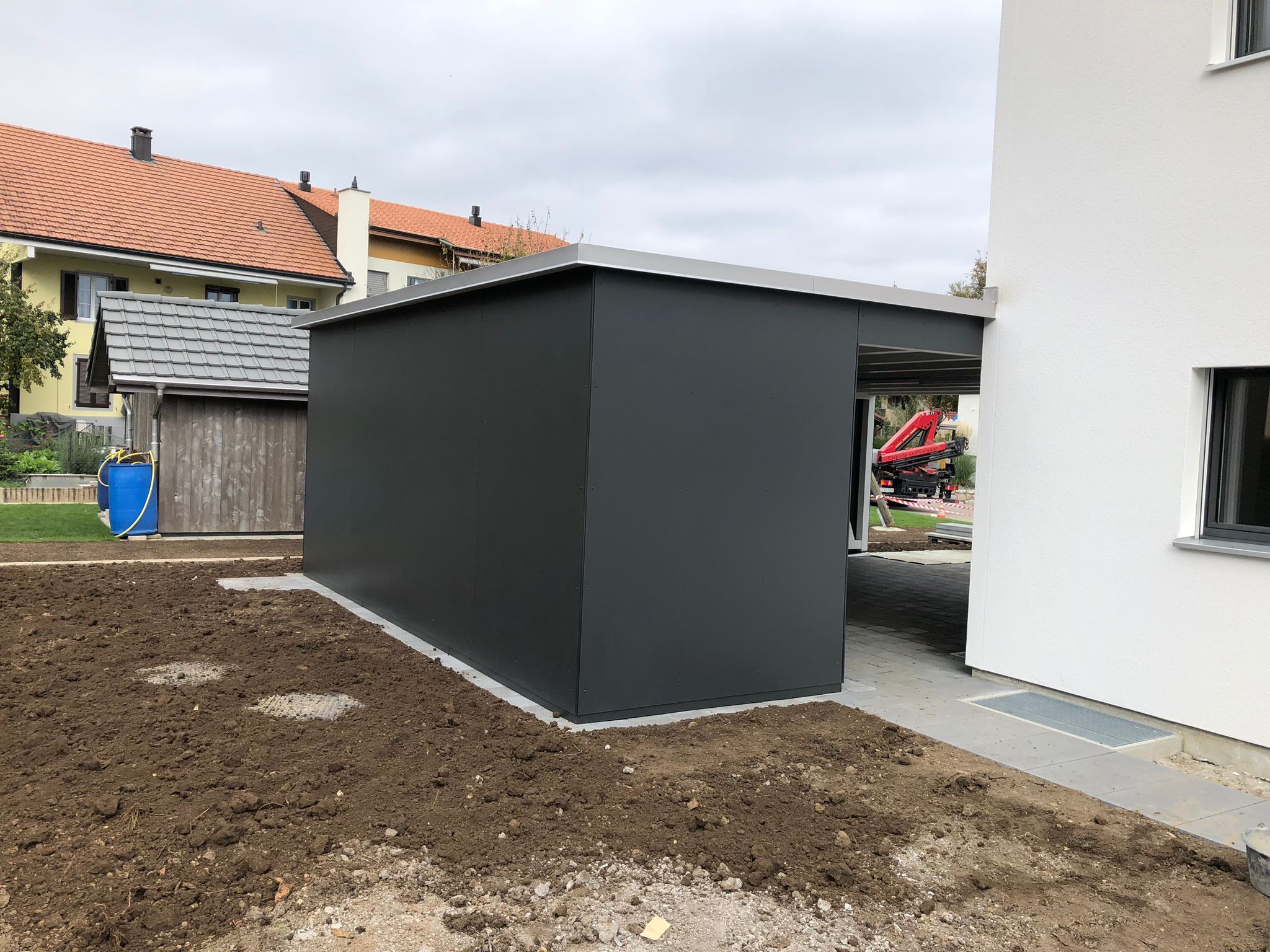 Carport mit Geräteraum. Eindeckung mit Extensiv Begrünung und Kiesrand. Abschlussbleche in Chromstahl. Wandverkleidung mit Vollkernplatten in Anthrazit. Nr.C117
