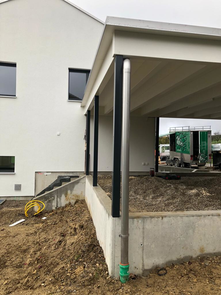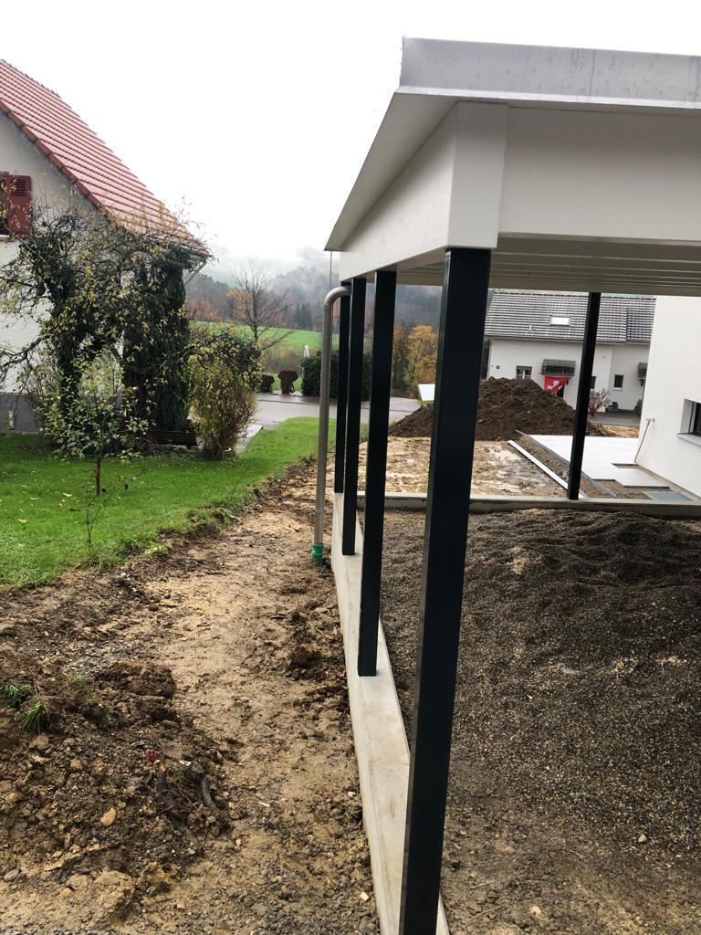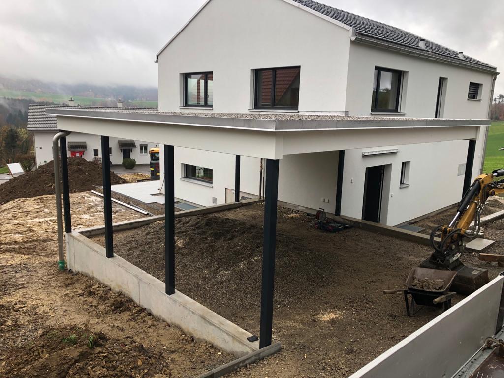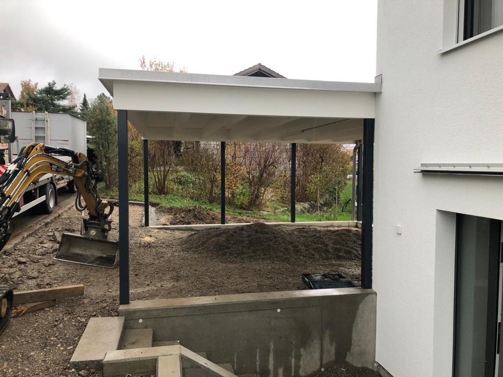 Carport mit Kiesklebedach. Abschlussblech in Chromstahl. Stahlstützen Duplexiert Anthrazit. Nr.C121