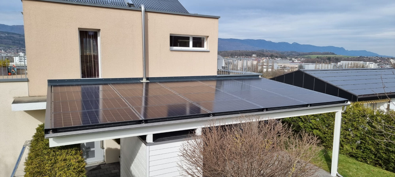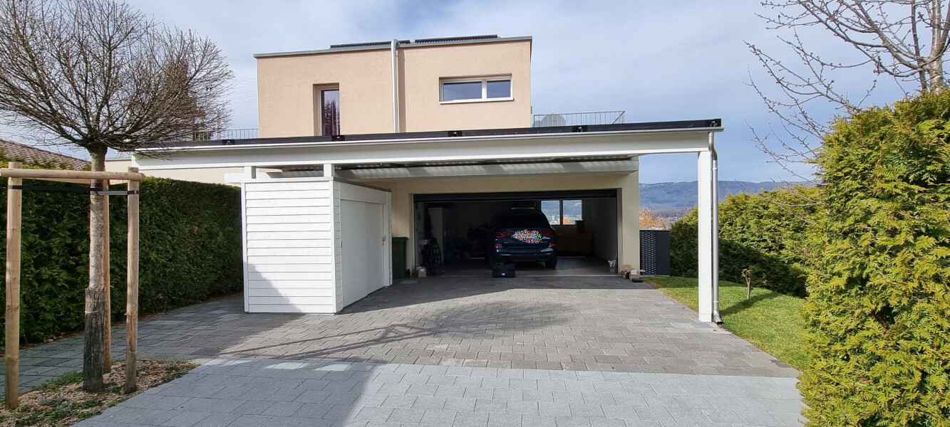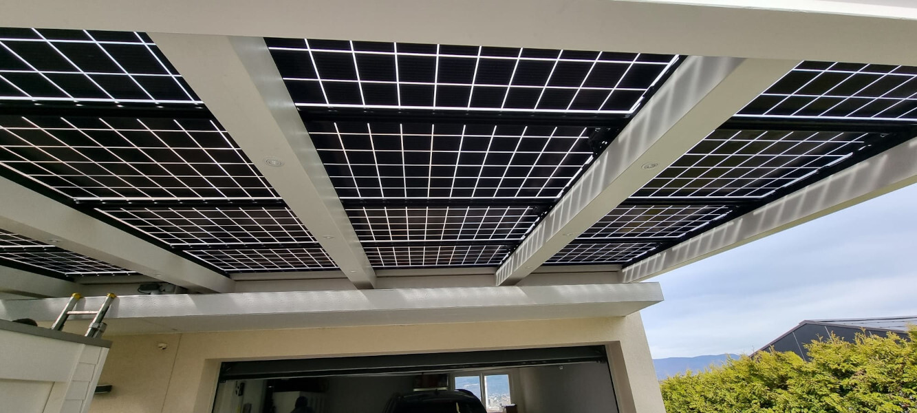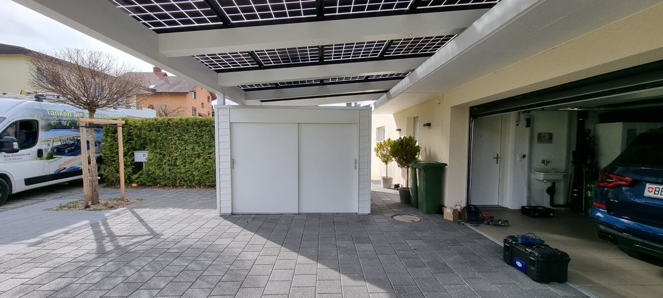 Solarcarport mit Geräteraum. Eindeckung mit Indach-PV-Anlage. Transluszide-Bifaciale Module. Regenrinne in Chromstahl. Abschlussbleche in Wunschfarbe. Nr.SO18
