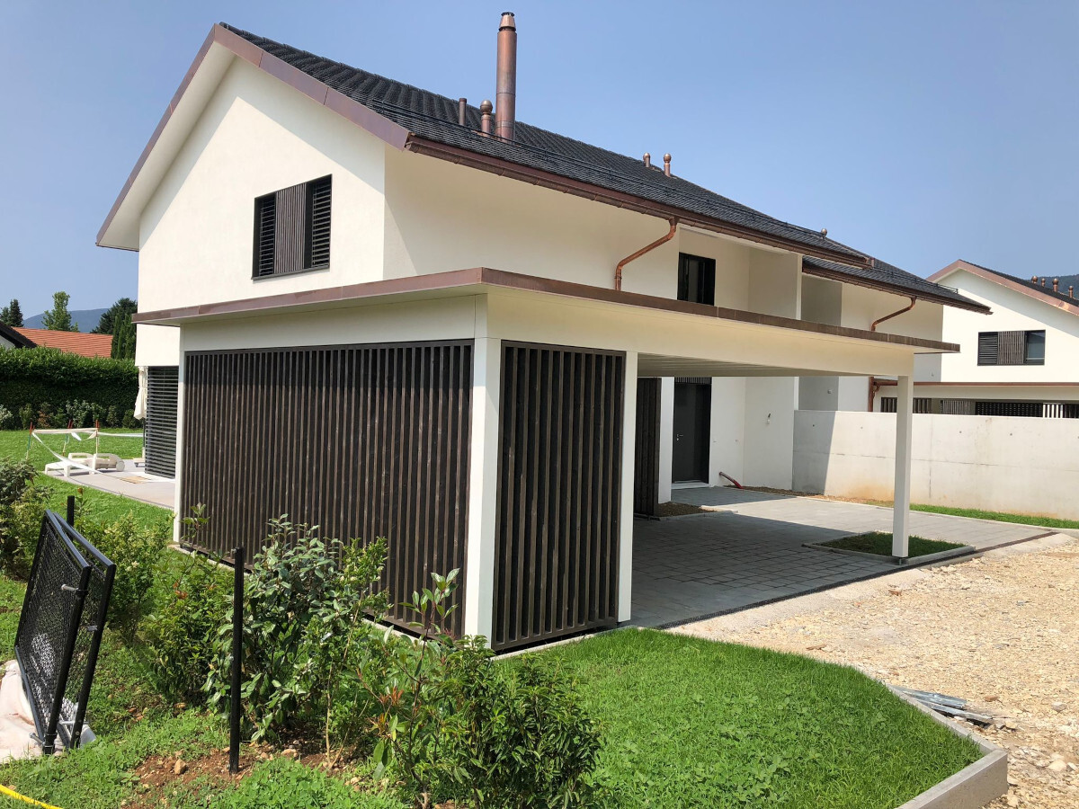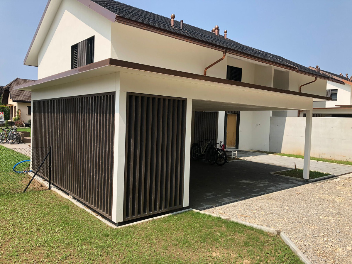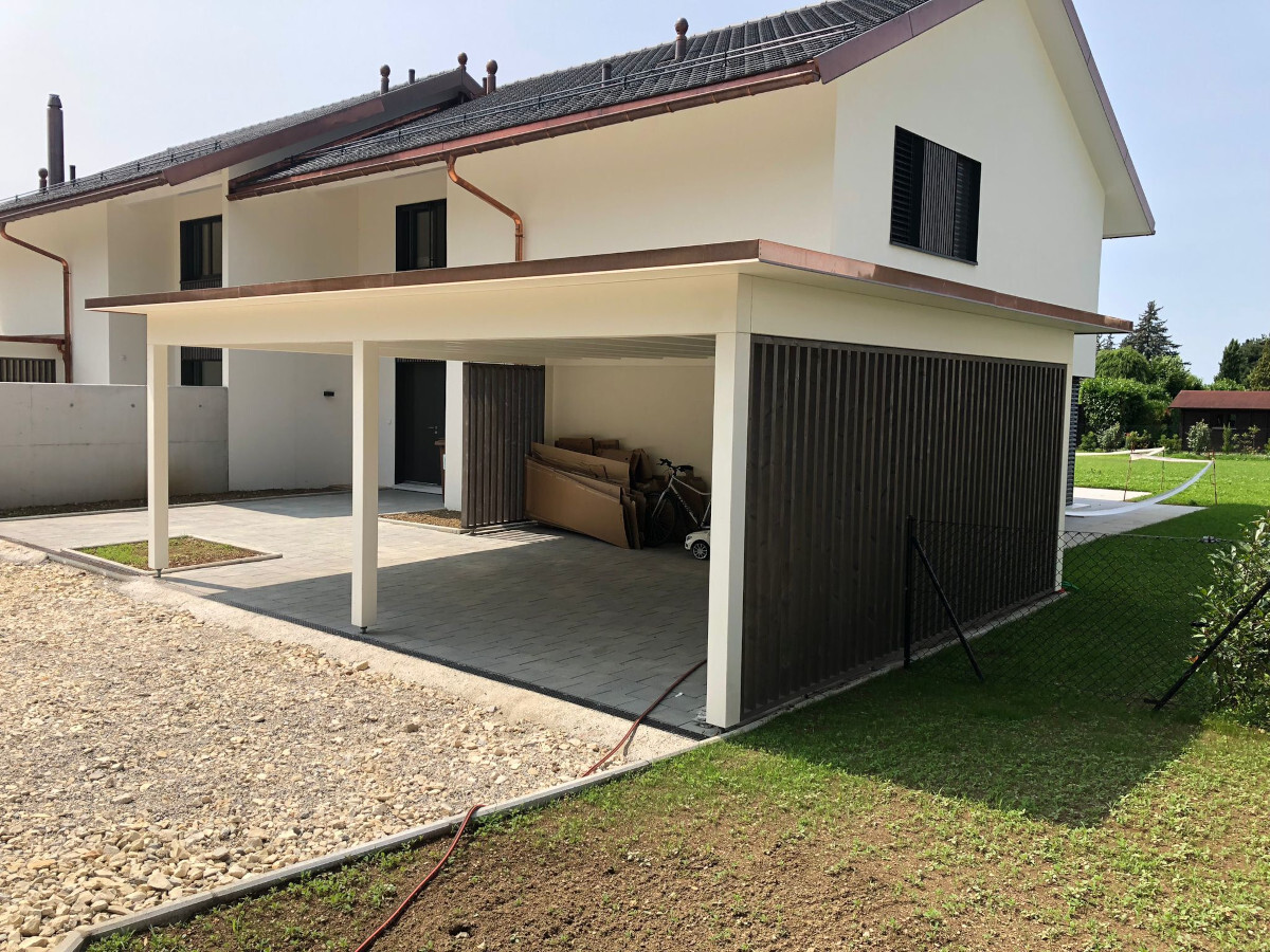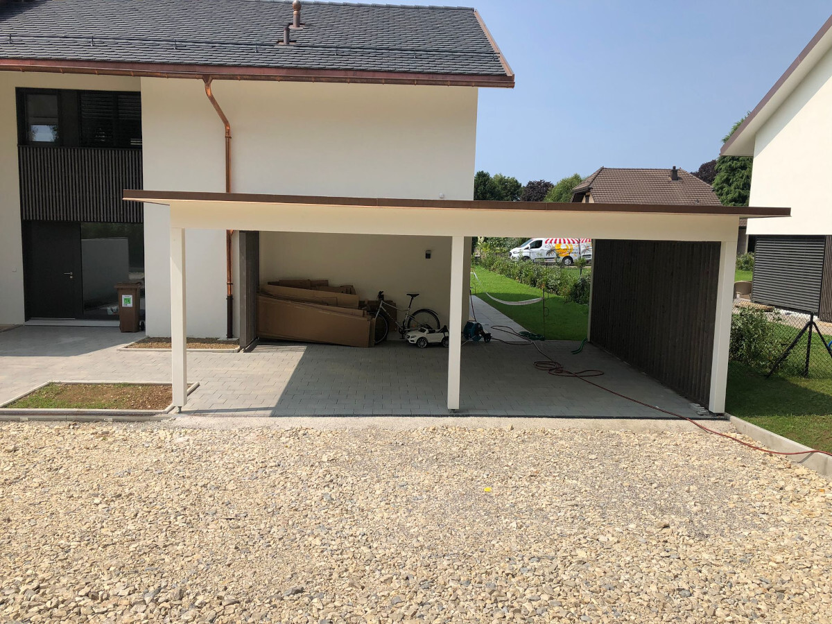 Neubau Wohnquartier. Doppel-Carporte mit Kiesdach. Abschlussbleche in Kupfer. Oberflächenbehandlung mit Premium Farbbehandlung in Weiss.  Wandverkleidung mit Vorvergrauungslasur.Nr.C130