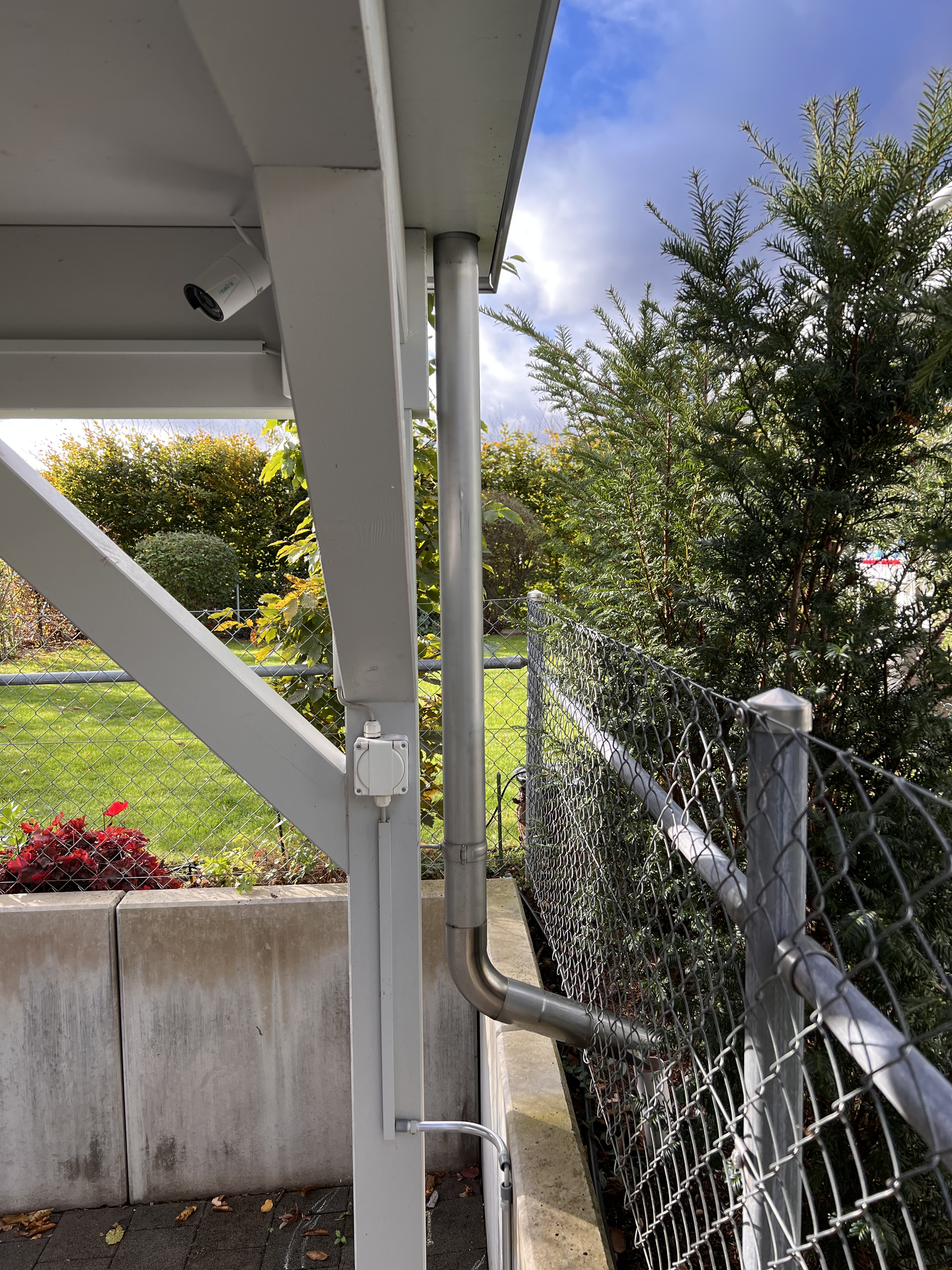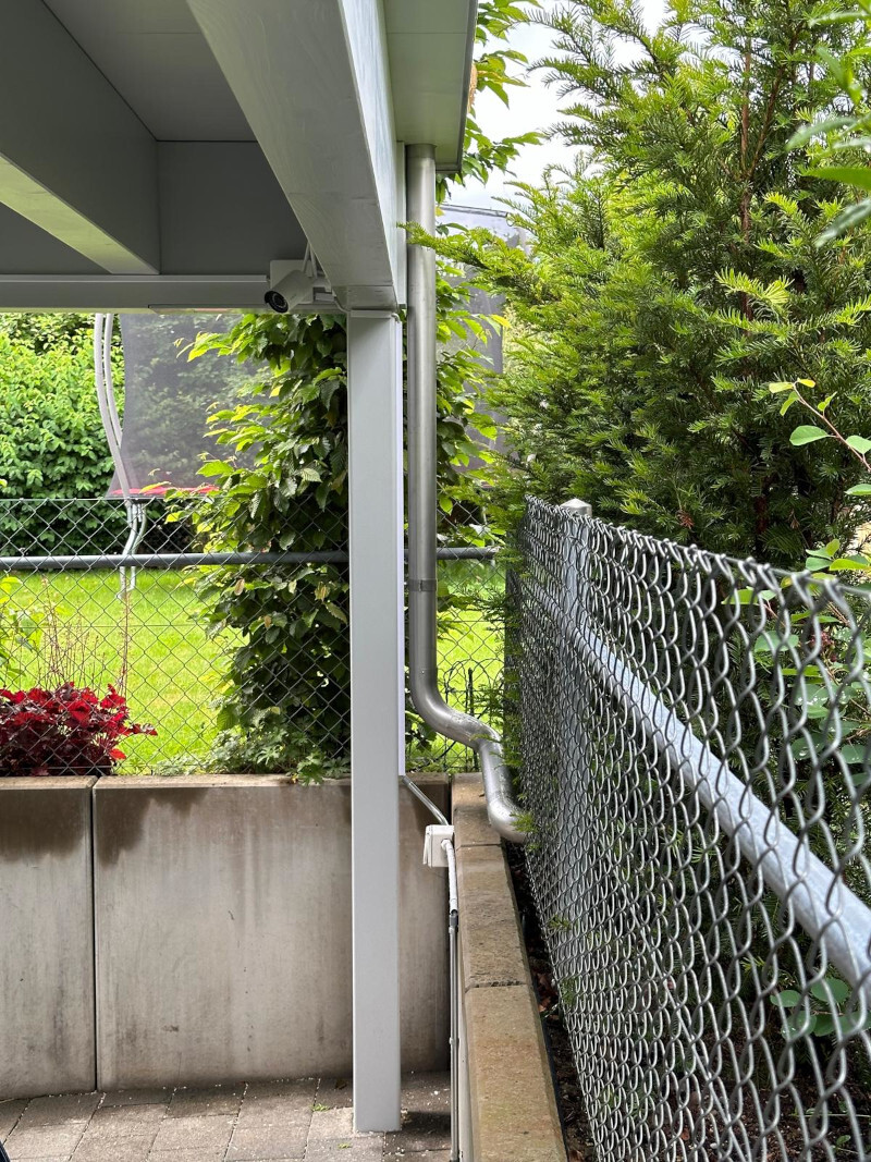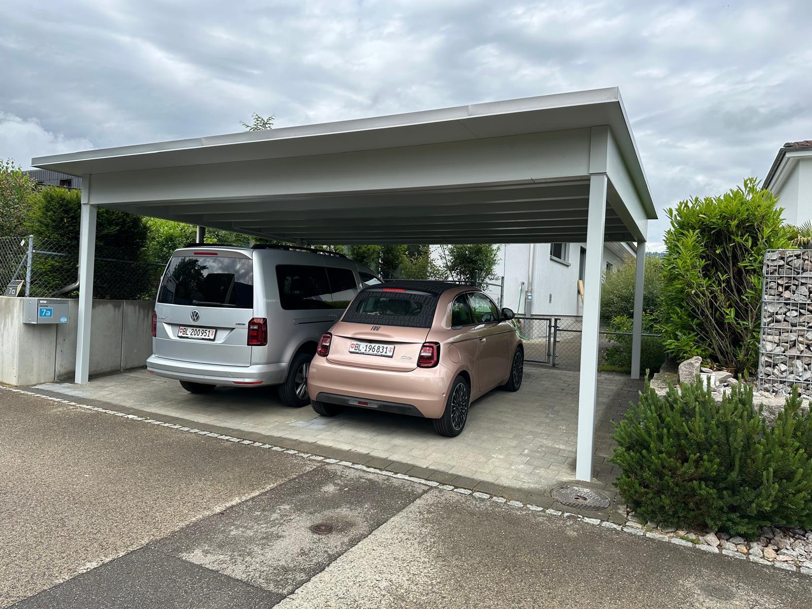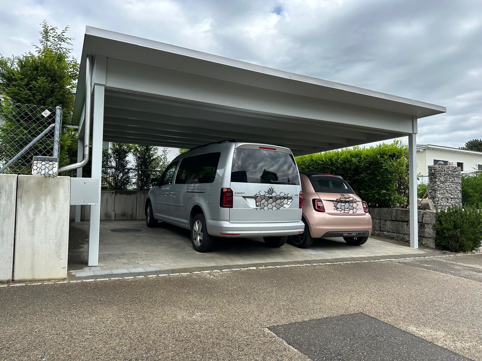 Carport mit Kiesklebedach. Abschlussbleche in Chromstahl. Deckende Farbbehandlung der Holzkonstruktion. 4 Stahlstützen Farbbehandelt nach Kundenwunsch. Nr.C140