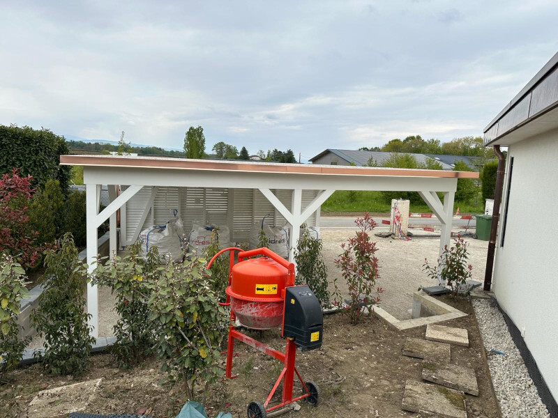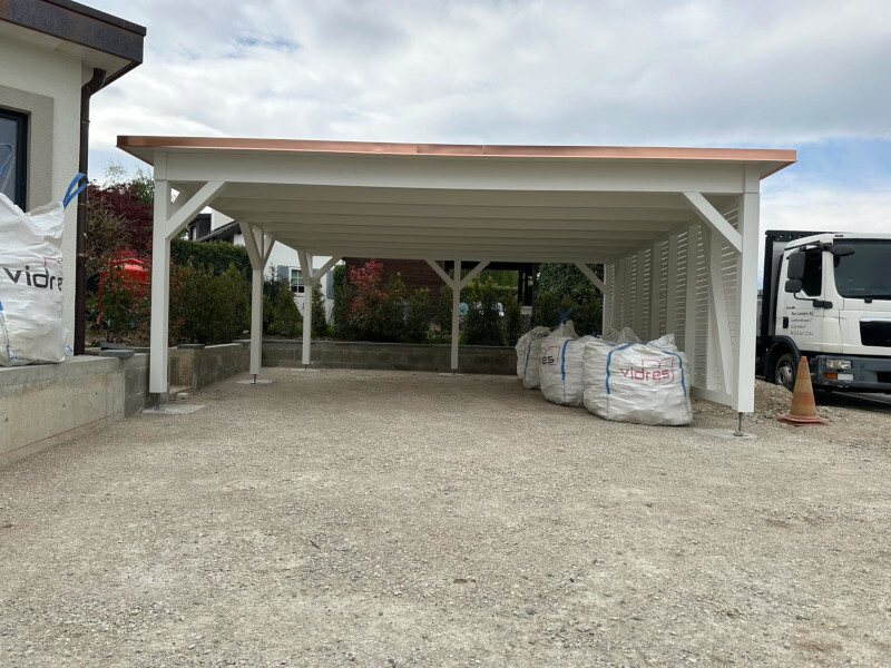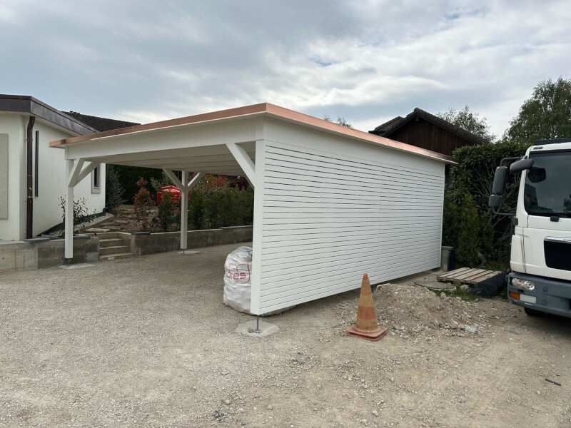 Carport mit Kiesklebedach. Abschlussbleche in Kupfer. Seitenwand mit Lamellenschalung. Deckende Farbbehandlung der Holzkonstruktion. Nr.C141