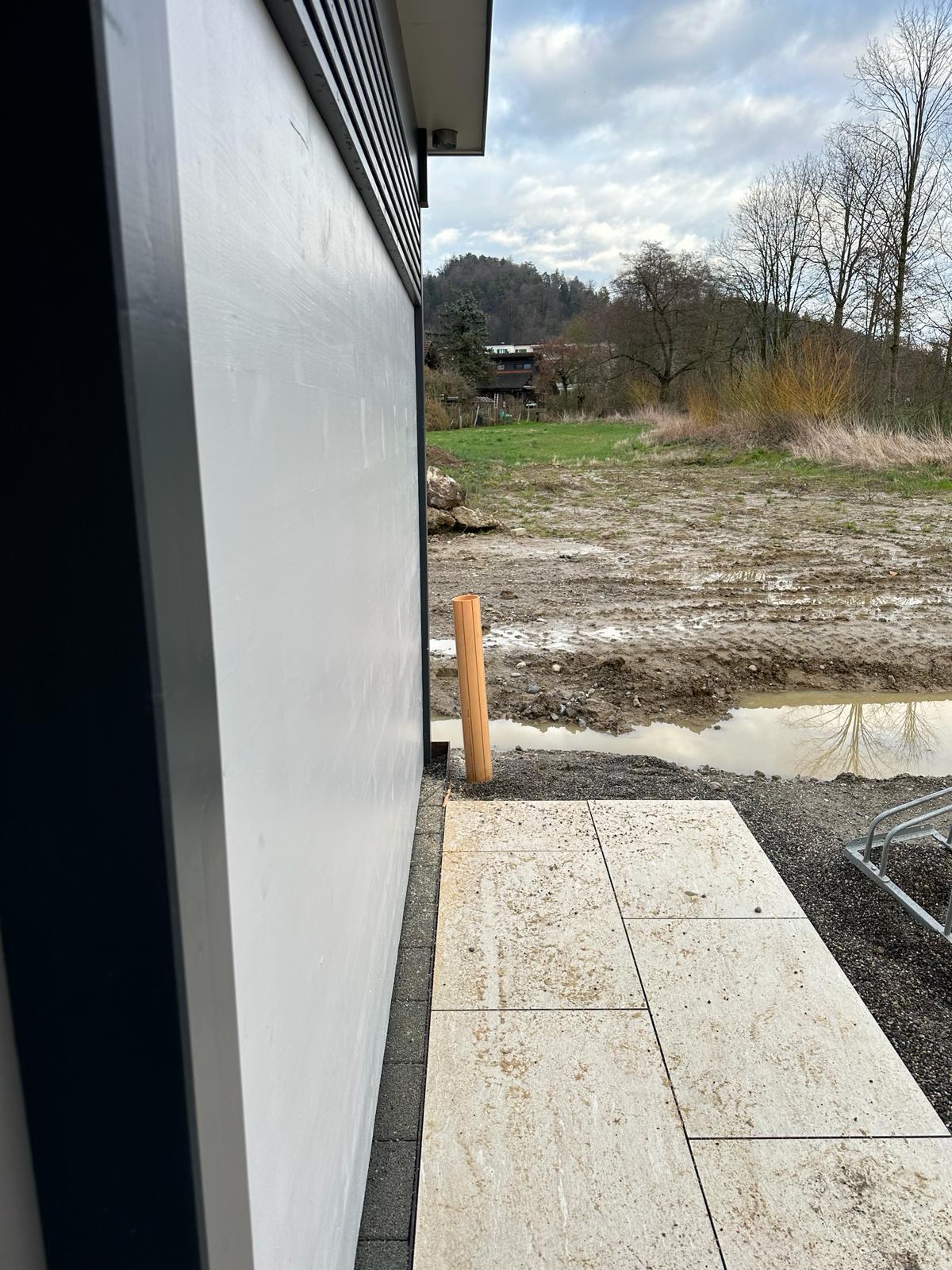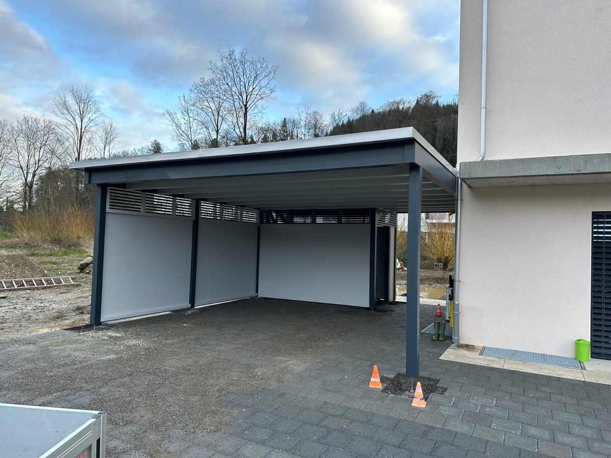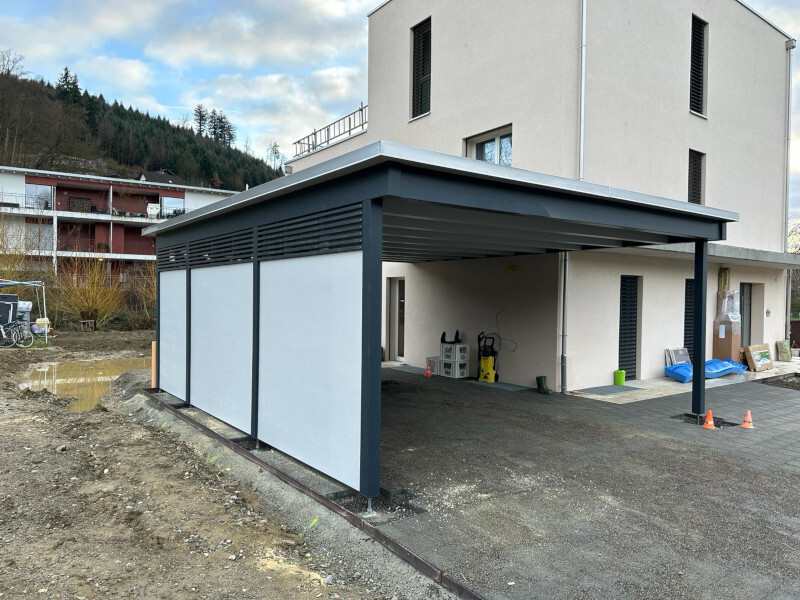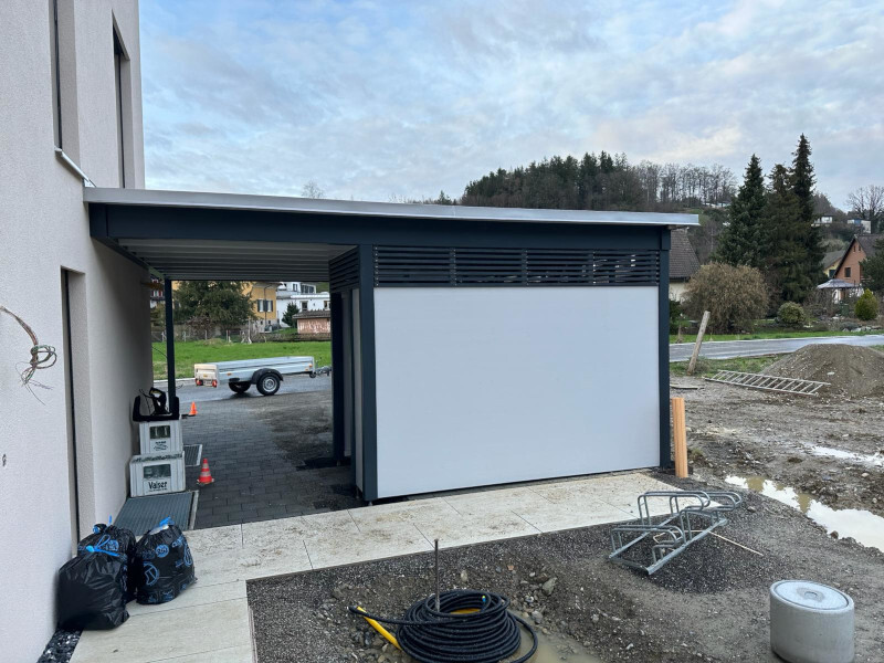 Carport mit Kiesklebedach und Geräteraum. Wandverkleidung mit 3-Schichtplatten. Abschlussblech in Chromstahl Nr.C145