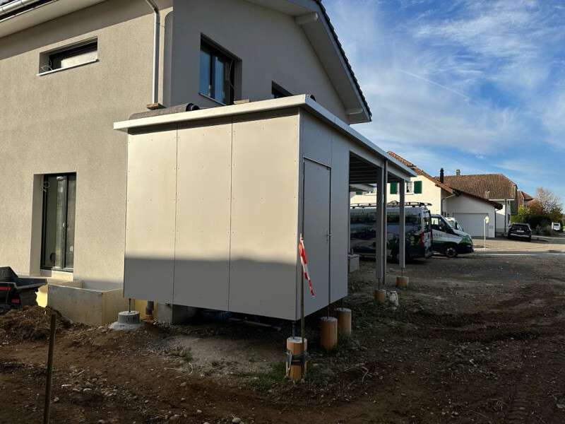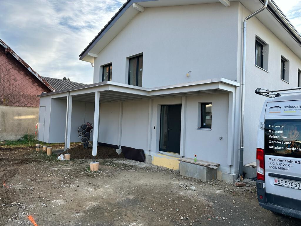 Carport mit Kiesklebedach. Geräteraum mit HPL-Kompaktplatten in Hellgrau. Abschlussbleche in Chromstahl. Nr.C147