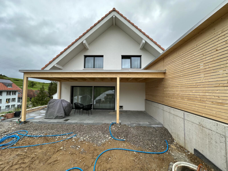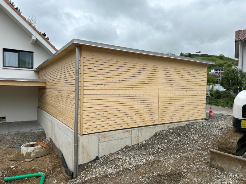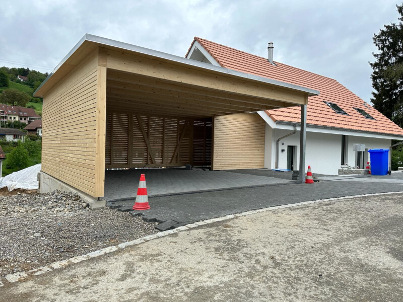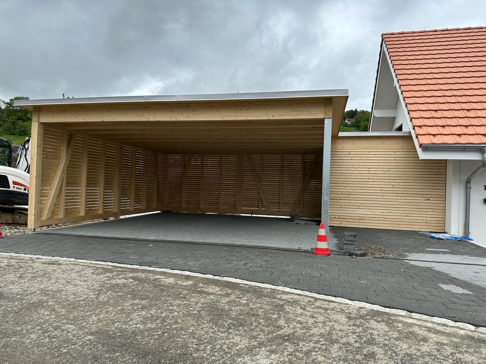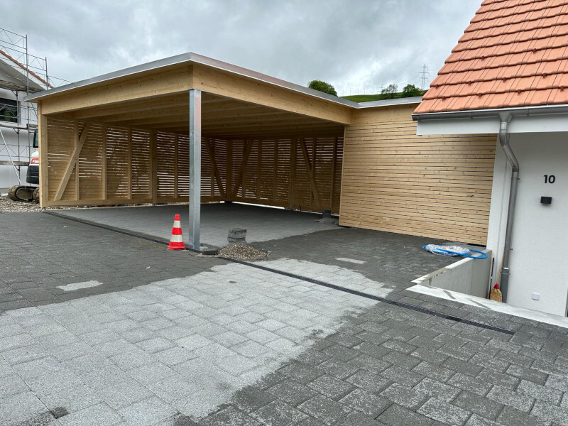 Carport mit Kiesklebedach. Wandverkleidung mit Lamellenschalung. Oberflächenbehandlung mit Basislasur Farblos. Inkl. Angebaute Sitzplatzüberdachung. Abschlussbleche in Chromstahl. Nr.C150