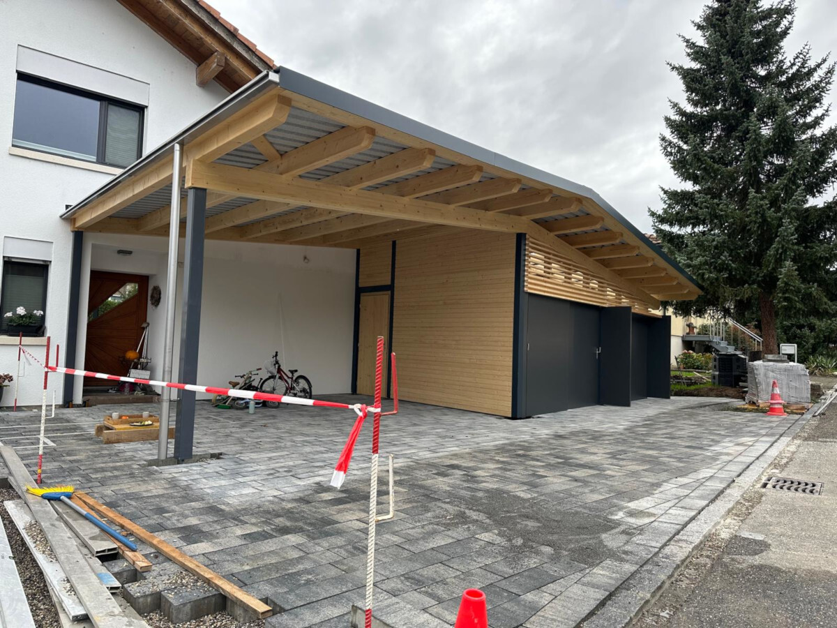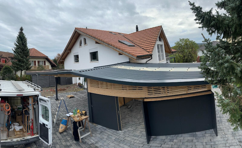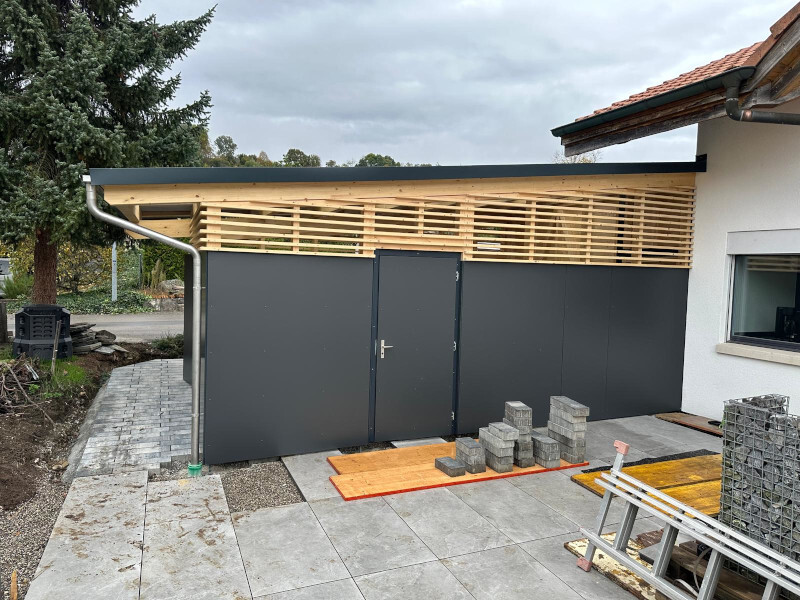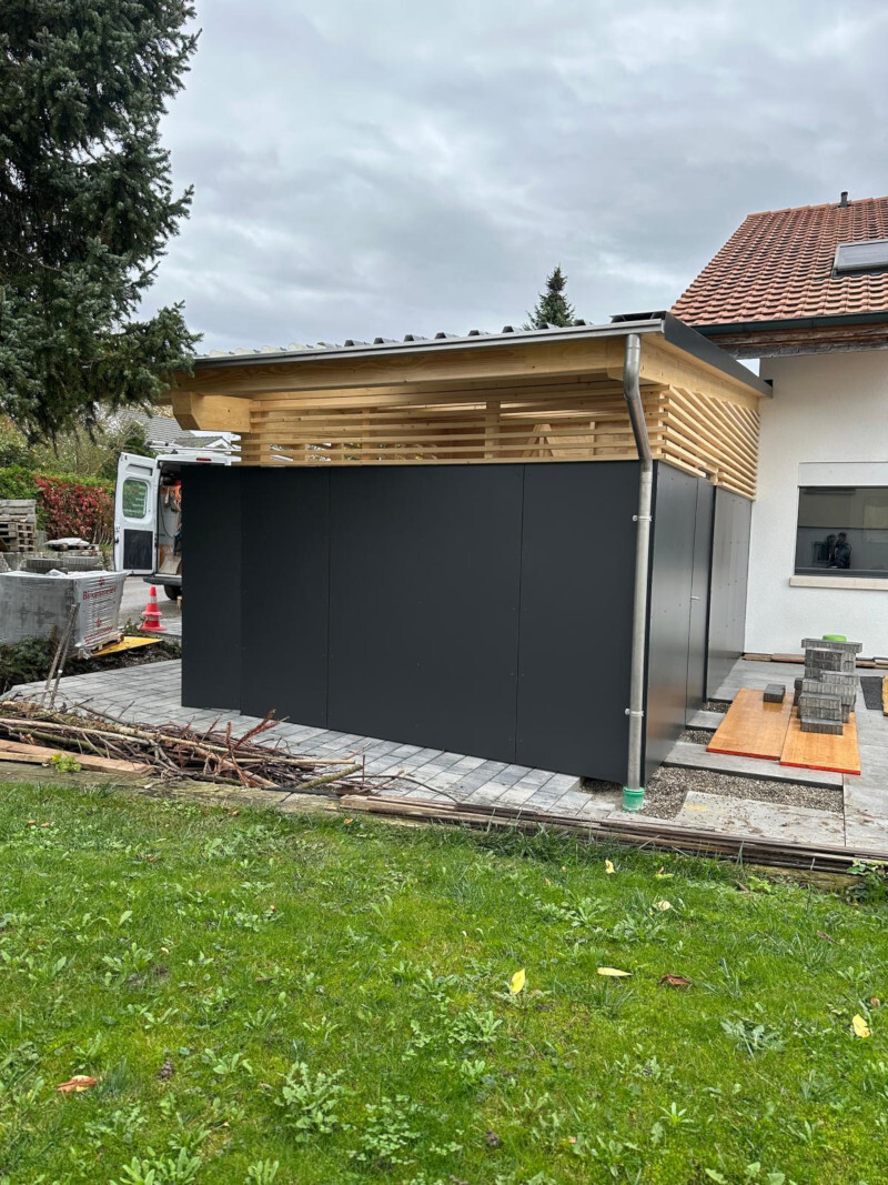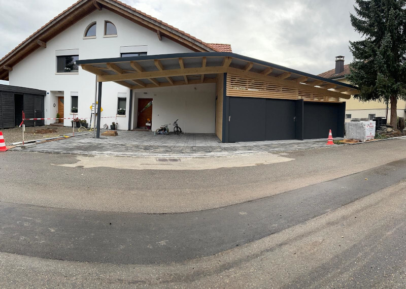 Carport mit Profilblechdach. Lichtfeld im Dach aus Polycarbonat. Regenrinnen aus Chromstahl. Spezial Anfertigung gemäss den Einzuhaltenenden Grenzabständen wie von der Bauverwaltung auferlegt. Carport Nr.C154