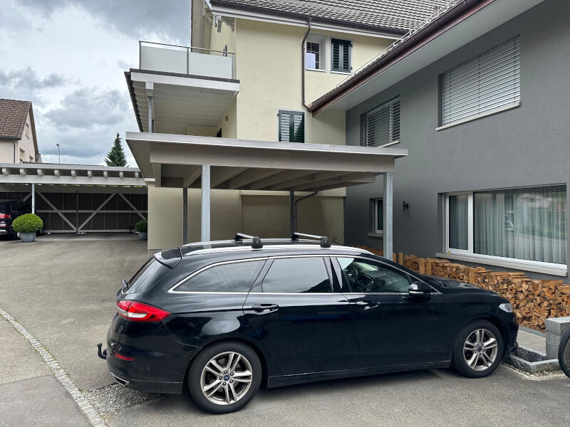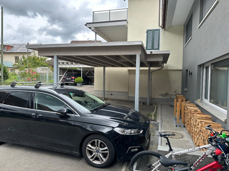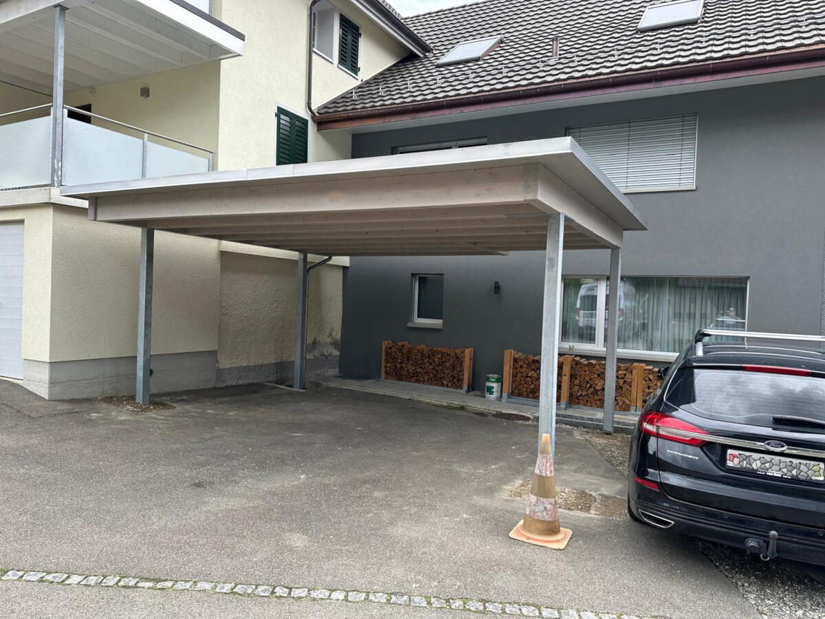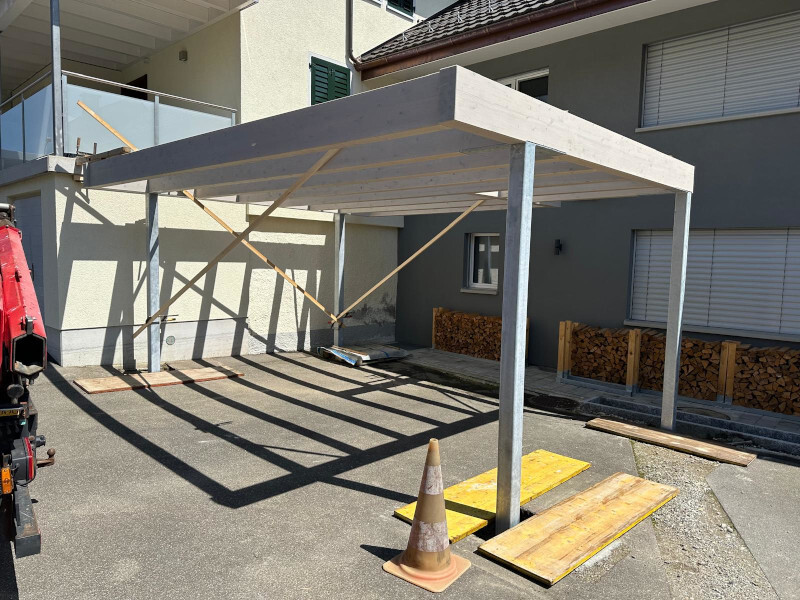 Doppelcarport mit Kiesdach. Abschlussbleche in Chromstahl. Stahlstützen in Betonfundament eingespannt für die Aussteiffung der Konstruktion. Oberflächenbehandlung mit Lasur. Stahlstützen Feuerverzinkt. Nr.C156