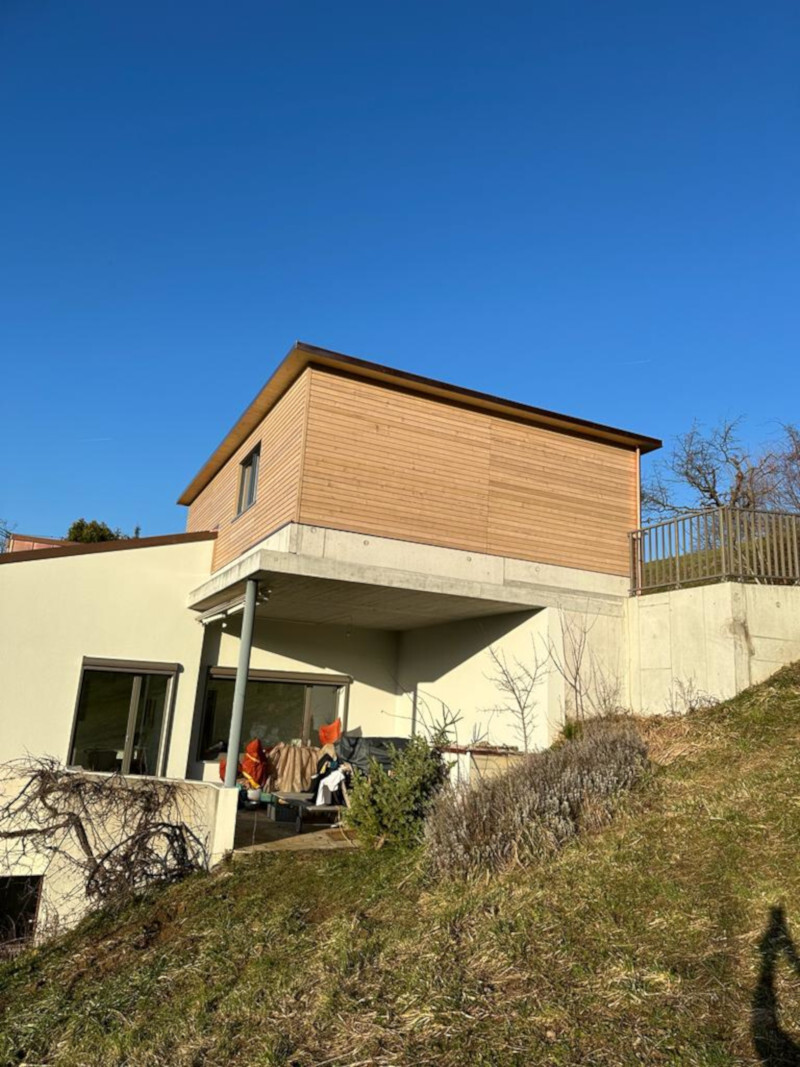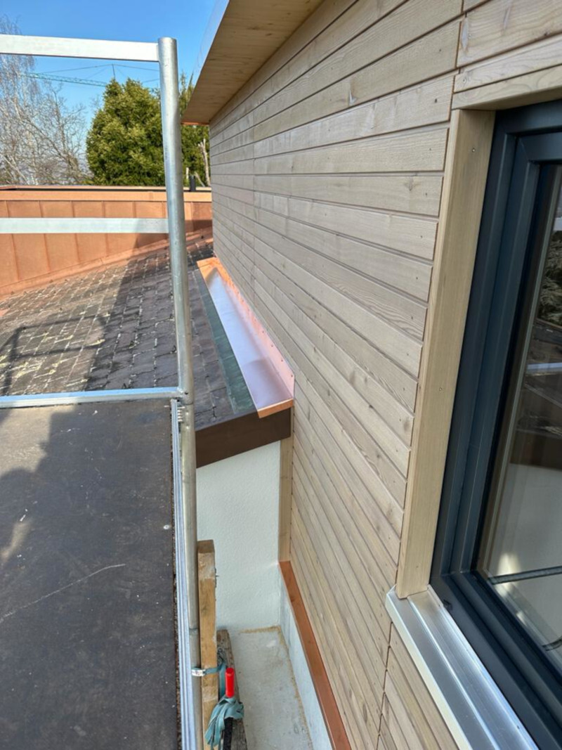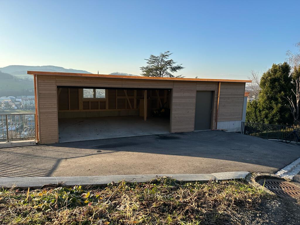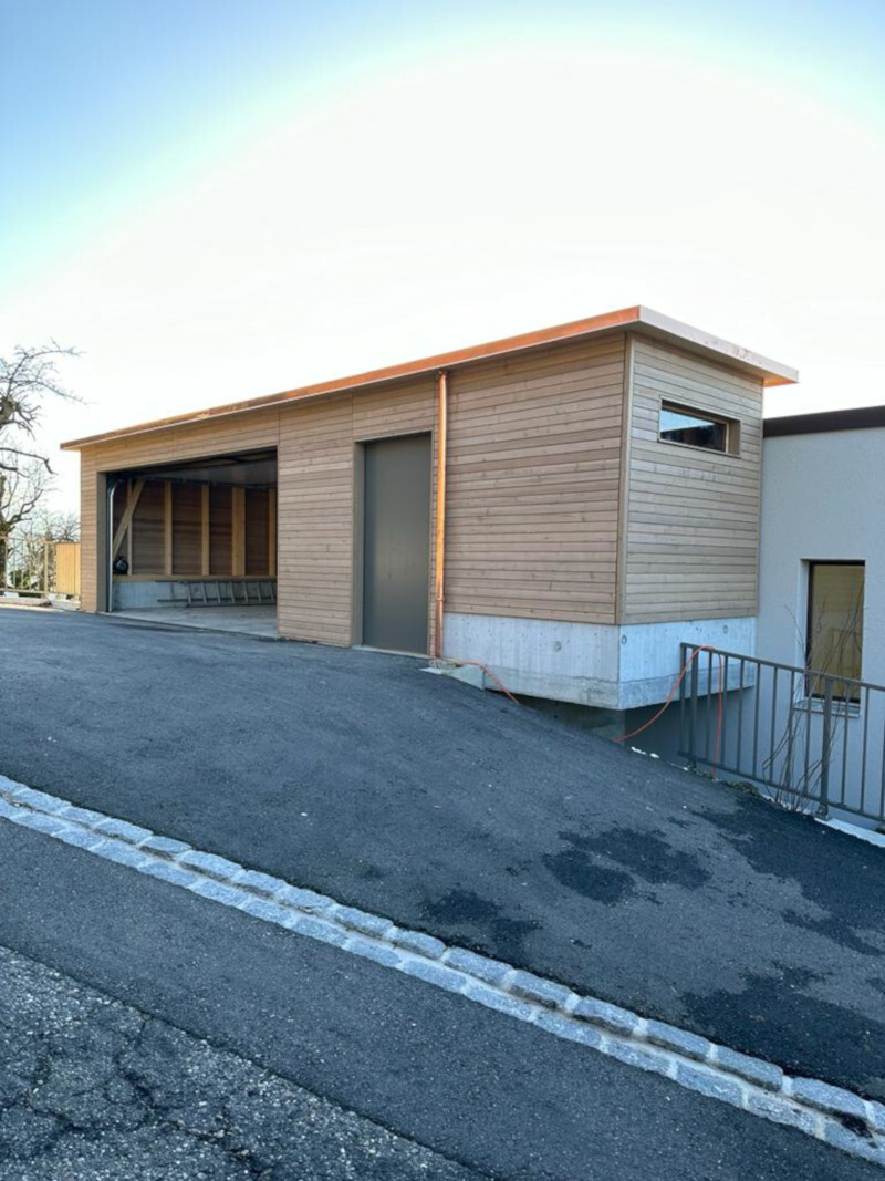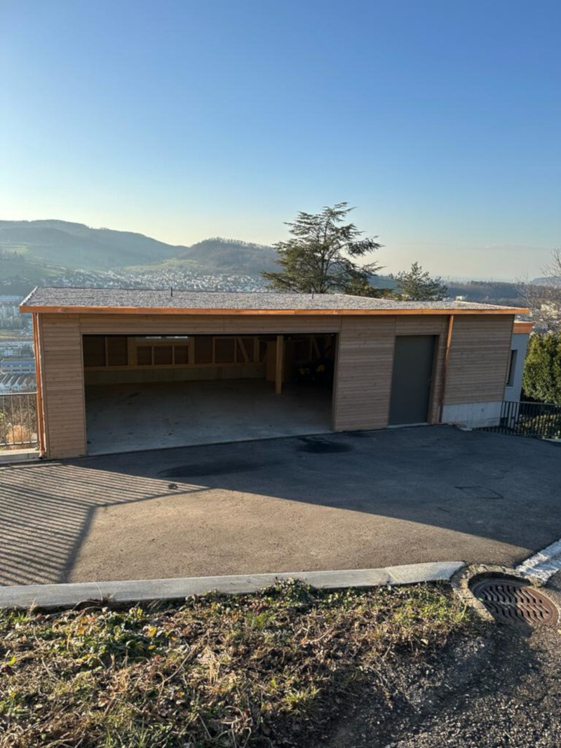 Garage mit Kiesdach. Wandverkleidung mit Lärchenlamellenschalung mit Nut und Kamm. Schiebetüre und Garagentor. Abschlussblech in Kupfer. Farbbehandlung in Lasur. Garage Nr.G49
