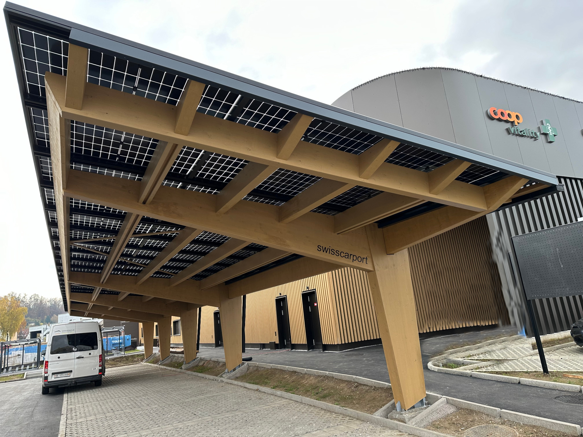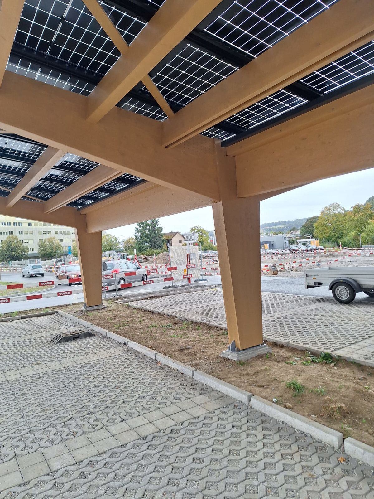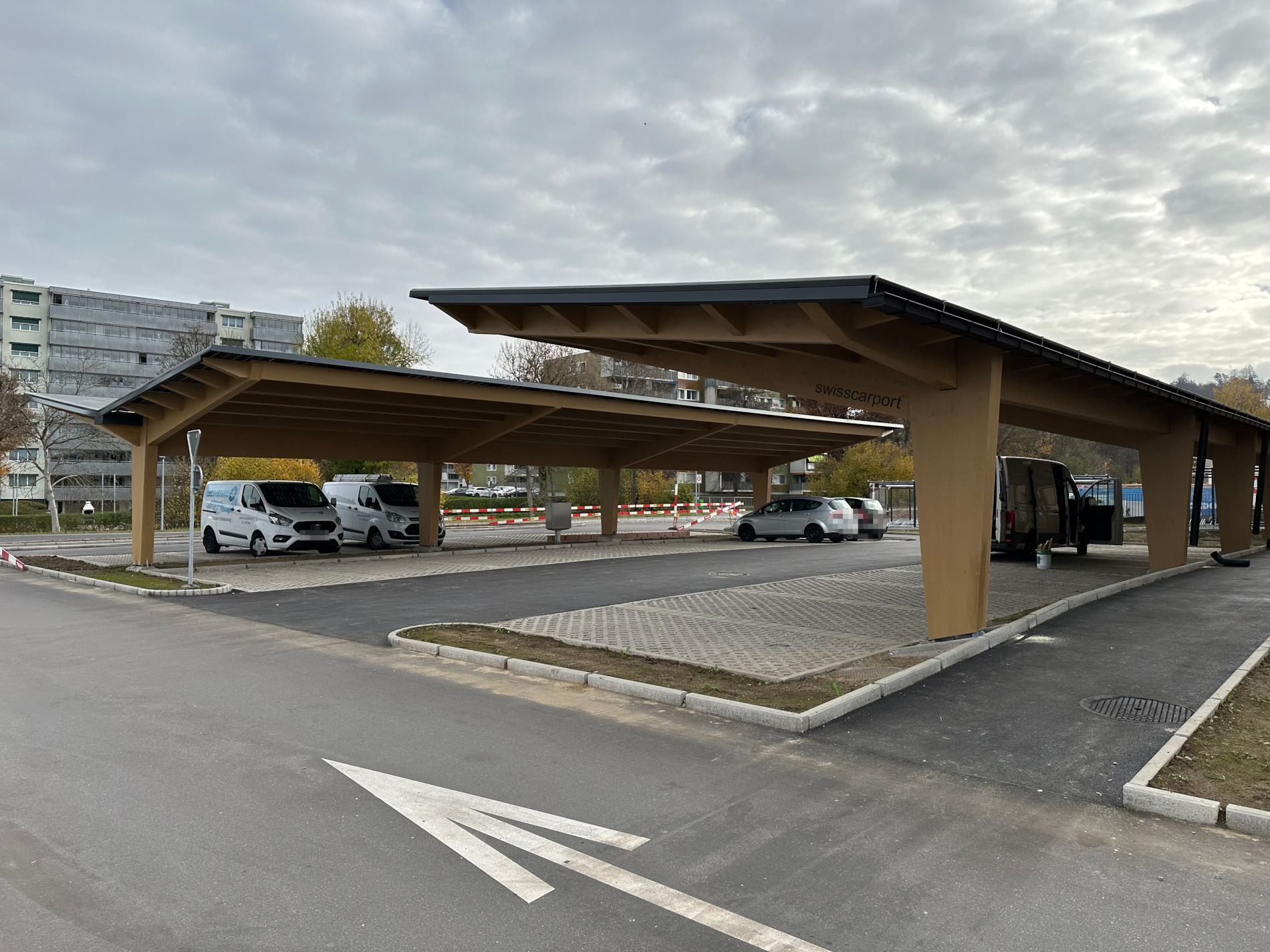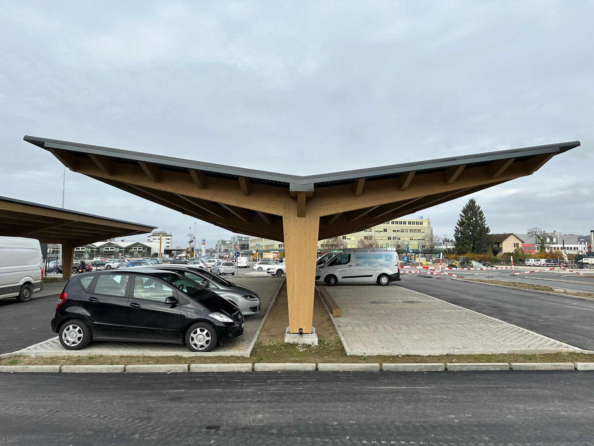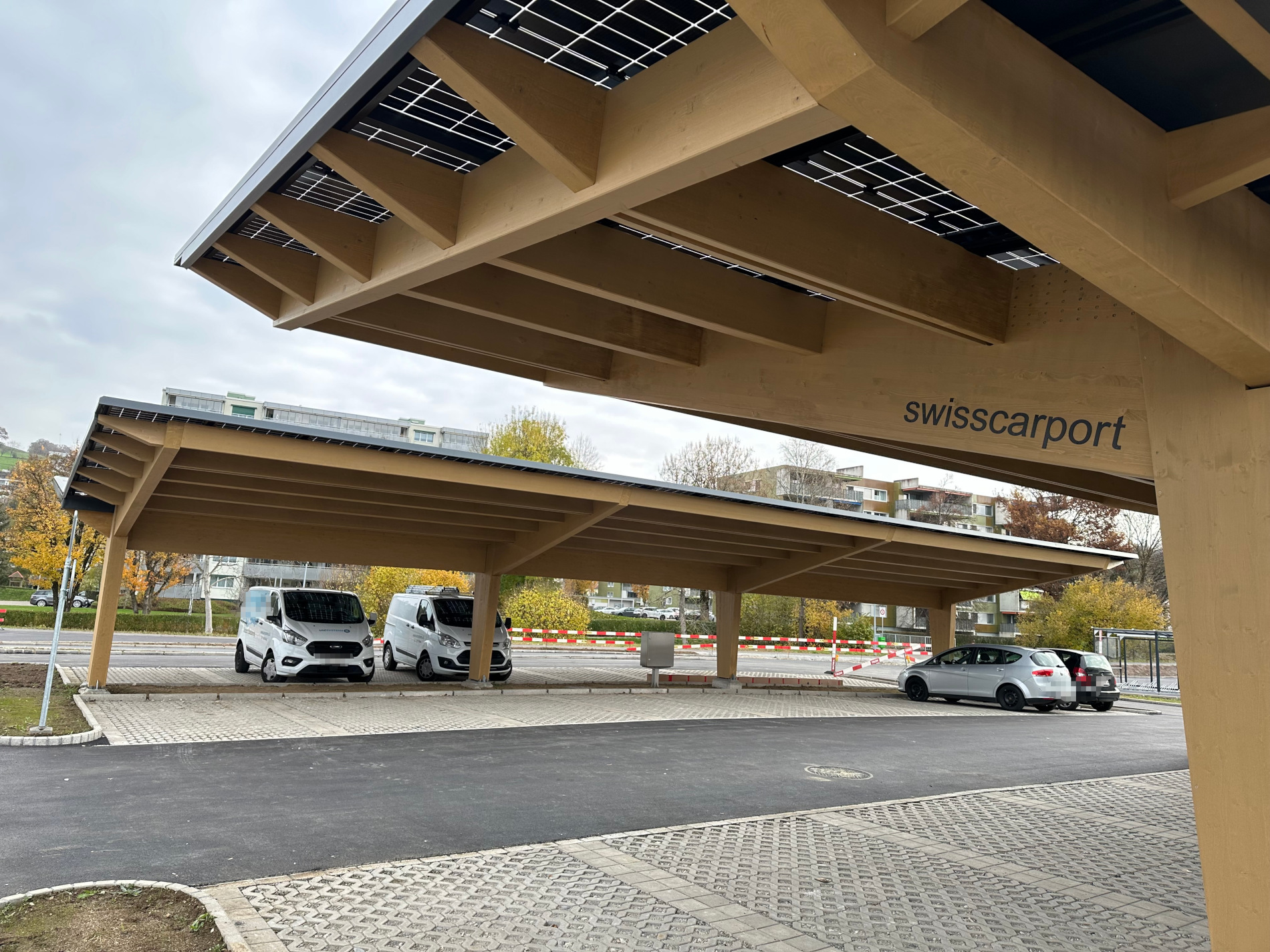 Grossparkplatz Überdachung mit Single-Wing Carport und Double-Wing. Eindeckung mit PV-Indach Modulen, Transluzid. Nr.SO28