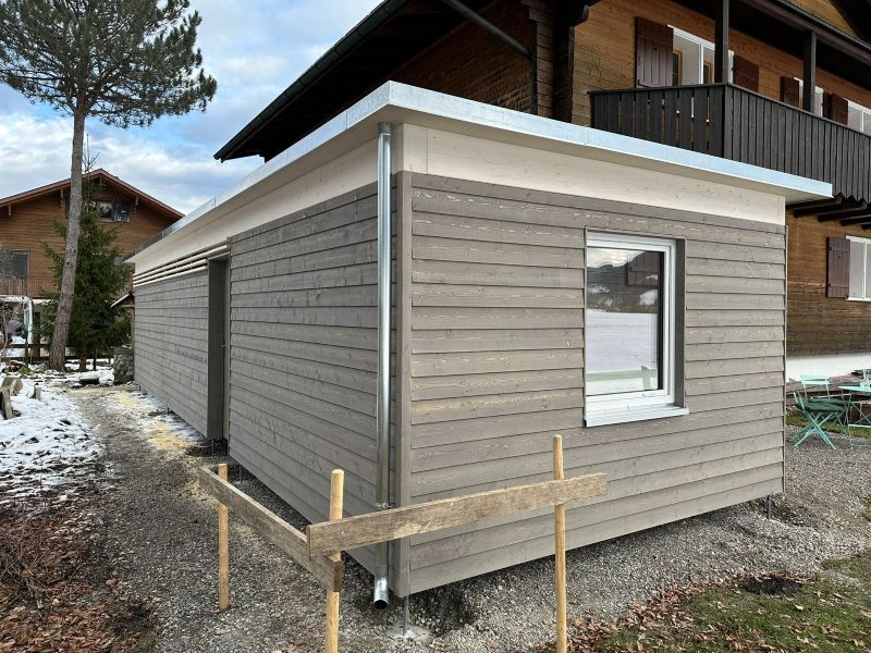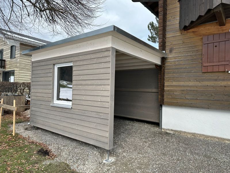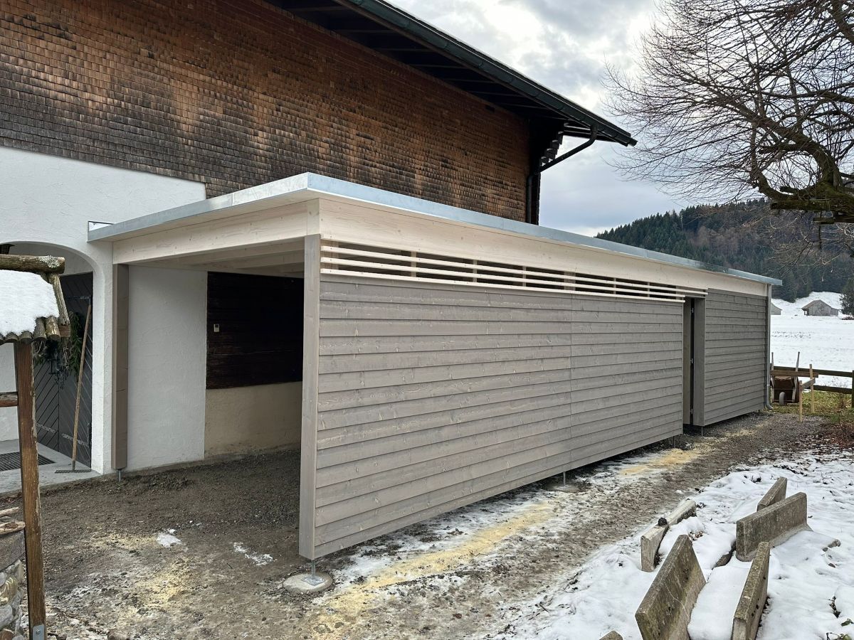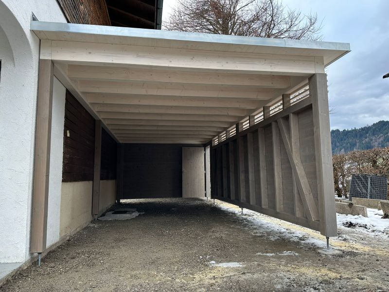 Carport mit Kiesklebedach. Abschlussblech Chromstahl. Seitenwand mit Stülpschalung. Frabbehandlung Basis-Lasur. Nr.C165