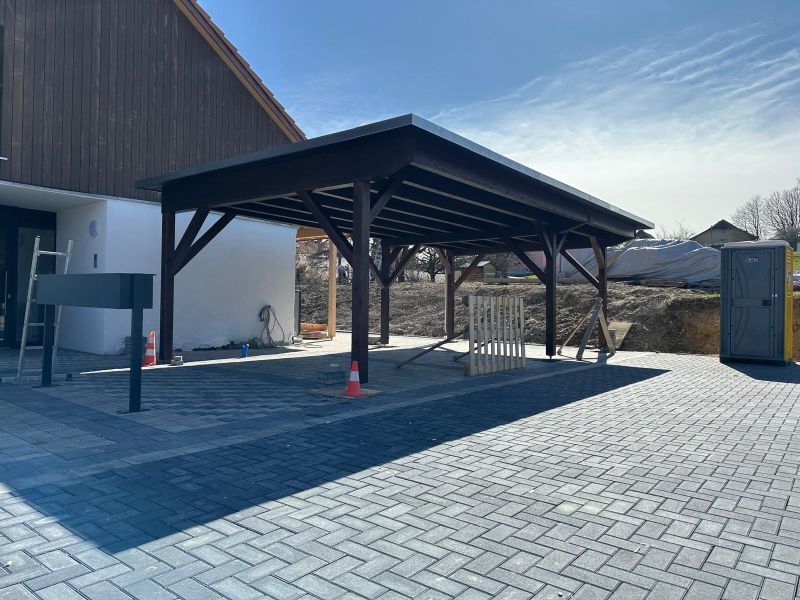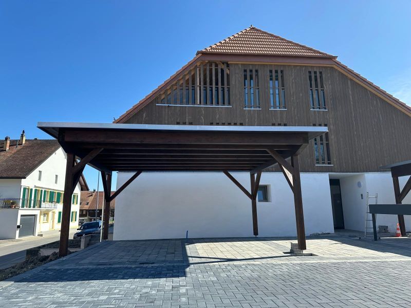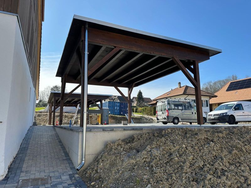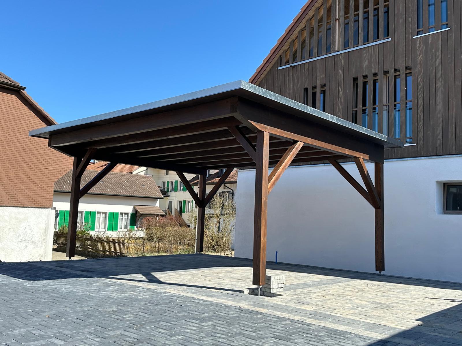 Carports mit Kiesklebedächer bei Mehrfamilienhaus Überbauung. Abschlussblech in Chromstahl. Komplett in Holzbau ausgeführt. Oberflächenbehandlung der Holzkonstruktion mit Basis-Lasur. Nr.C166
