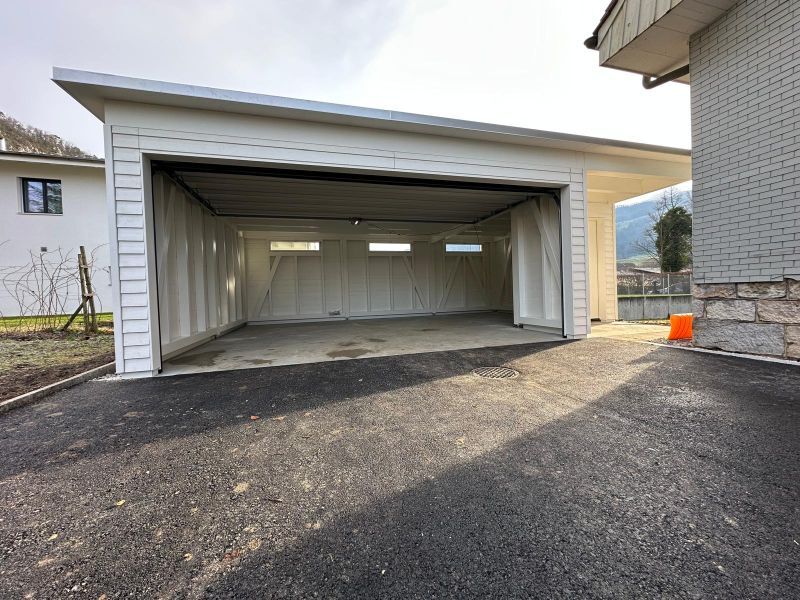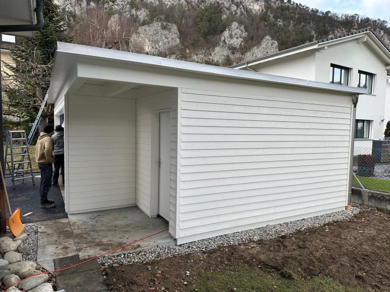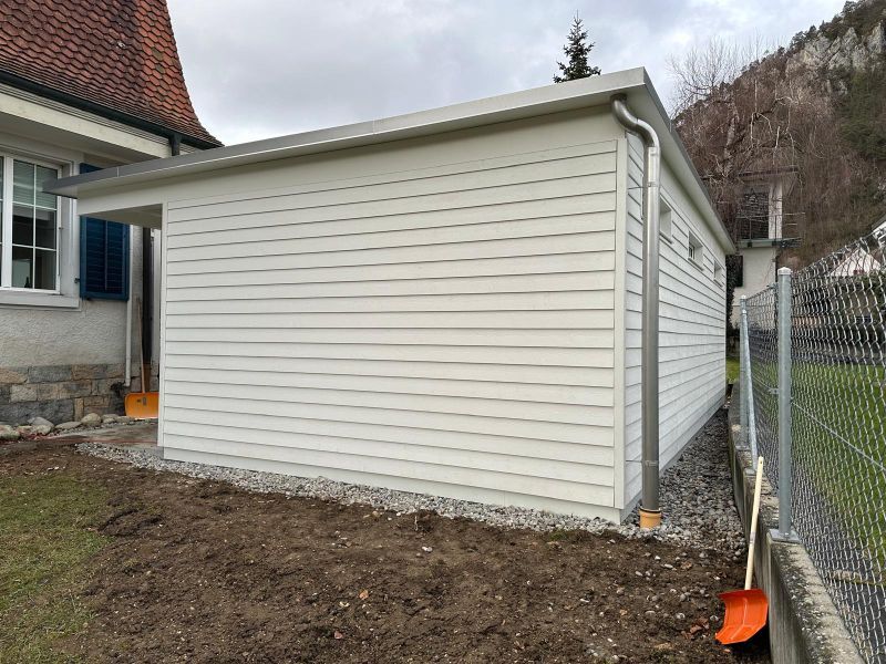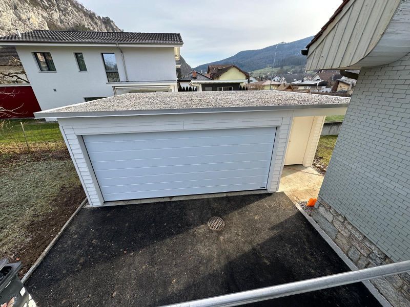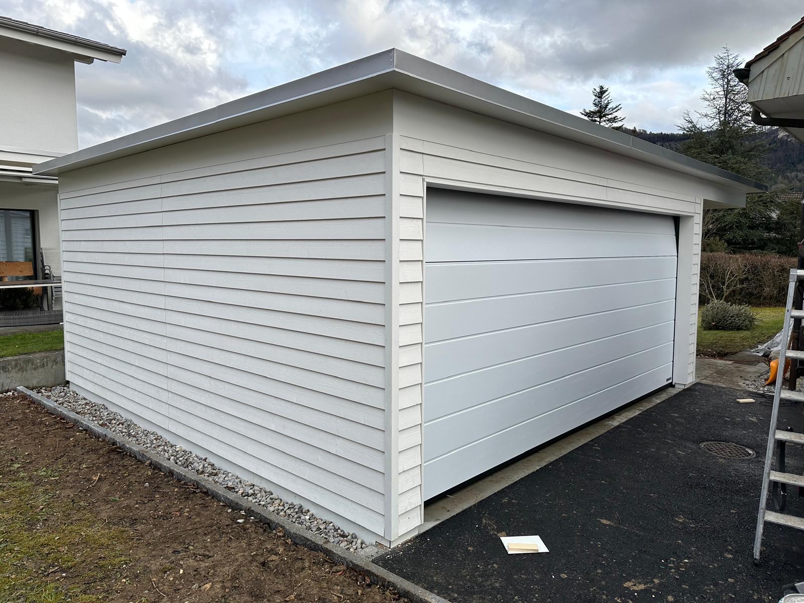 Garage mit Kiesdach. Wandverkleidung mit Stülpschalung. Türe und Garagentor. Farbbehandlung Deckend. Abschlussblech Chromstahl. Garage Nr.G50
